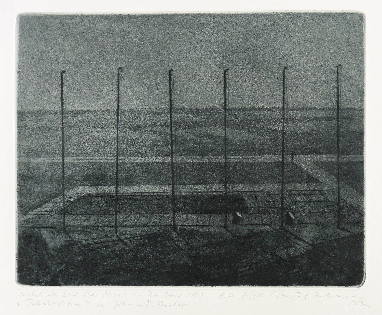 Rechts unten in Bleistift signiert und datiert: ″Manfred Butzmann 1987″. Links Titel und Auflagenbezeichnung. – Zu dem Gedicht ″Porträt-Vision″ von Johannes R. Becher aus dem Band ″Schritt der Jahrhundertmitte″. – Eines von 22 römisch nummerierten Künstlerexemplaren. Die arabisch nummerierte Auflage zählt 20 Exemplare. – Sehr guter Zustand.