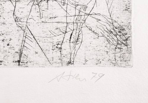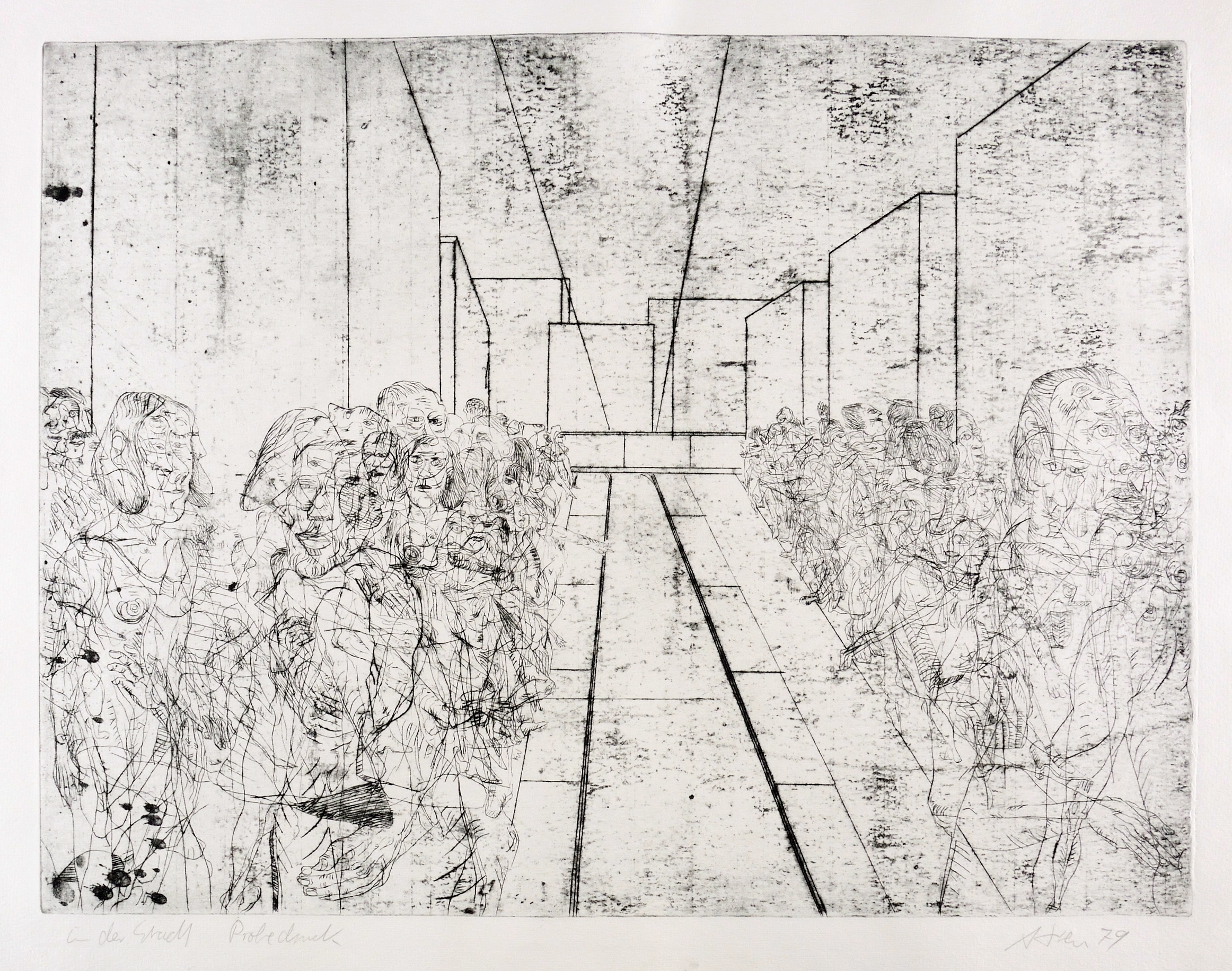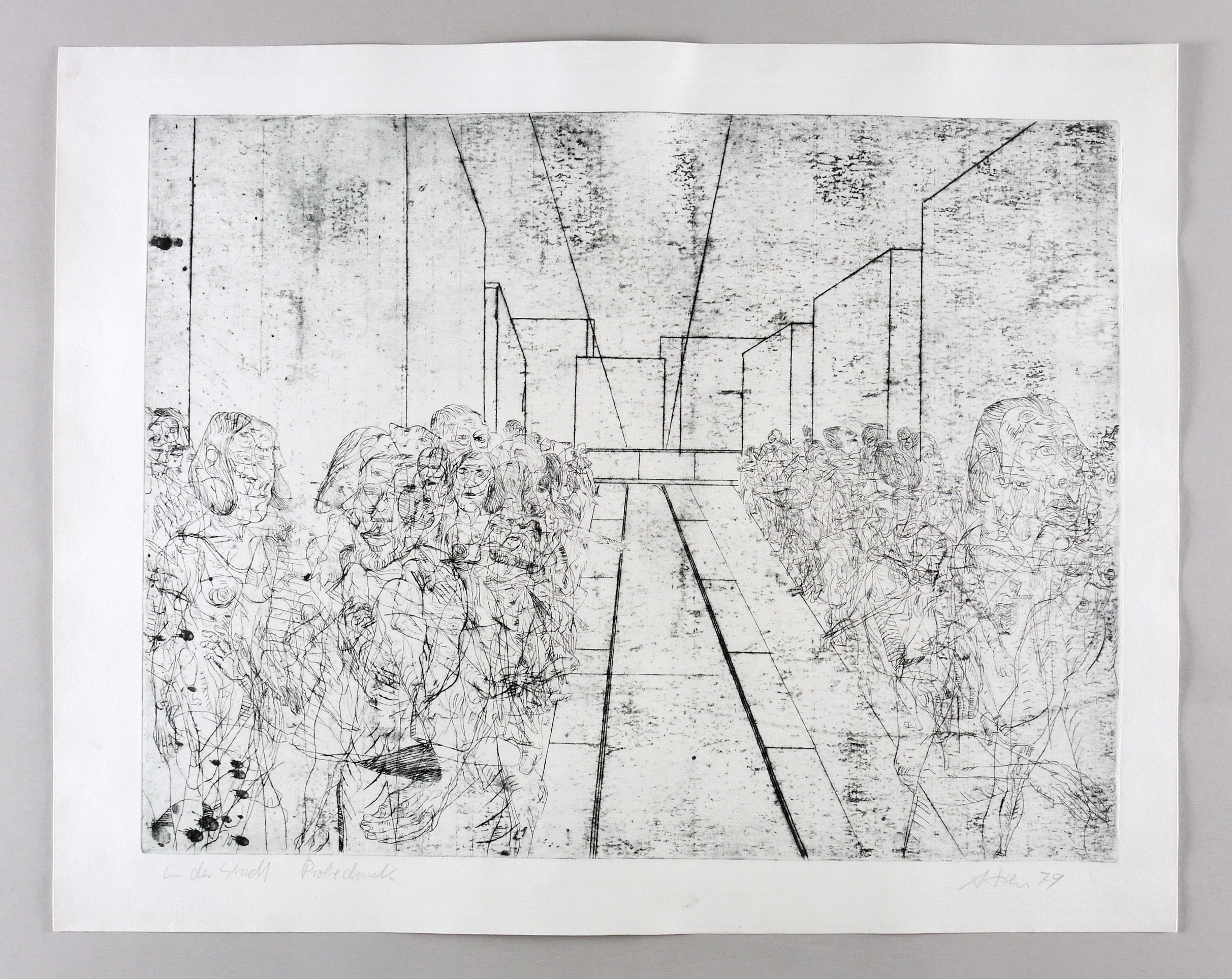 Rechts unten in Bleistift signiert und datiert: ″A. Dress 79″. Links Titel und Auflagenbezeichnung: ″In der Stadt / Probedruck″. – Seltenes Blatt. – Originalrandiges Exemplar. Sehr guter Zustand.