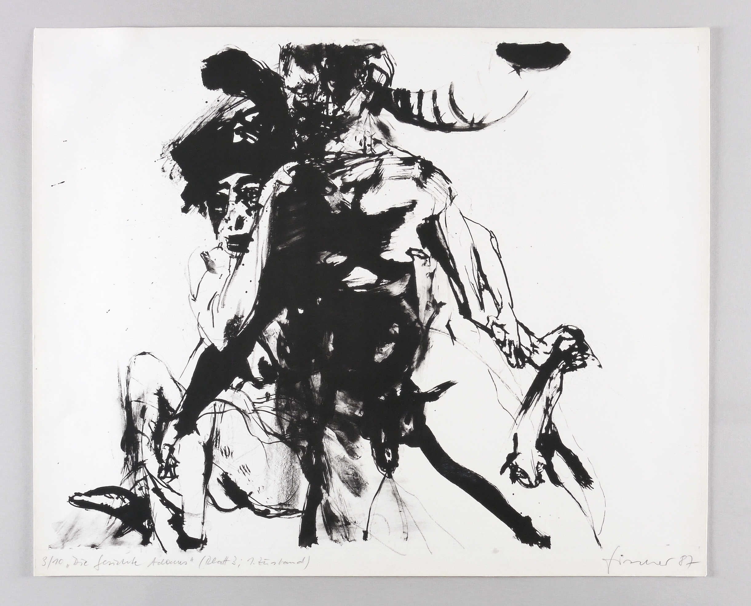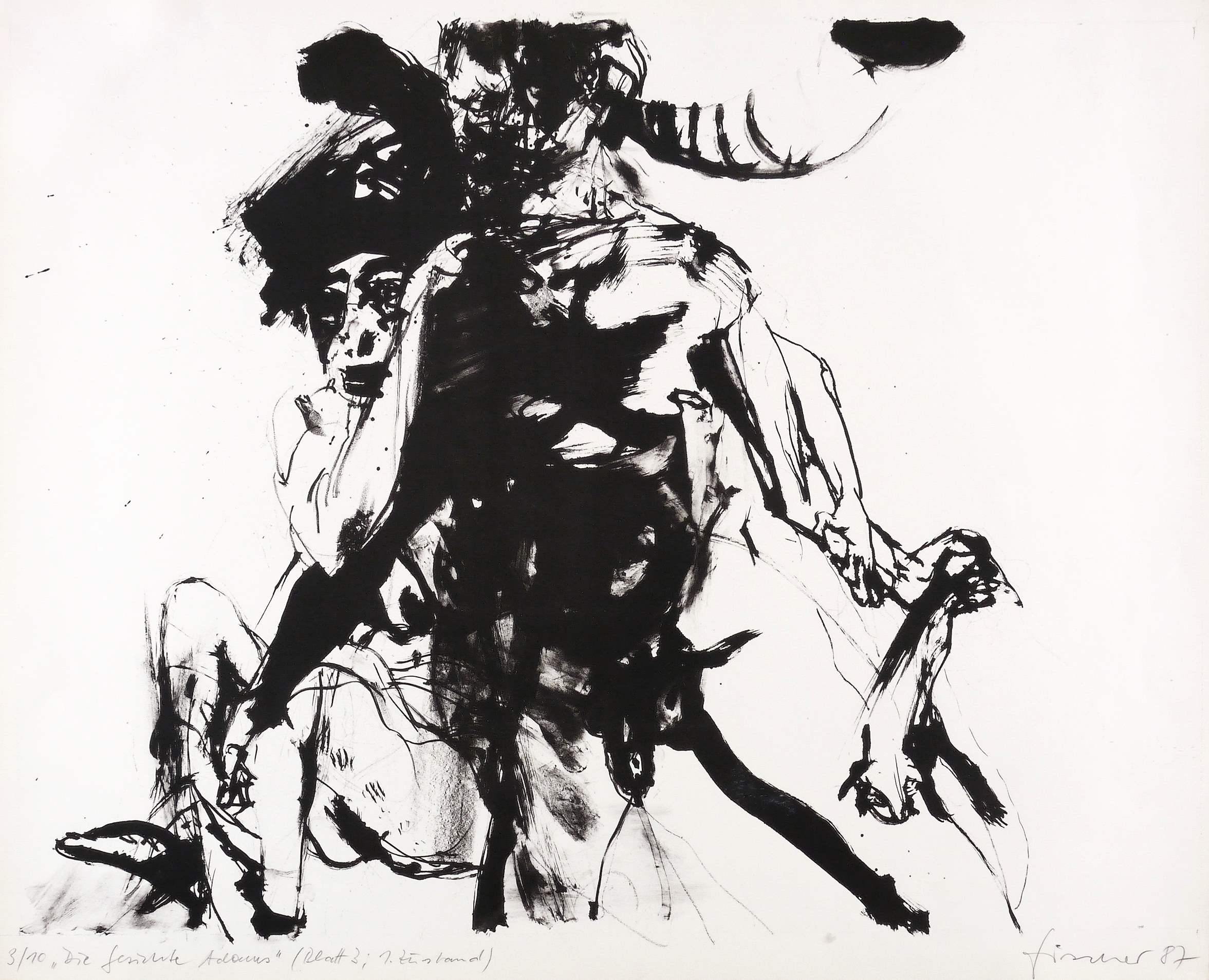 Rechts unten in Bleistift signiert und datiert: ″fischer 87″. Links Auflagenbezeichnung und Titel: ″3/10 / Die Gesichte Adams (Blatt 3, 1. Zustand)″. – Links oben rückseitig ausgedünnter und fachgerecht restaurierte Partie. Sonst tadellos. Mäßig guter Zustand.