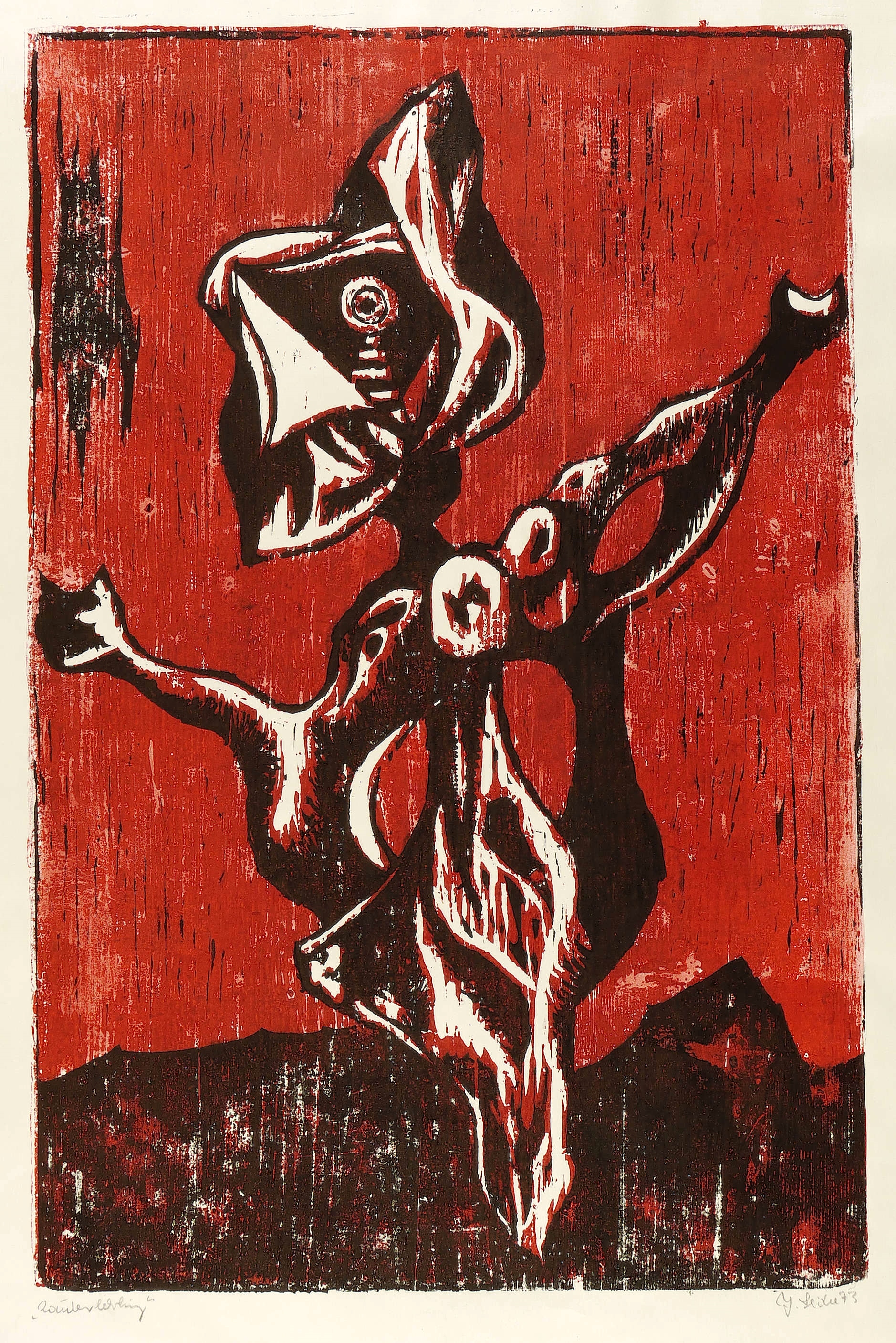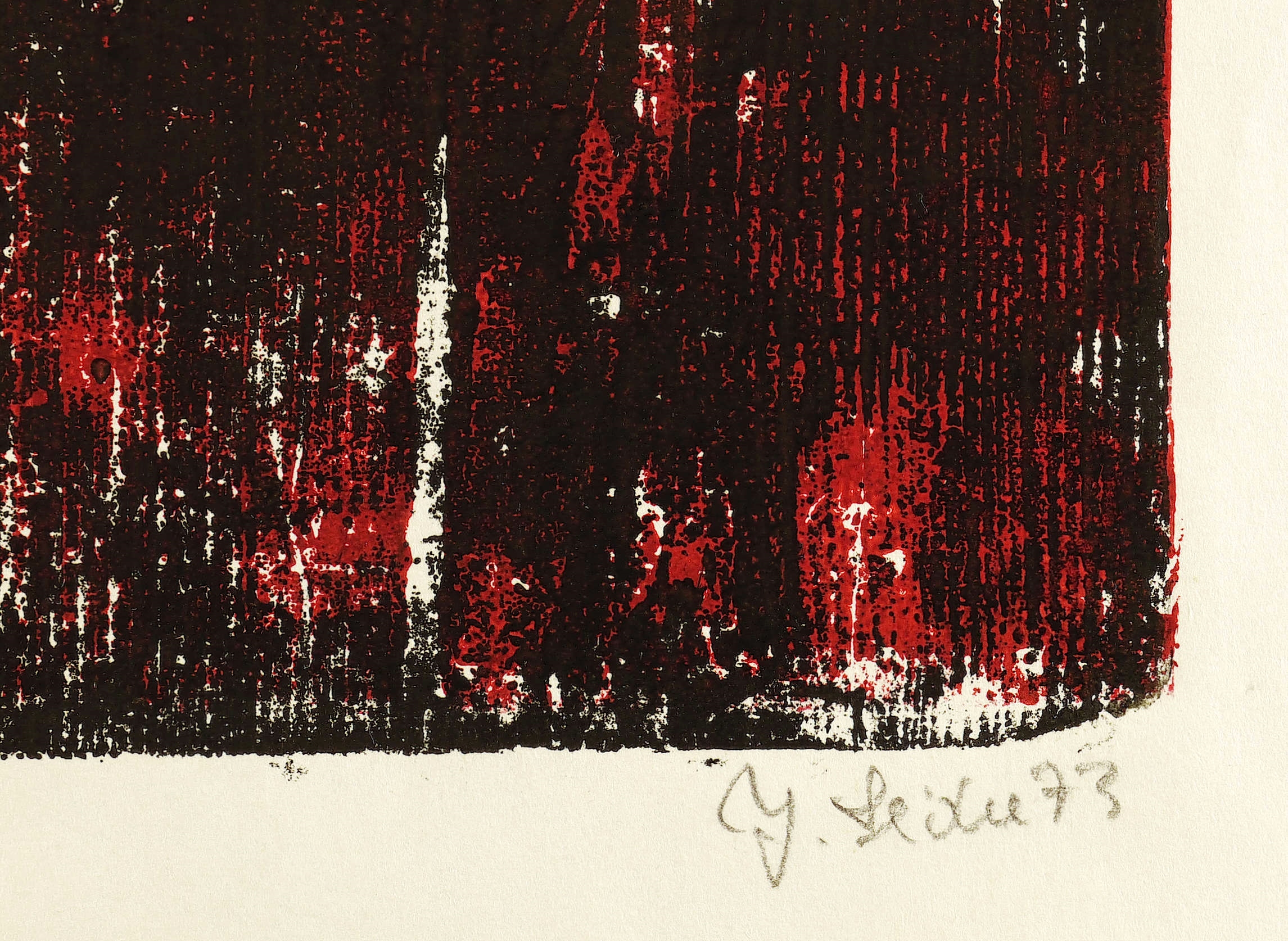 1973. Farbholzschnitt, in Rot & Schwarz, auf hellgelbem Maschinenbütten. – Originale Künstlergrafik, von Jürgen Seidel. – 64,3 x 42,2 cm (Darstellung / Druckstock), 75 x 50 cm (Blatt).