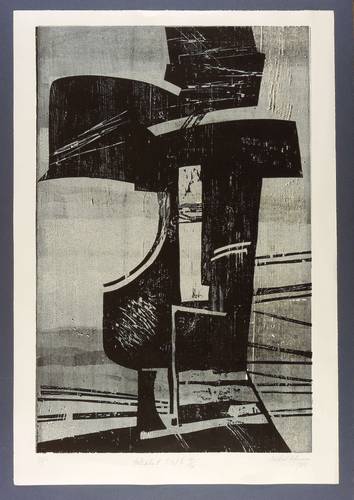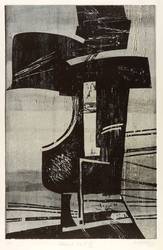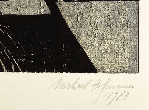 1983. Farbholzschnitt, von 3 Stöcken, in Grau & Schwarz, auf festem hellgelbem Papier. – Originale Künstlergrafik, von Michael Hofmann. – Auflage Exemplar Nr. 17/20. – 74,9 x 48,5 cm (Darstellung / Druckstock), 83 x 57 cm (Blatt).