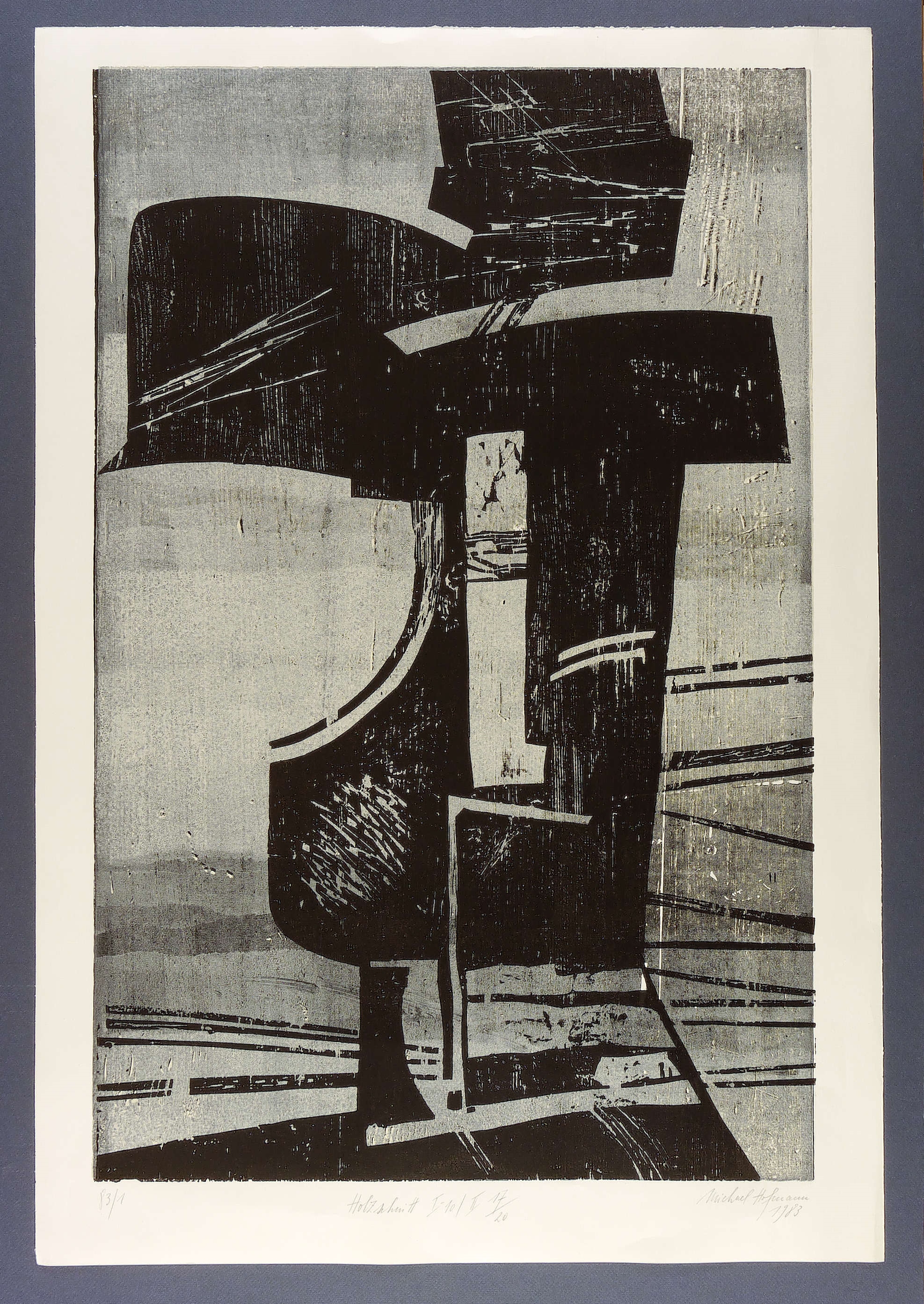 1983. Farbholzschnitt, von 3 Stöcken, in Grau & Schwarz, auf festem hellgelbem Papier. – Von Michael Hofmann. – Auflage Exemplar Nr. 17/20. – 74,9 x 48,5 cm (Darstellung / Druckstock), 83 x 57 cm (Blatt).