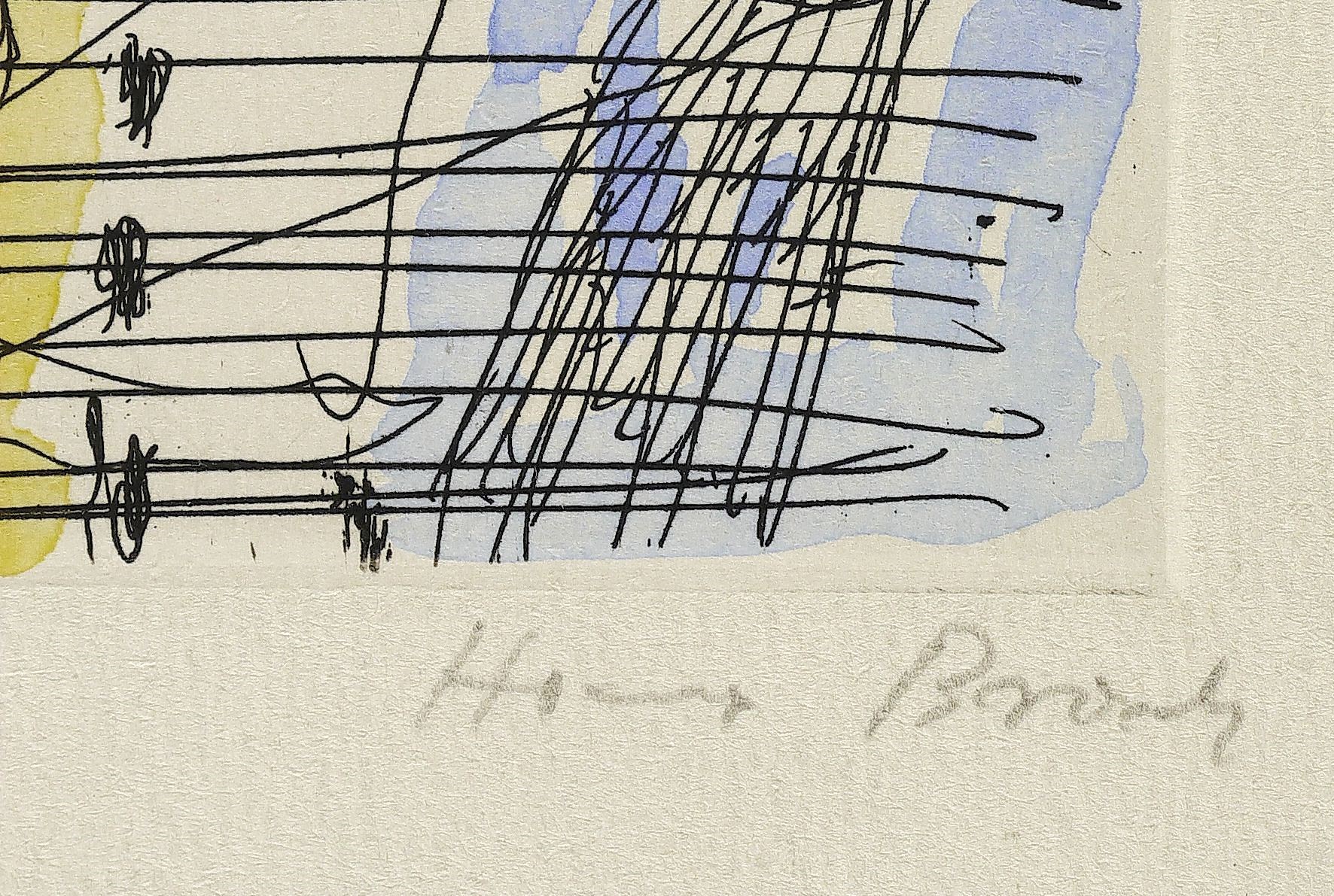 Um 1980. Radierung / Strichätzung, in Schwarz, aquarelliert, auf Bütten. – Originale Künstlergrafik, von Hans Brosch. – Auflage Exemplar Nr. 4/14. – 12,6 x 7,4 cm (Darstellung / Platte), 21 x 11 cm (Blatt).