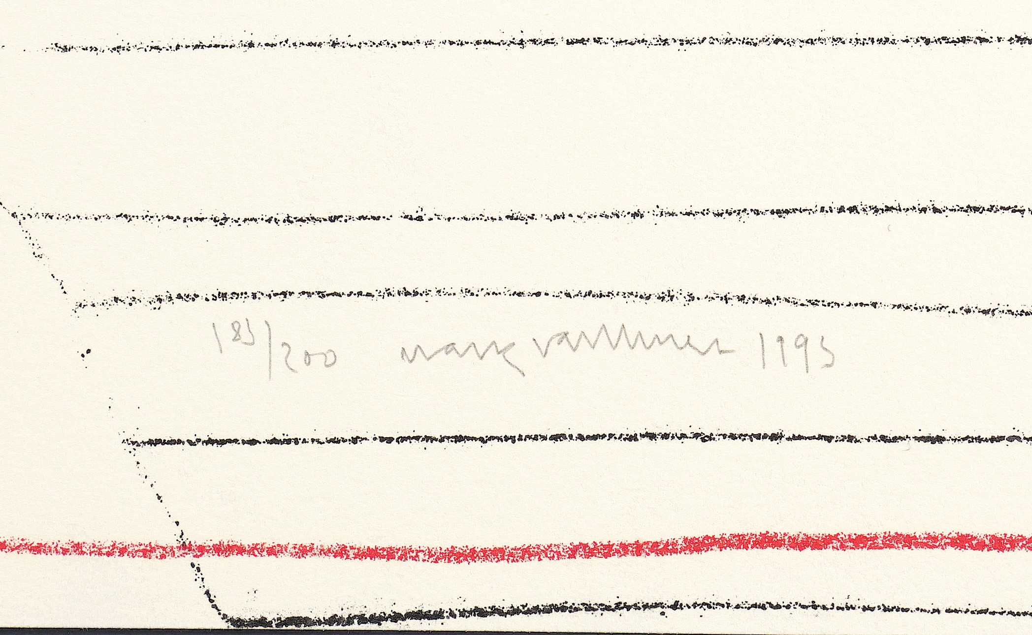 1993. Farbsiebdruck / Farbserigrafie, in Rot & Schwarz, auf hellem Karton. – Originale Künstlergrafik, von Mark Lammert. – Auflage Exemplar Nr. 183/200. – 51,0 x 42,0 cm (Darstellung / Blatt).