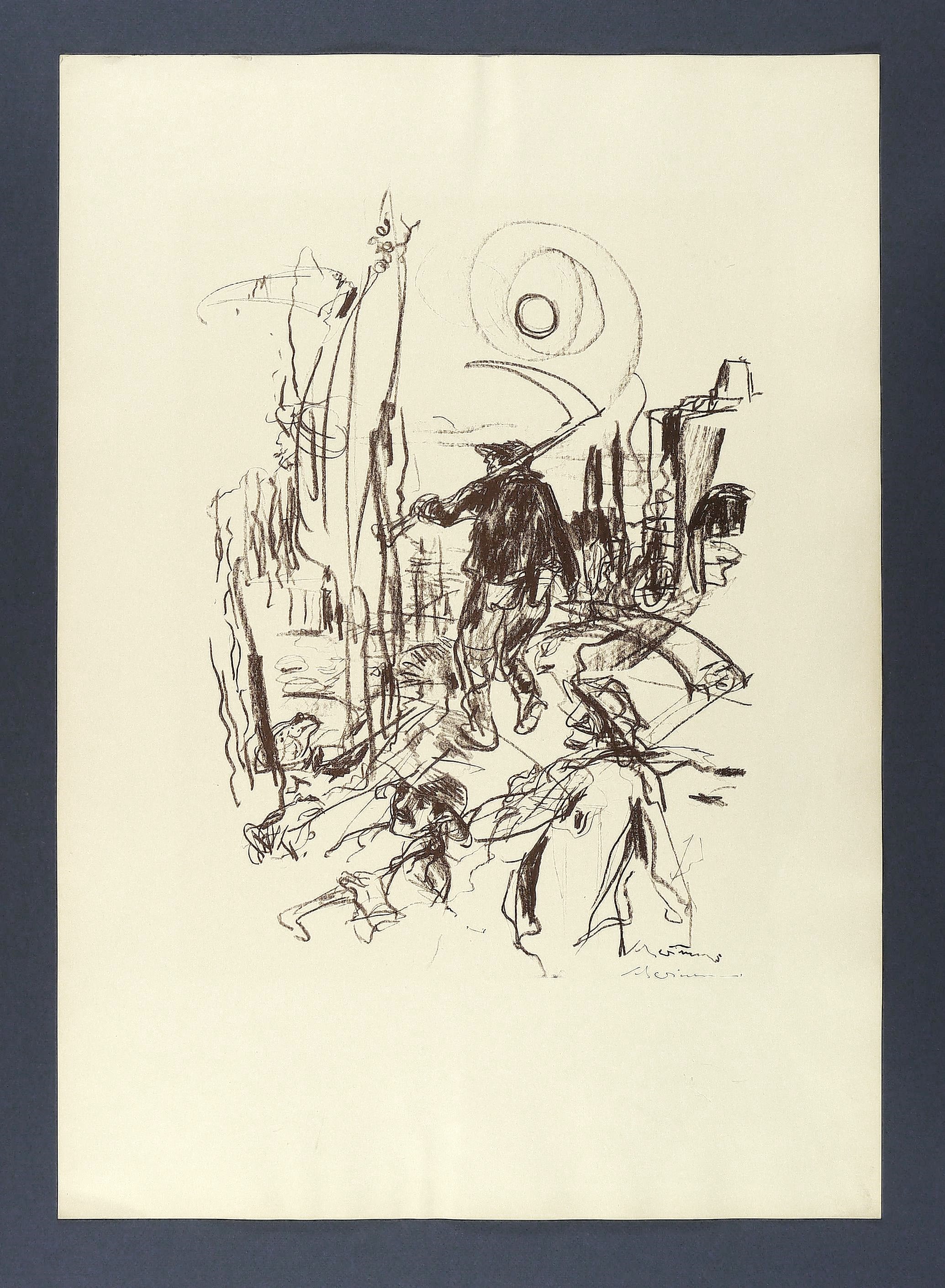 1957. Lithografie / Kreidelithografie, in Dunkelbraun, auf hellchamois Velin. – Originale Künstlergrafik, von Max Schwimmer. – 41,0 x 28,5 cm (Darstellung), 60 x 42 cm (Blatt).