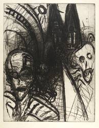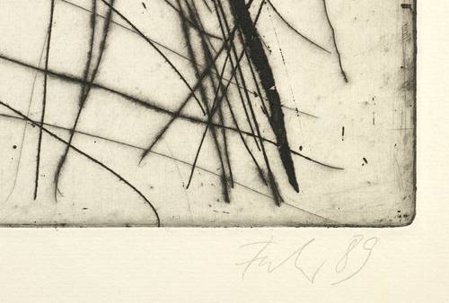 1989. Radierung / Strichätzung & Aquatinta, in Schwarz, auf gelblichem Maschinenbütten. – Originale Künstlergrafik, von Ellen Fuhr. – Künstlerexemplar (e.a.). – 64,0 x 49,6 cm (Darstellung / Platte), 73,5 x 59,5 cm (Blatt).