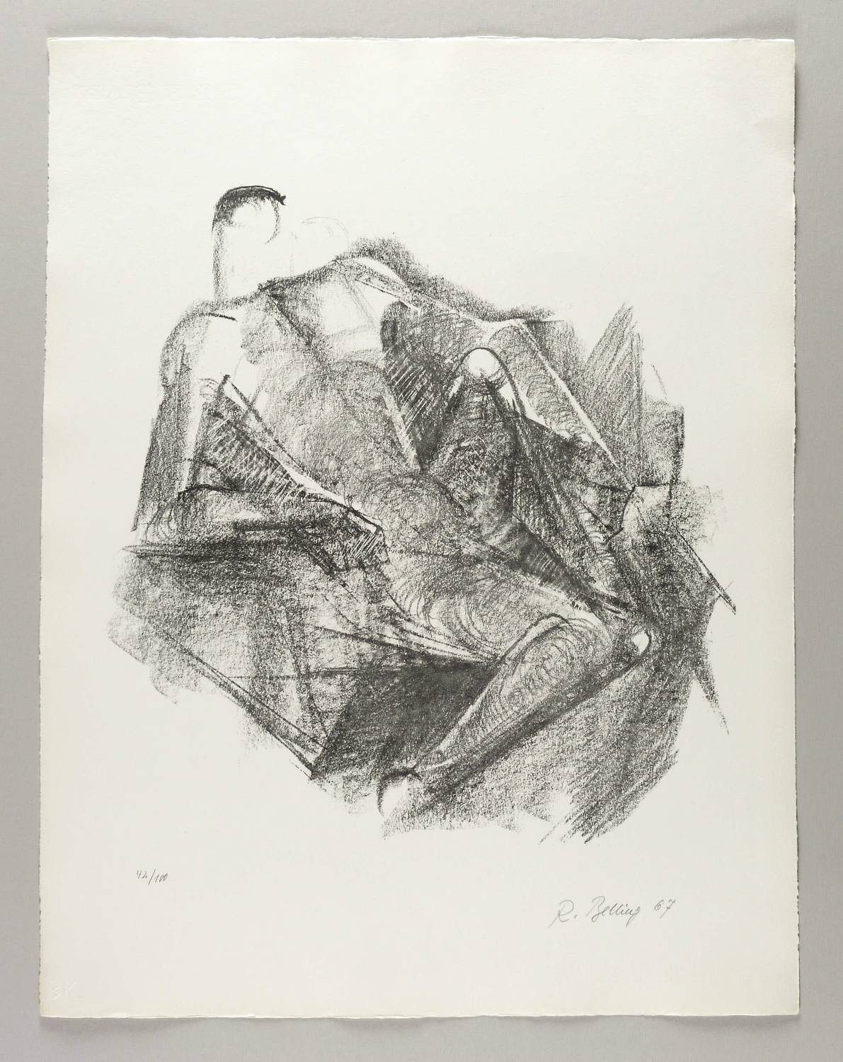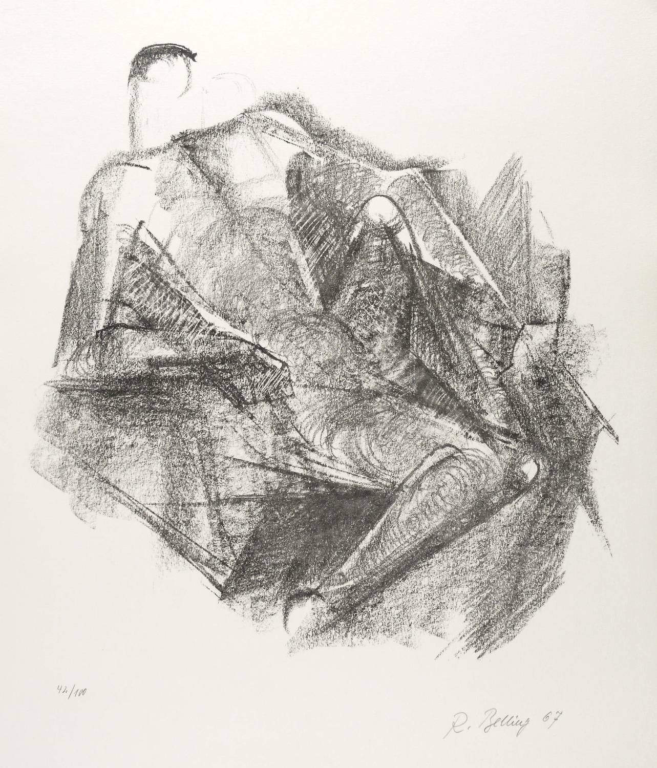 1967. Lithografie / Kreidelithografie, parteill geschabt, in Schwarz, auf hellgelbem BFK-Rives-Bütten. – Originale Künstlergrafik, von Rudolf Belling. – Auflage Exemplar Nr. 42/100. – 44,1 x 42,0 cm (Darstellung / Druckbild), 65 x 51 cm (Blatt).