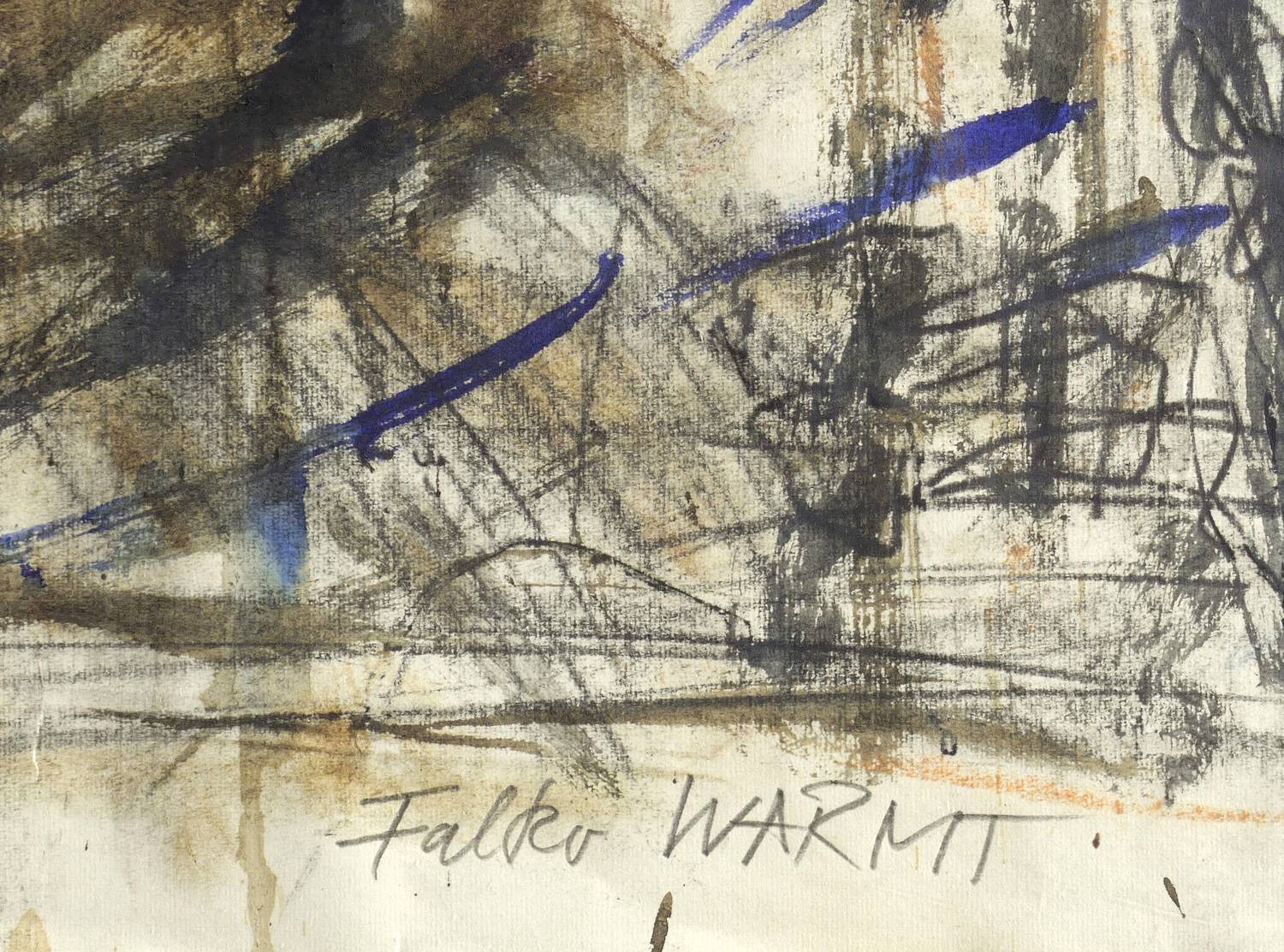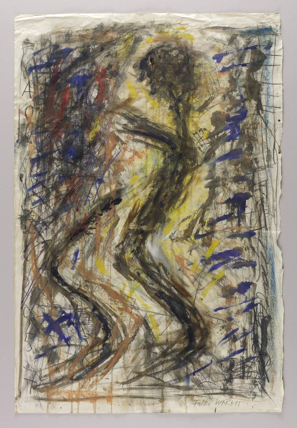 Rechts unten in Graphit signiert: ″Falko WARMT″. Am linken Rand großflächig vertikal bezeichnet ″A002095″. Verso bezeichnet: ″F.W. / 1495″. – Verso naiver Frauenakt in Graphit. – Papier etwas knickspurig, die Ecken stärker bestoßen. Mäßig gut erhaltenes Exemplar.