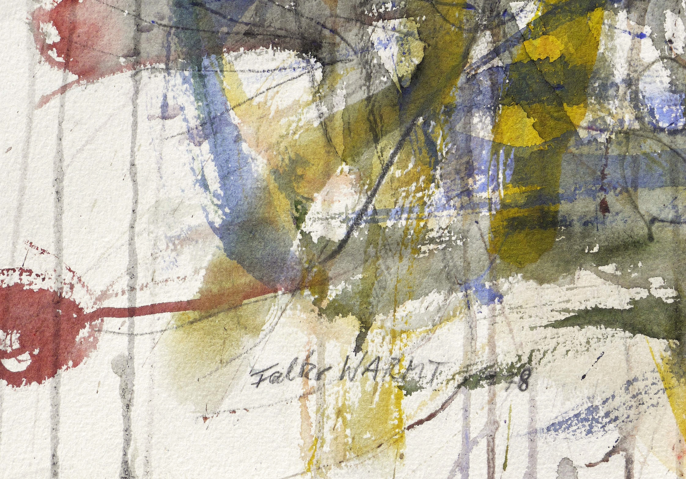 Links unten in Graphit signiert und datiert: ″Falko WARMT 78″. Verso bezeichnet: ″F.W. / 1403″. – Verso naiver Frauenakt in Graphit. – Rand original umlaufend mit braunem Papierstreifen abgeklebt. Sehr gut erhaltenes Exemplar. Sehr guter Zustand.