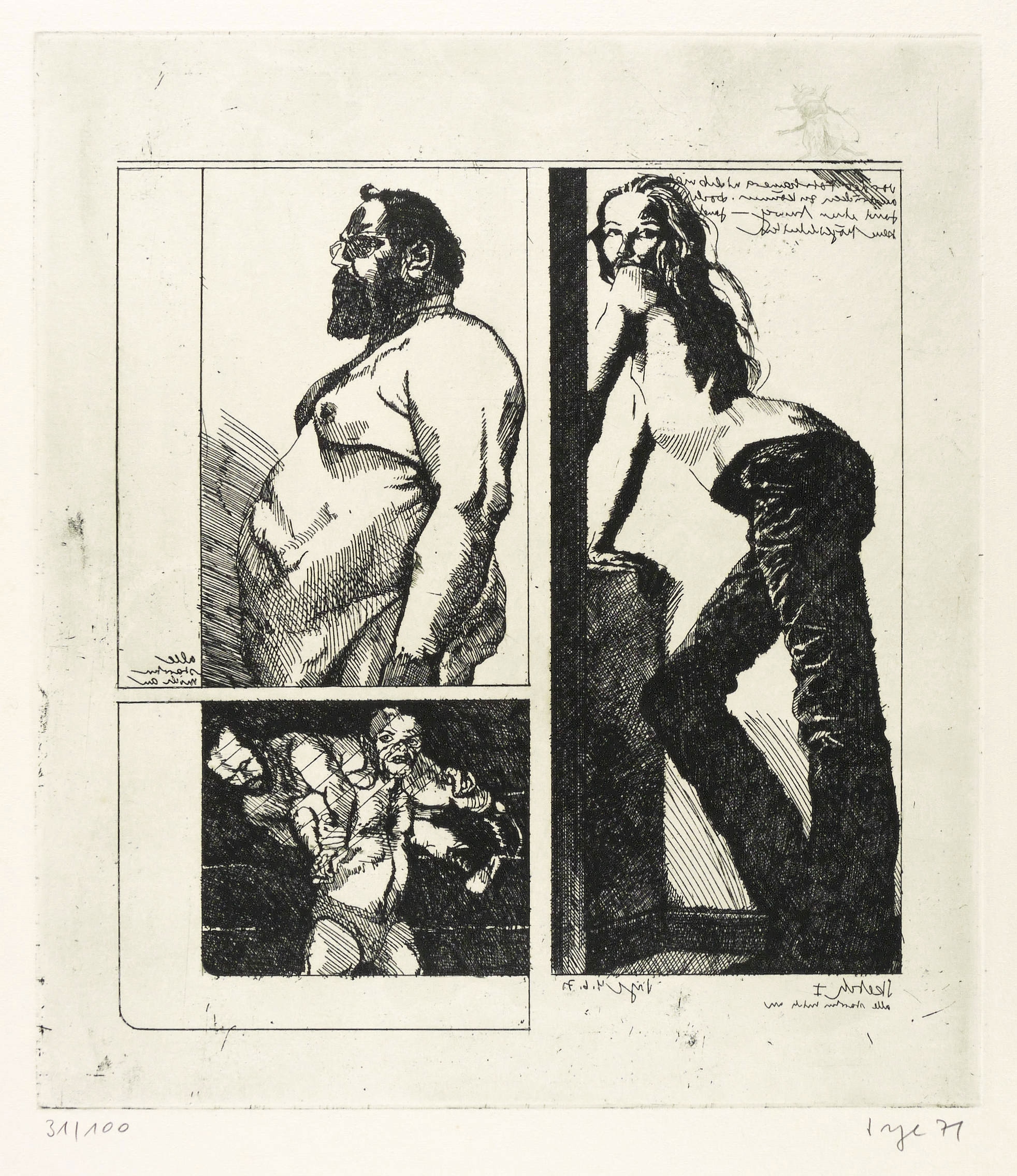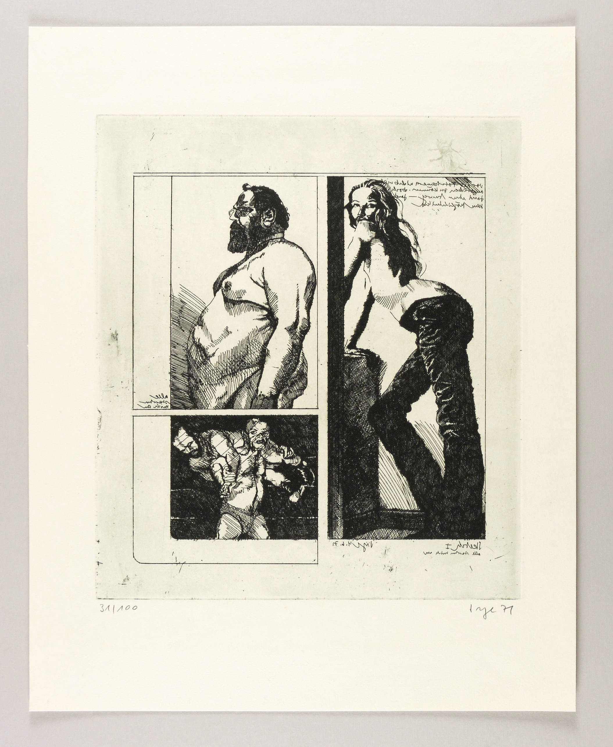 1971. Radierung / Strichätzung, in Schwarz, auf hartem gelbem Velin. – Von Peter Sorge. – Auflage Exemplar Nr. 31/100. – 39,5 x 34,7 cm (Darstellung / Platte), 56 x 45 cm (Blatt).