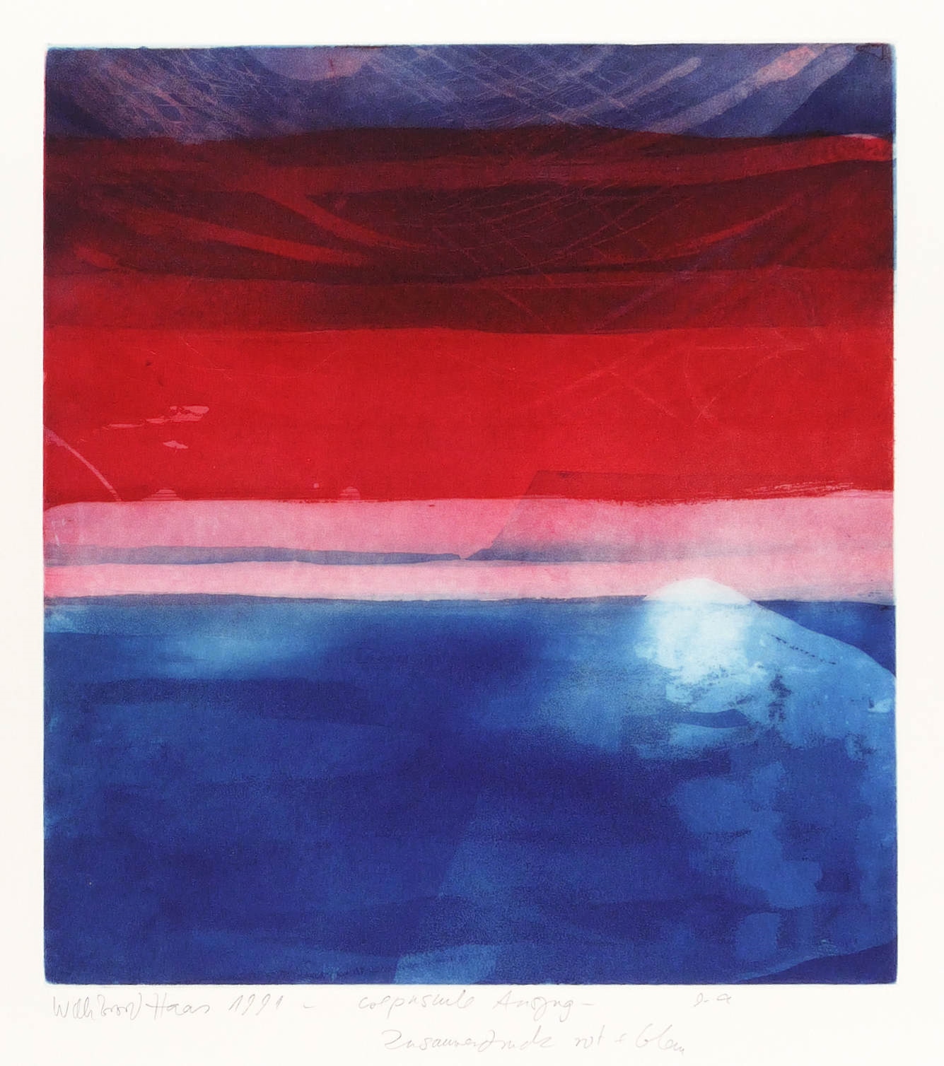 Links unten in Bleistift signiert und datiert: ″Willibrord Haas 1991″. Rechts Auflagenbezeichnung. Mittig Titel: ″crépuscule - Auszug - Zusammendruck rot + blau″. – Ohne Mängel. Tadellos erhalten.