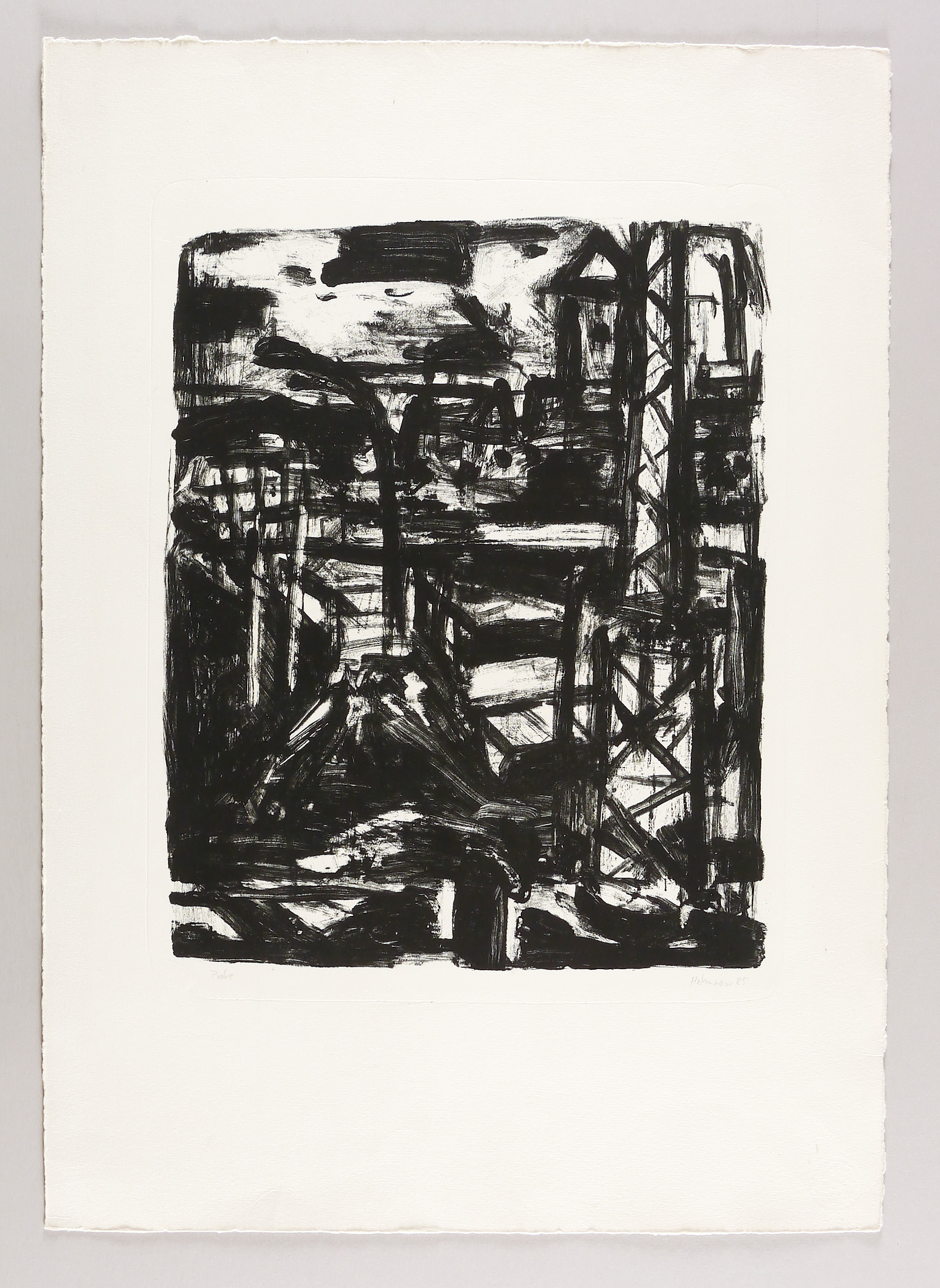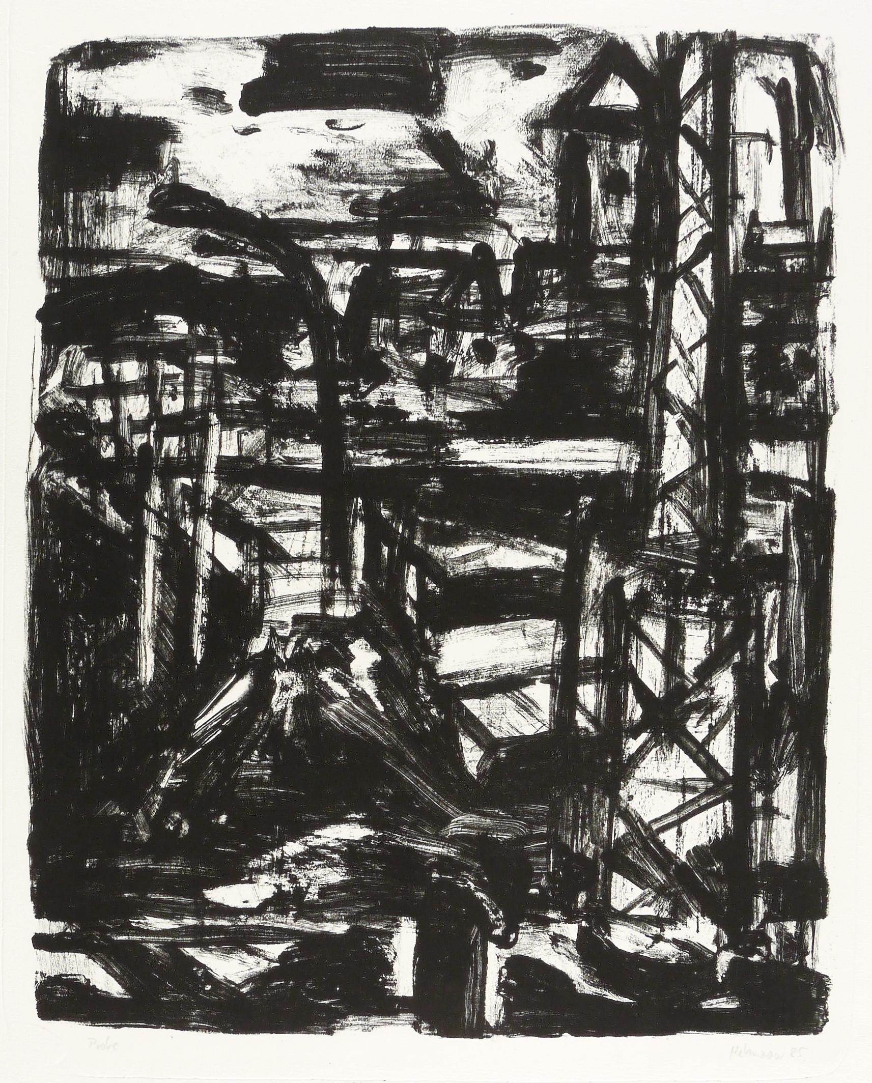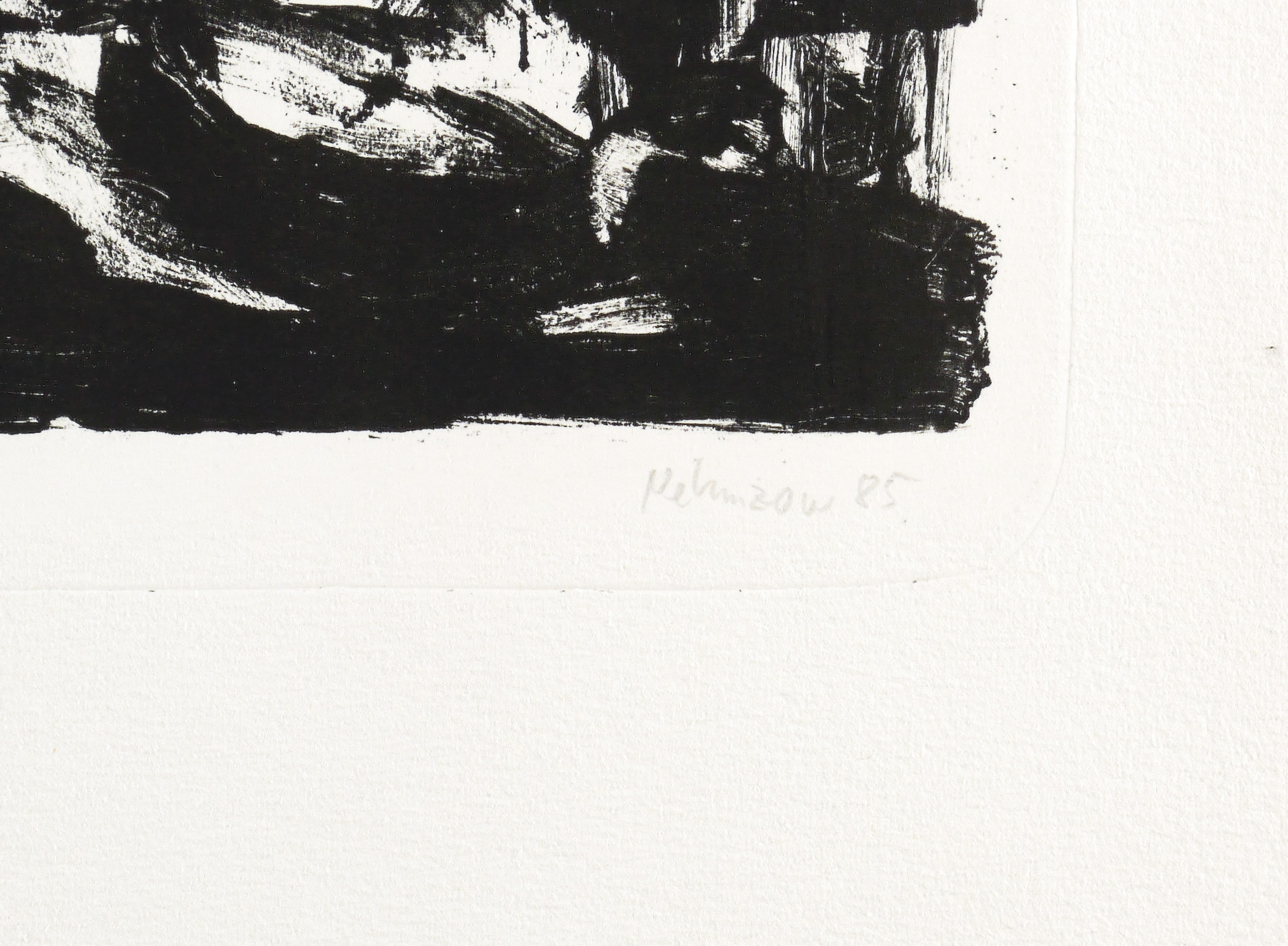1985. Lithografie / Pinsellithografie, in Schwarz, auf schwerem hellchamois Hahnemühle. – Originale Künstlergrafik, von Olaf Nehmzow. – Probedruck. – 44,0 x 35,1 cm (Darstellung / Druckbild), 48,3 x 37,5 cm (Stein), 70 x 50 cm (Blatt).