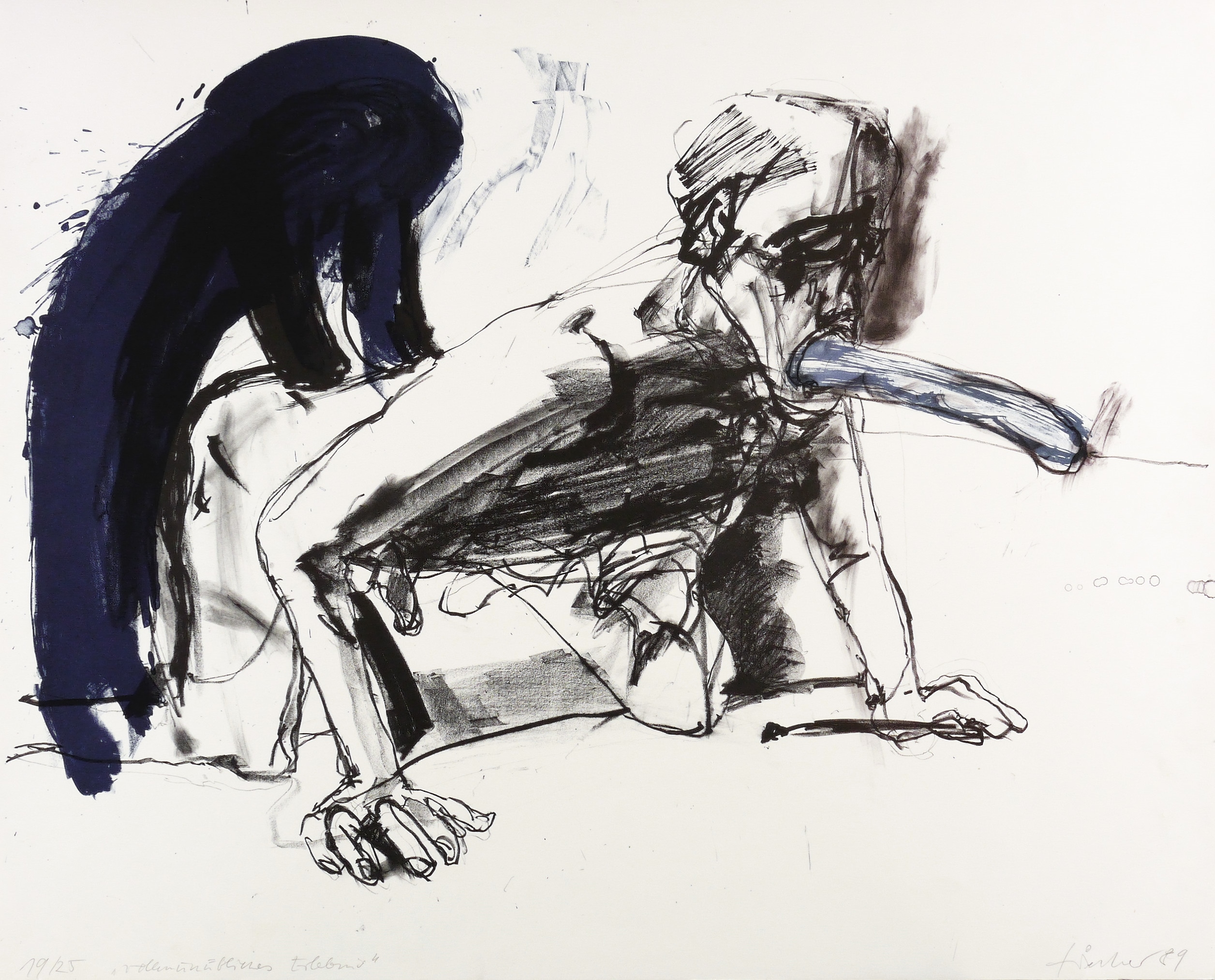 1989. Farbalgrafie / Kreide- & Pinselalgrafie, in Blau, Hellblau & Schwarz, auf glattem weißem Karton. – Originale Künstlergrafik, von Steffen Fischer. – Auflage Exemplar Nr. 19/25. – 54,5 x 76,0 cm (Darstellung / Platte), 63 x 78 cm (Blatt).
