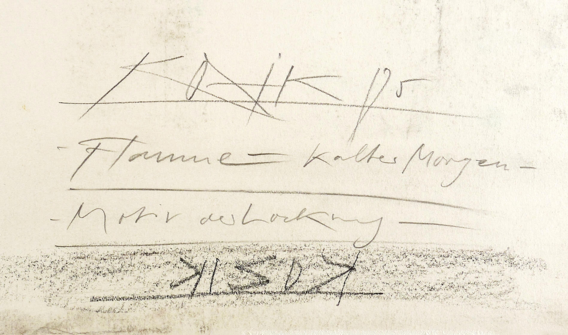 Verso in Bleistift signiert: ″KOZIK 85″. Dazu weiter bezeichnet und betitelt: ″Flamme - kalter Morgen - Motiv der Lockung″. – Verso weitere wohl verworfene Zeichnung. – Sehr guter Zustand.