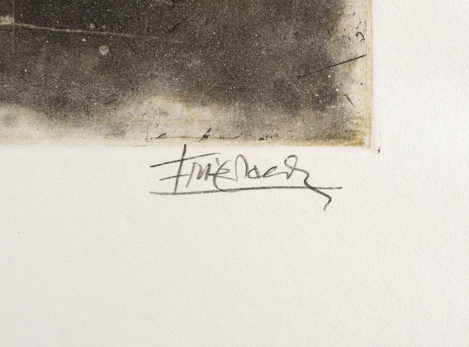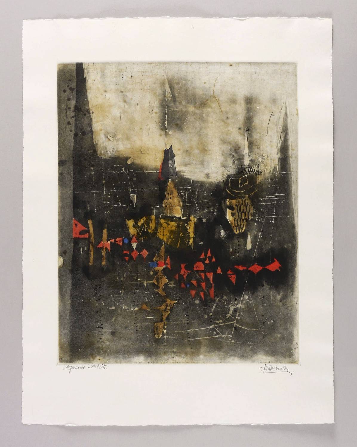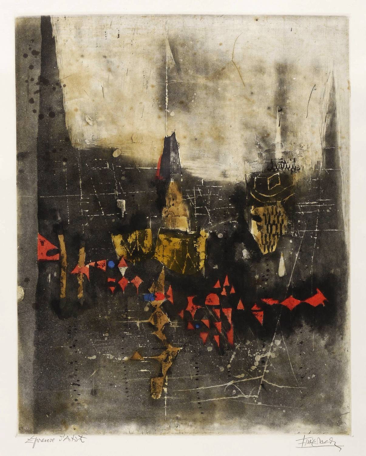 1961. Farbradierung / Aquatinta, in 6 Farben, auf festem hellchamois BFK-Rives. – Originale Künstlergrafik, von Johnny Friedländer. – Künstlerexemplar (e.a.). – 49,3 x 39,2 cm (Darstellung / Platte), 67 x 51 cm (Blatt).