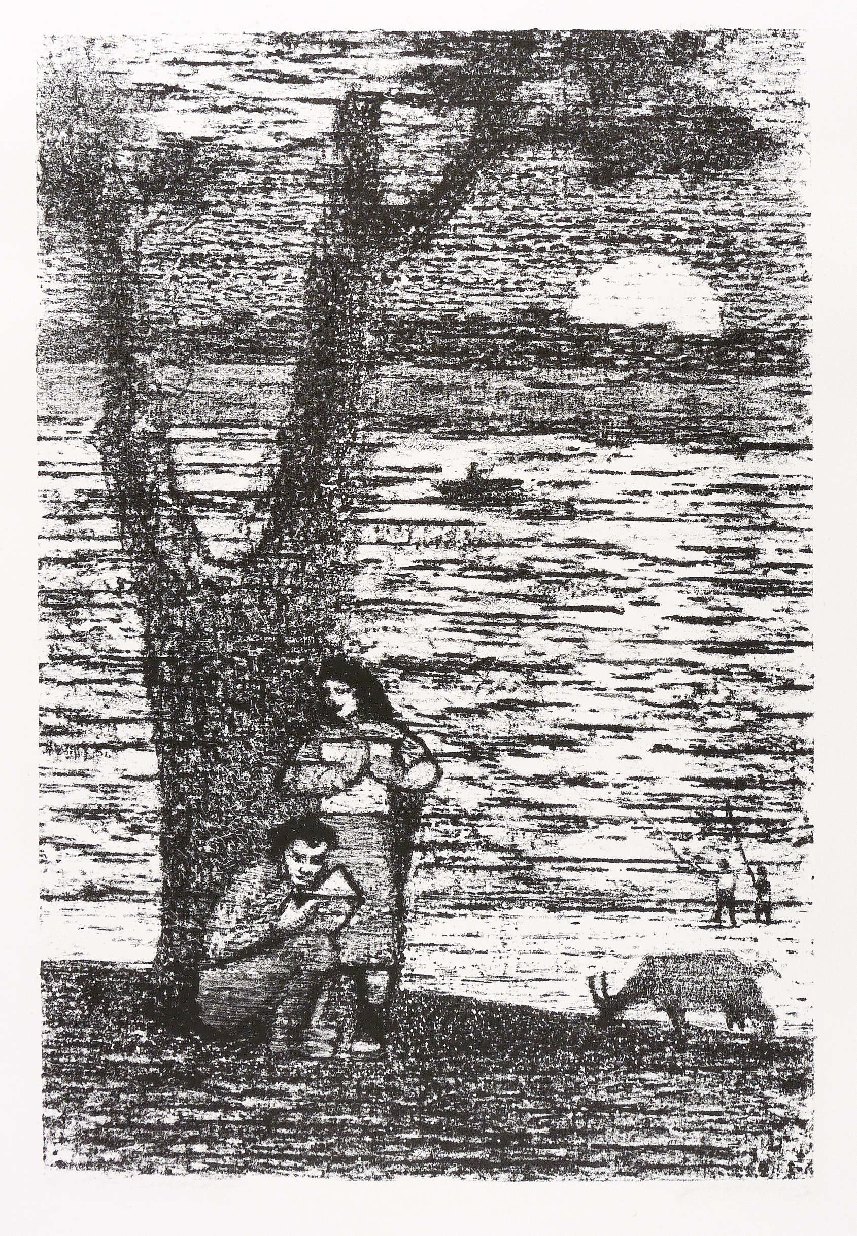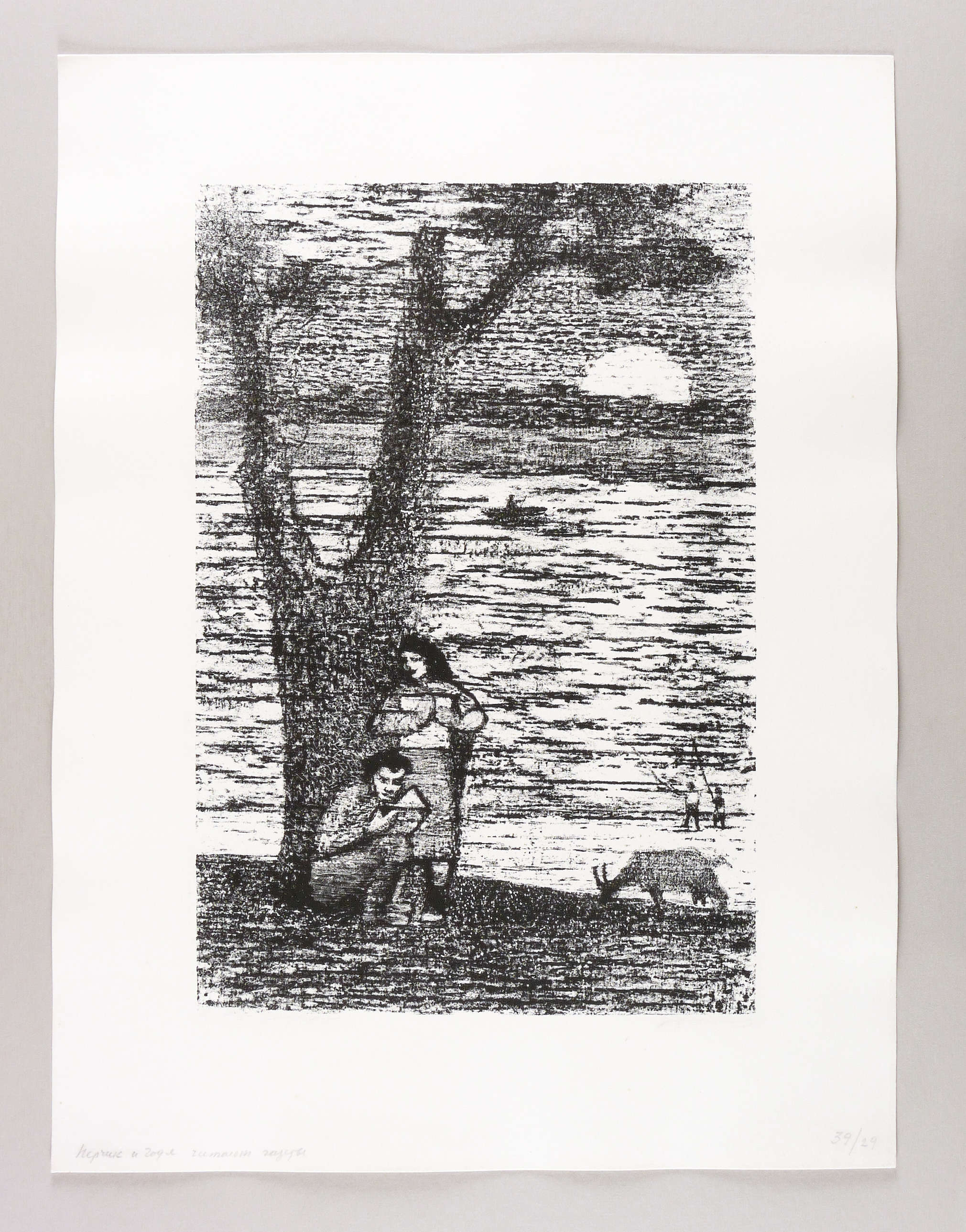 1957-1960. Lithografie / Kreidelithografie, partiell gewischt, in Schwarz, auf weichem rauem Velin. – Originale Künstlergrafik, von Anatoli Kaplan. – 46,0 x 31,0 cm (Darstellung / Druckbild), 62 x 47 cm (Blatt).