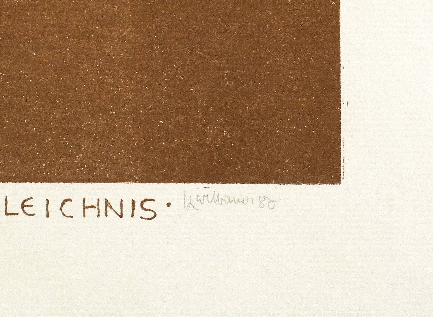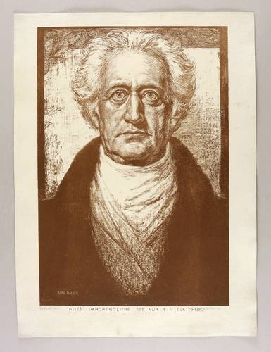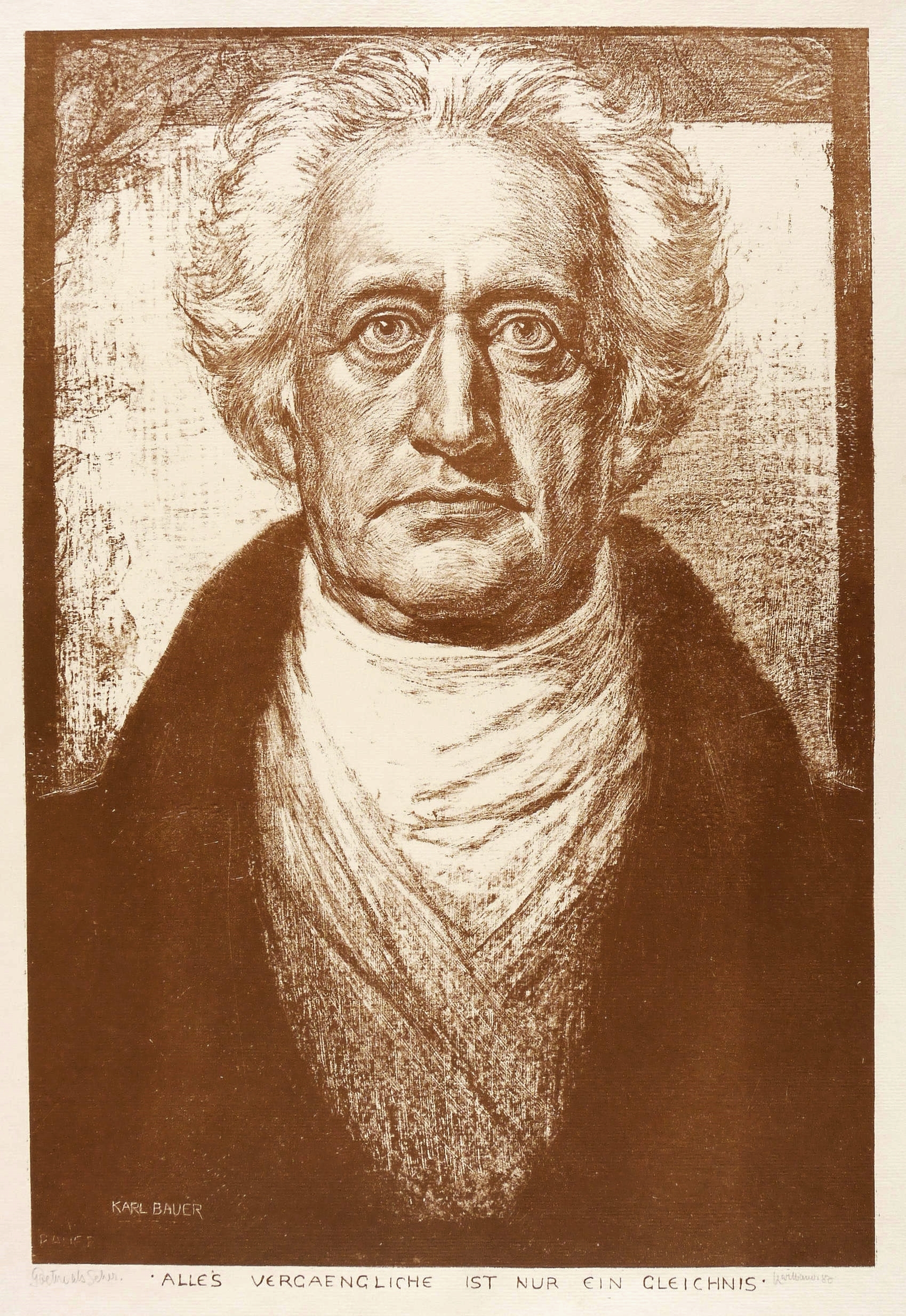 Links unten in Bleistift signiert: ″Karl Bauer gez.″. Rechts Titel: ″Goethe als Seher″. Im Stein links unten Ritzsignatur: ″KARL BAUER″. Im Stein unterhalb der Darstellung Inschrift: ″ALLES VERGÄNGLICHE IST NUR EIN GLEICHNIS″. – Im Blattrand leicht fleckig. Mäßig gut erhalten.