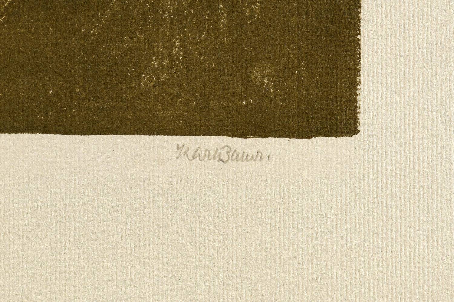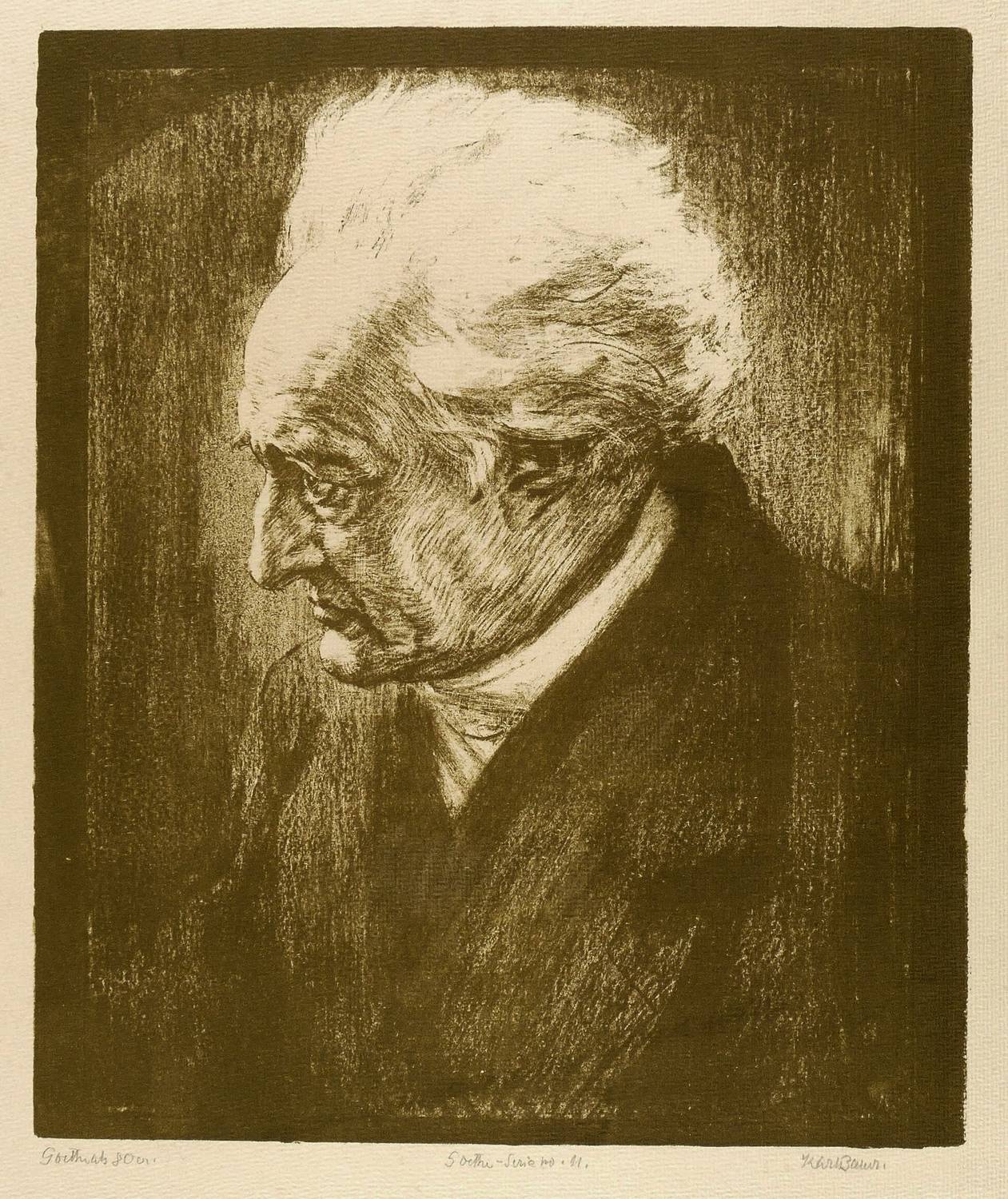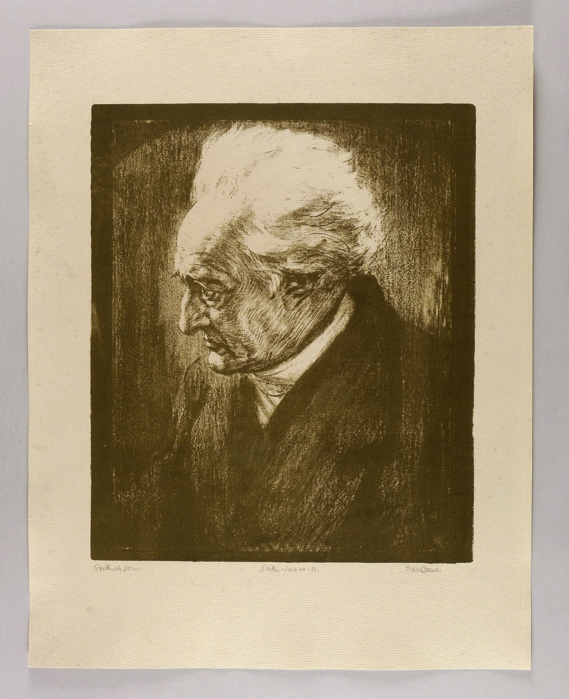 Links unten in Bleistift signiert: ″Karl Bauer.″ Rechts Titel: ″Goethe als 80er″. Mittig bezeichnet: ″Goethe-Serie No. 11″. – Im Blattrand unmerklich fleckig. Mäßig gut bis gut erhalten.