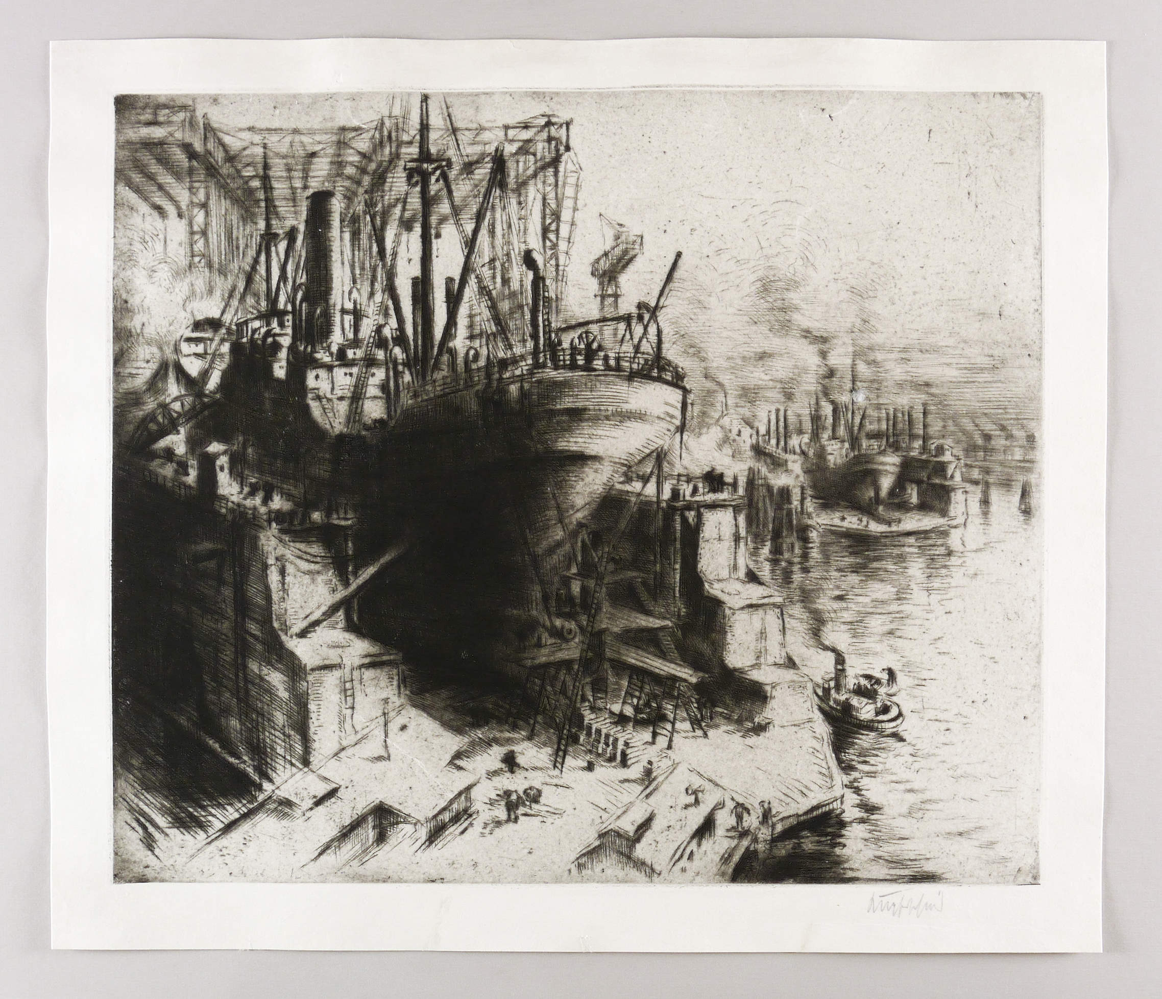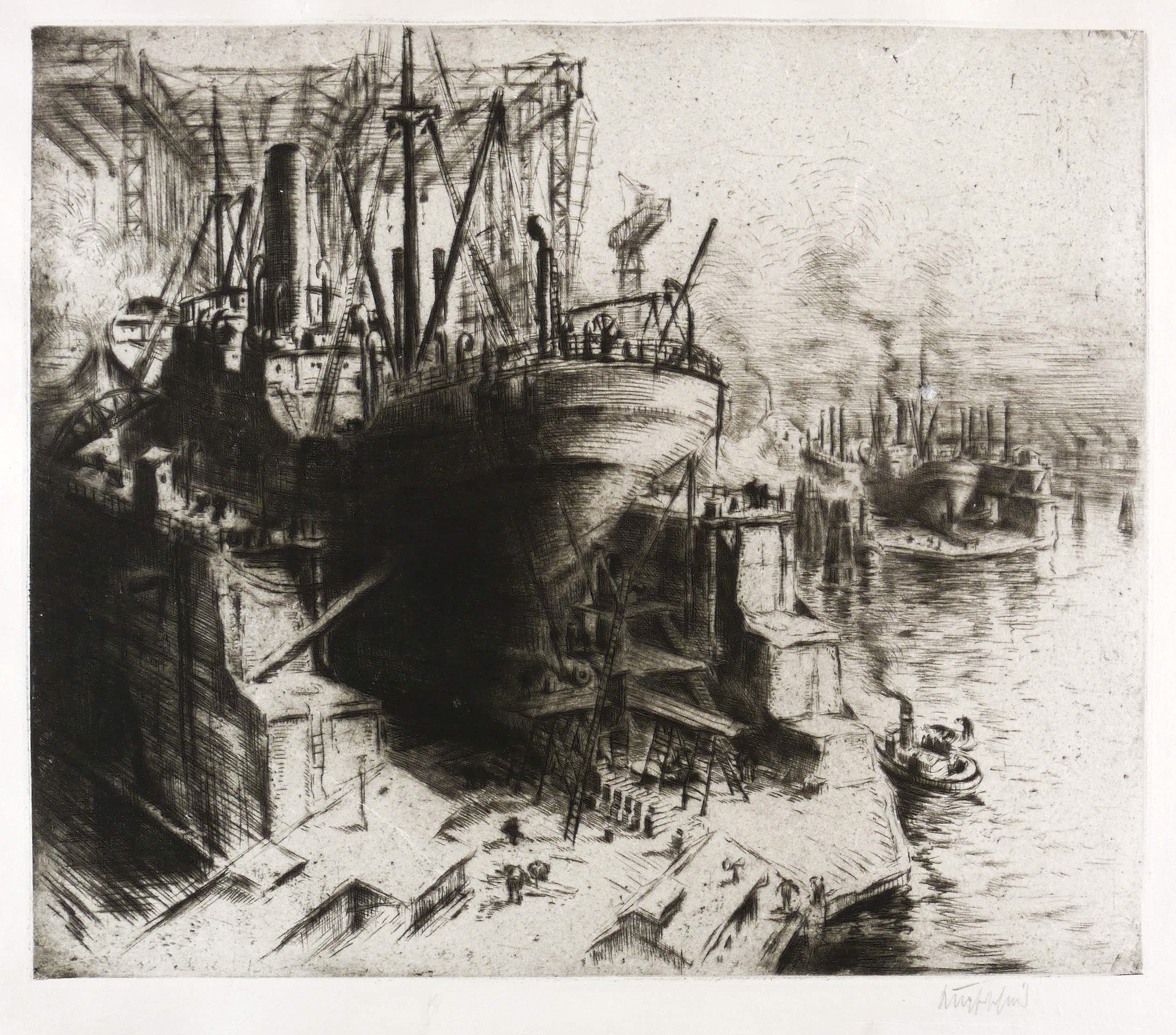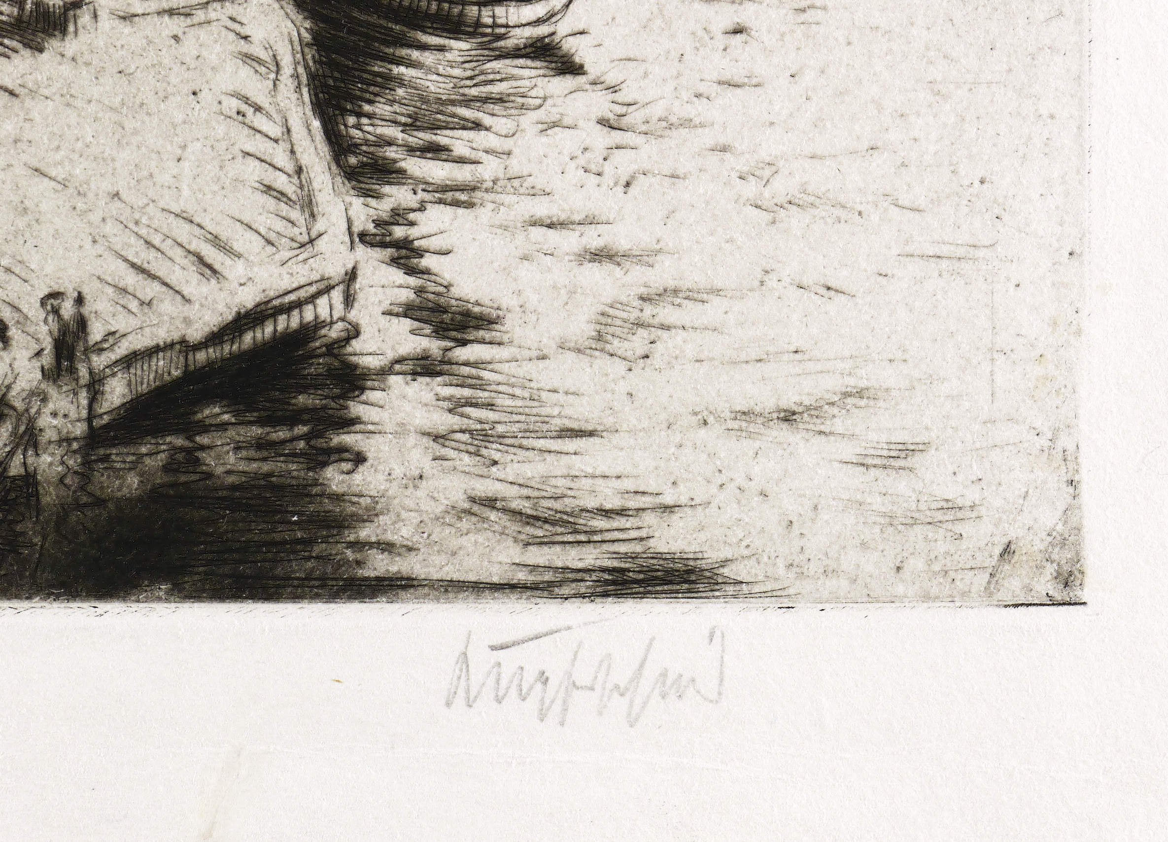 1925-1930. Radierung / Strichätzung & Kaltnadel, mit Plattenton, in Schwarz, auf starkem hellgelbem Velin. – Originale Künstlergrafik, von Hermann Kupferschmid. – 49,1 x 57,7 cm (Darstellung / Platte), 57 x 66 cm (Blatt).