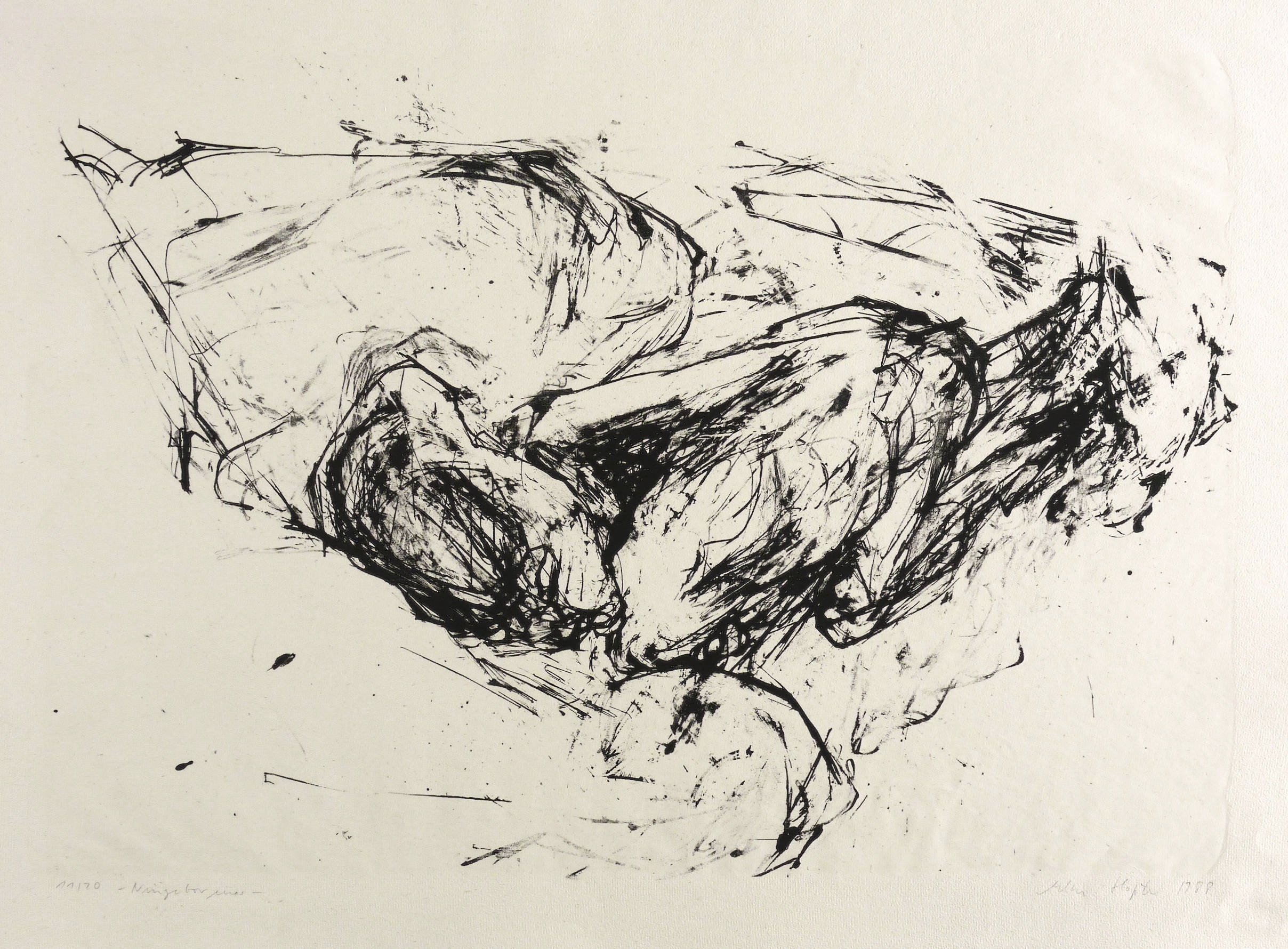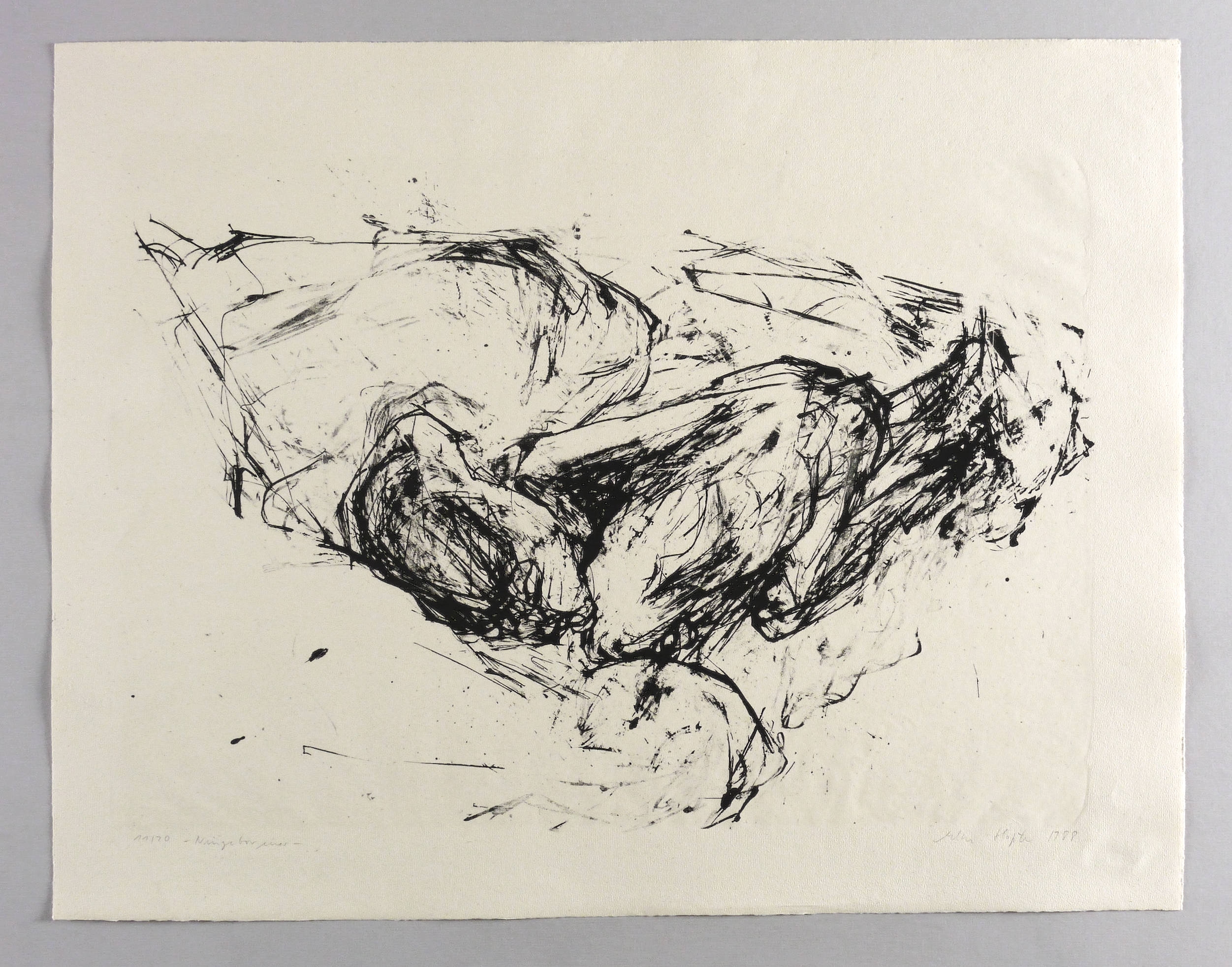 1988. Lithografie / Kreidelithografie, in Schwarz, auf rauem chamois Bütten. – Originale Künstlergrafik, von Elke Hopfe. – Auflage Exemplar Nr. 11/20. – 40,2 x 57,4 cm (Darstellung / Druckbild), 53 x 68 cm (Blatt).