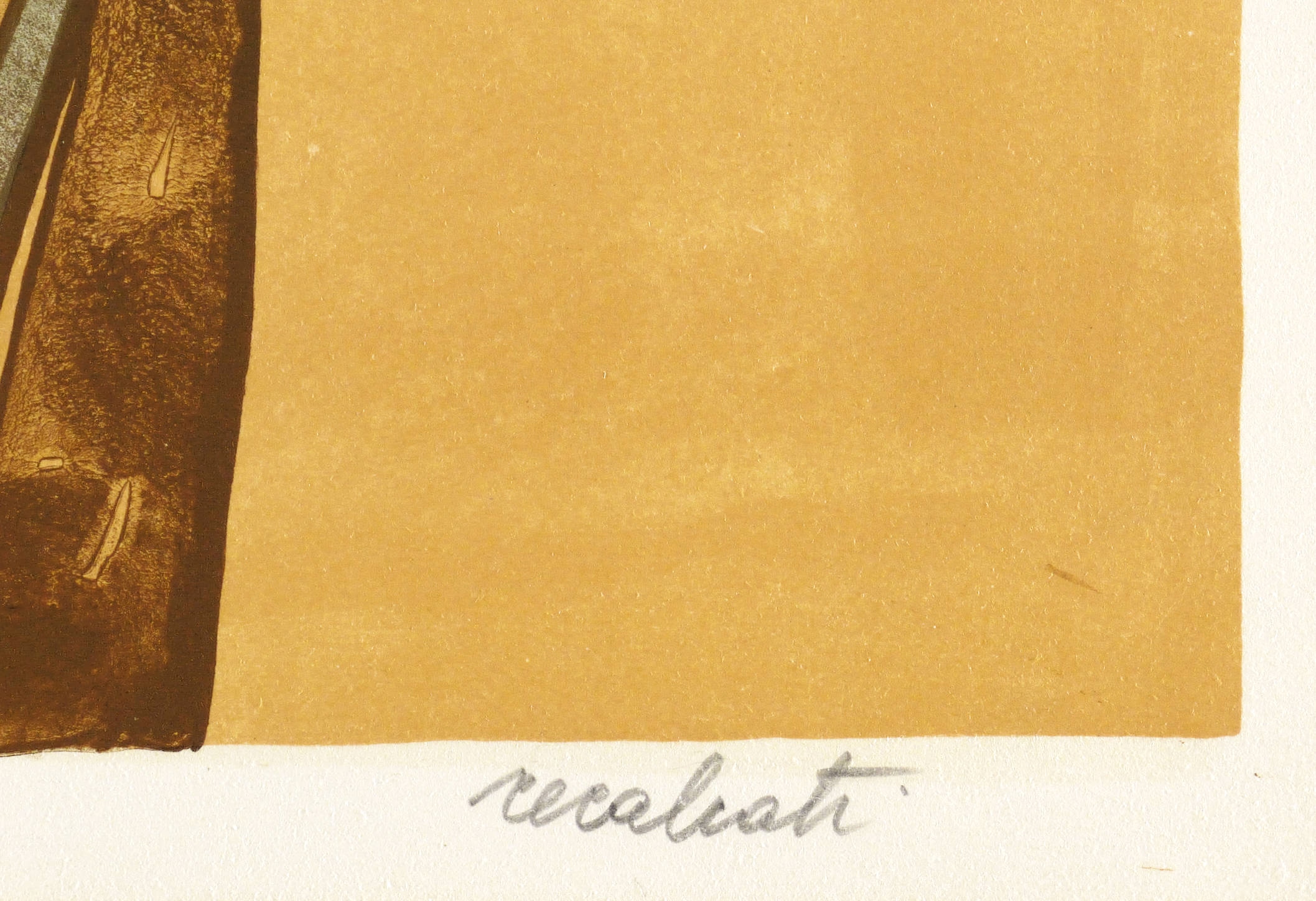 1970-1980. Farblithografie / Pinsellithografie, in 5 Farben, auf weichem gelbem Velinkarton. – Originale Künstlergrafik, von Antonio Recalcati. – Auflage Exemplar Nr. 132/150. – 62,4 x 42,6 cm (Darstellung / Druckbild), 66 x 51 cm (Blatt).