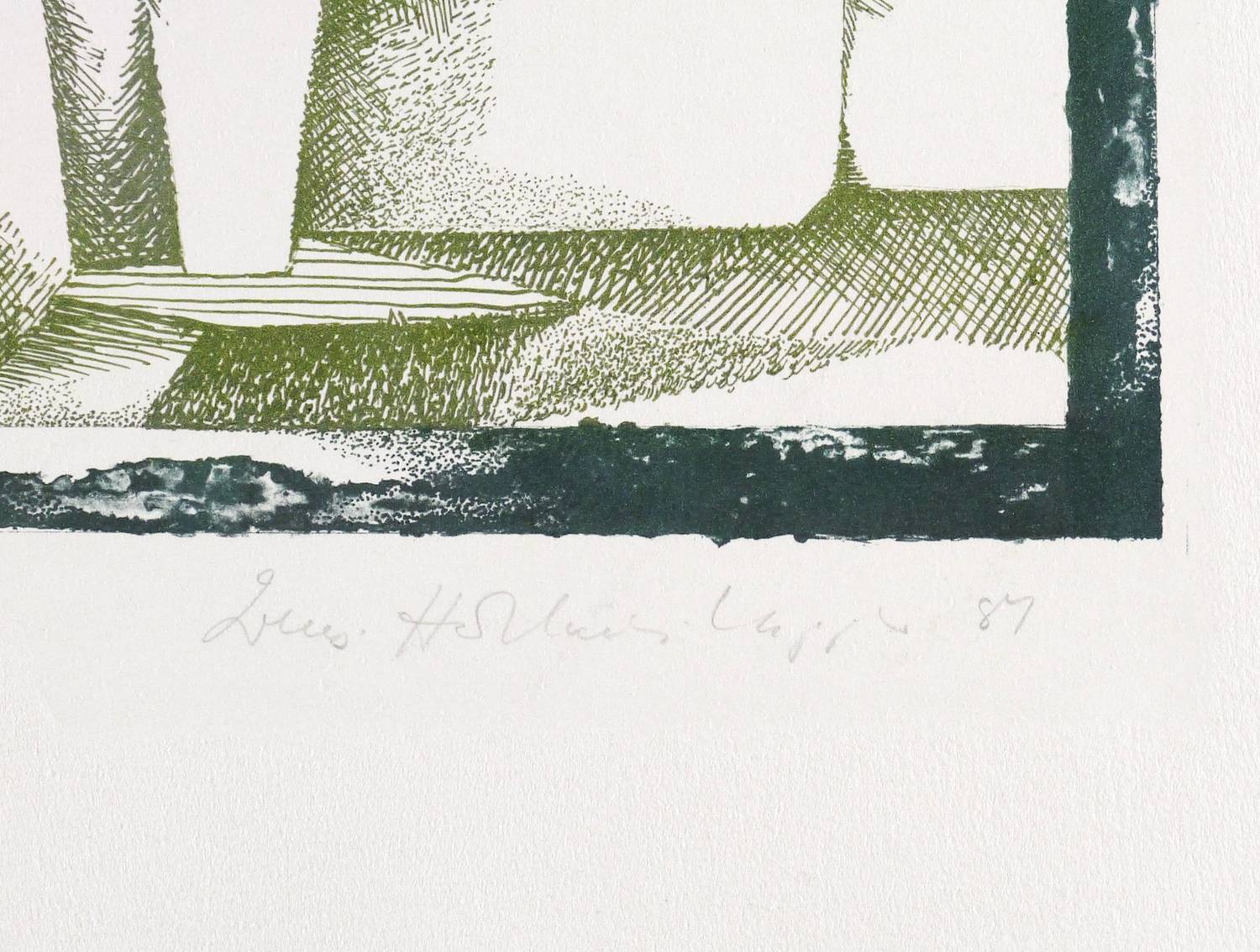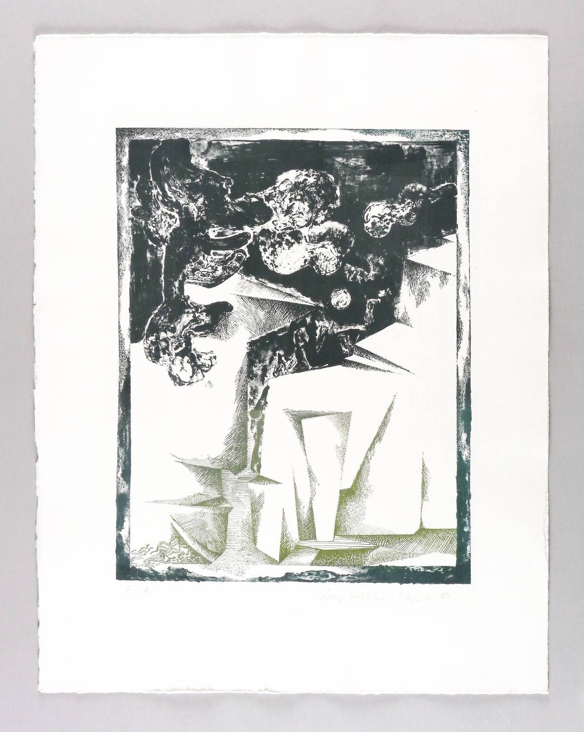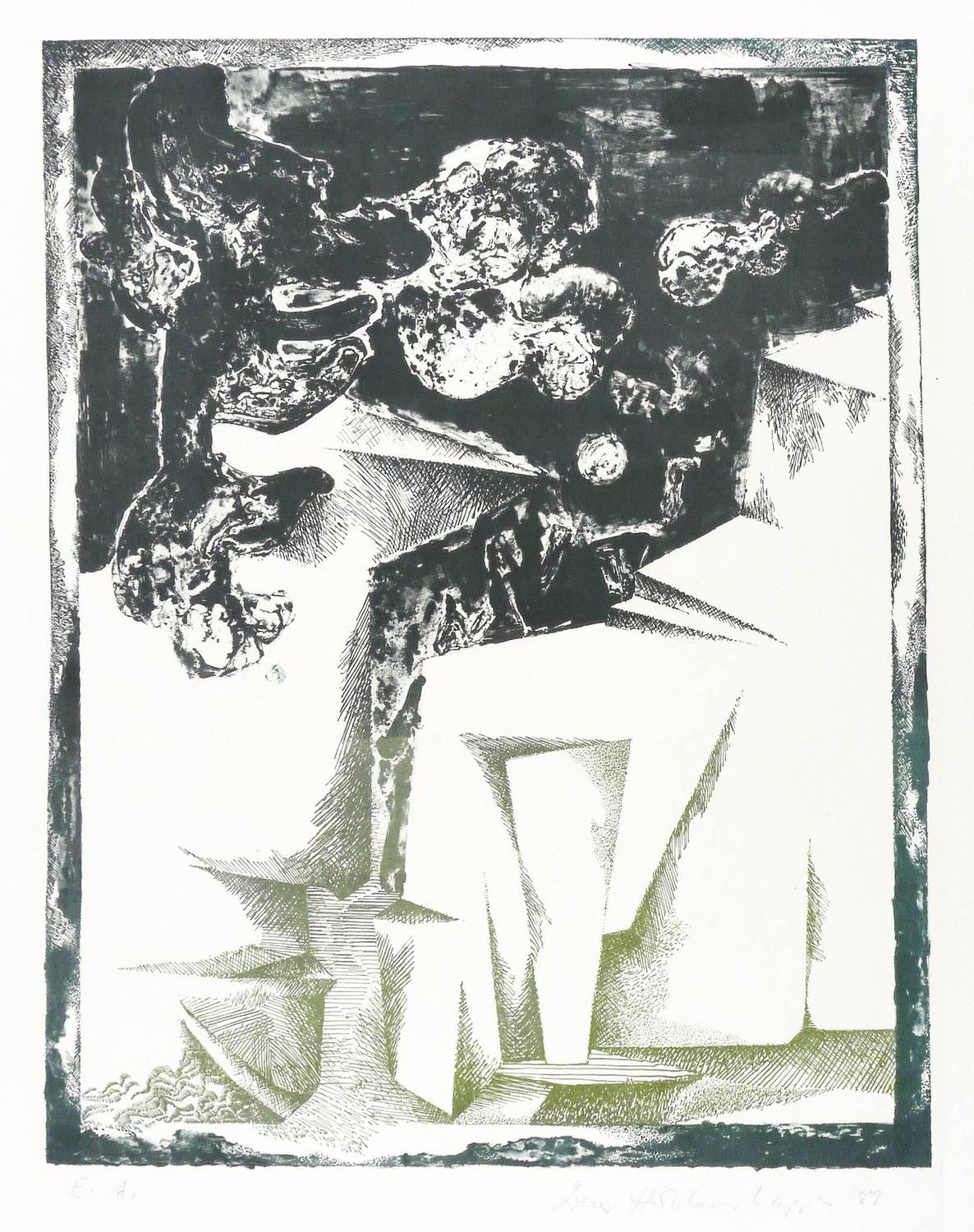 1981. Farblithografie / Feder- & Pinsellithografie, in Olivgrün & Anthrazit, auf schwerem hellchamois Hahnemühle. – Originale Künstlergrafik, von Irmgard Horlbeck-Kappler. – Künstlerexemplar (e.a.). – 47,3 x 36,8 cm (Darstellung / Druckbild), 69 x 53 cm (Blatt).