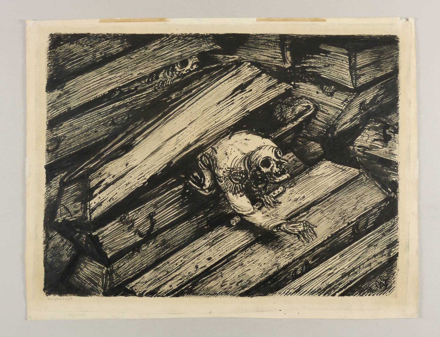 In der Darstellung rechts unten in schwarzer Feder mit Monogramm signiert: ″W″. Links unten in Bleistift betitelt: ″morgenluft″. Verso Archivstempel der Griffelkunst in Blau. – Von diesem Motiv fertigte Andreas Paul Weber auch eine Lithografie mit gleichem Titel an, von der Abzüge aus dem Jahr 1952 bekannt sind. – Büttenpapier durchgehend leicht gegilbt. Umlaufend mit etwa 1 cm Abstand zur Darstellung schwach ausgeprägter Lichtrand. Im Rand diverse Montagespuren bzw. kleine Fehlstelle in der rechten oberen Ecke. Insgesamt aber doch recht guter Zustand.
