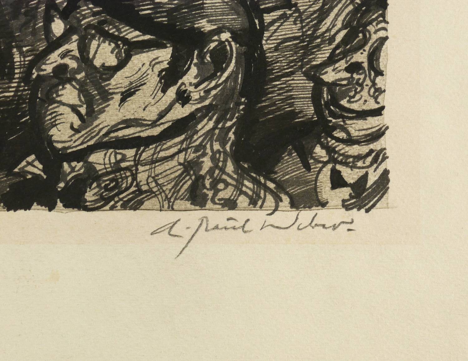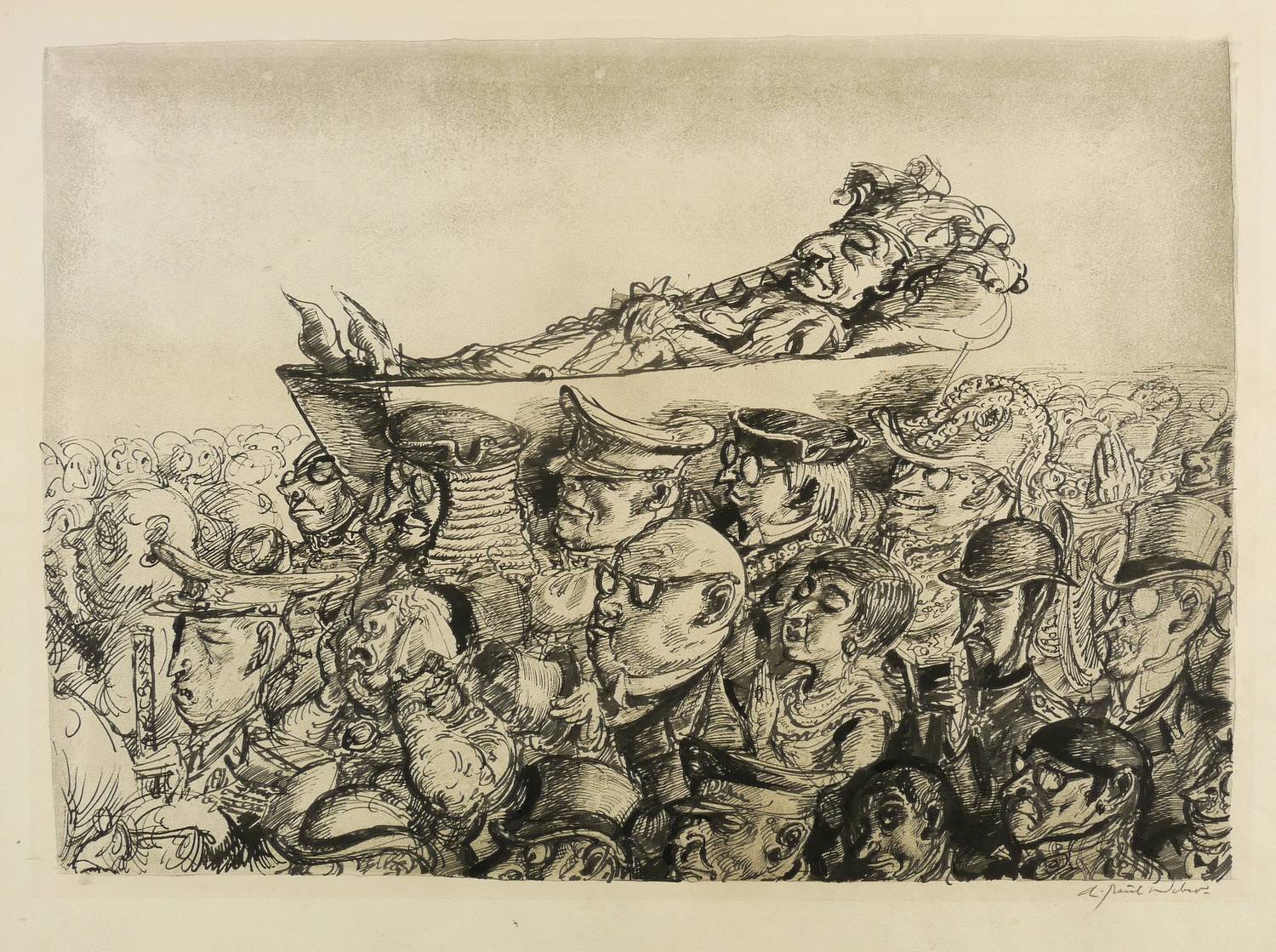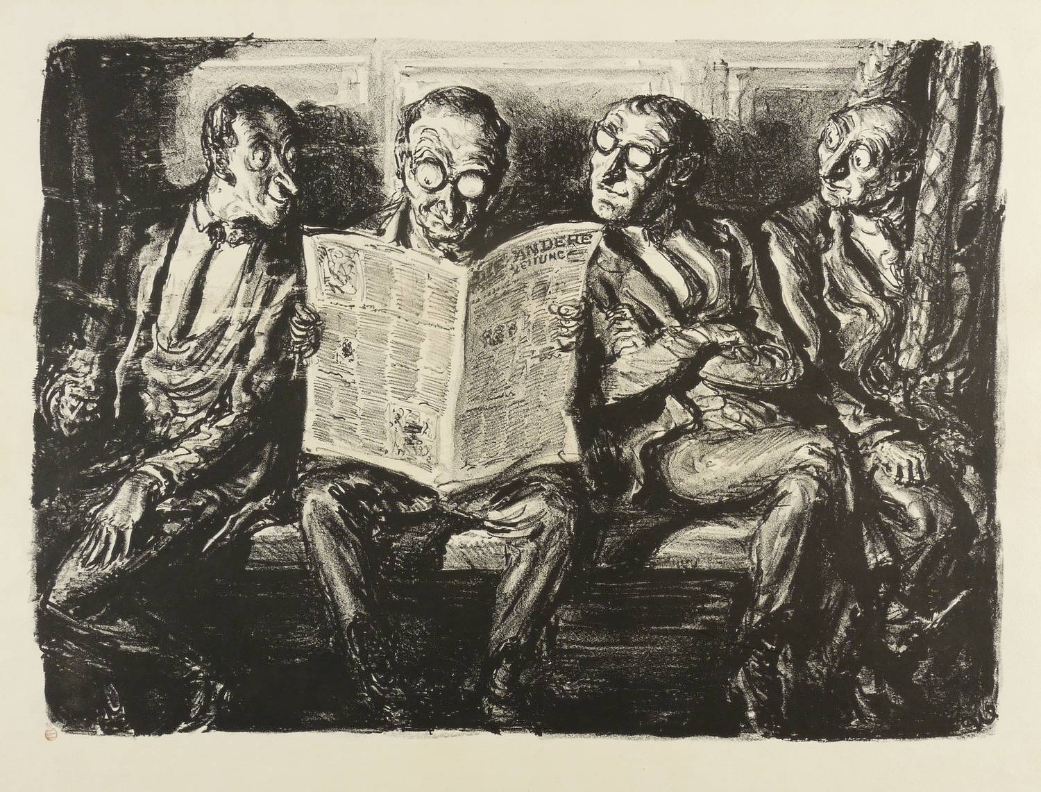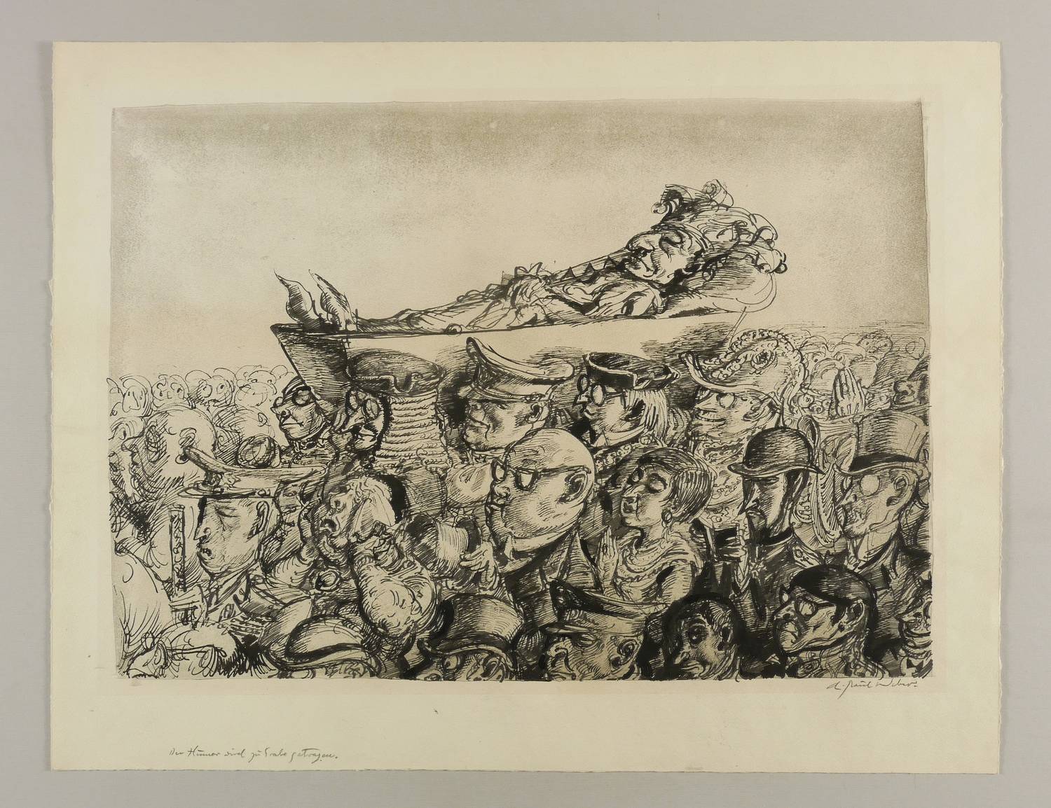 Rechts unten in Bleistift signiert: ″A. Paul Weber″. Links unten am Blattrand betitelt: ″Der Humor wird zu Grabe getragen″. Verso Stempel der Clan-Presse in Rot (zu dem Probeabzug der rückseitigen Lithografie). – Auf der Rückseite ein Probeabzug einer Lithografie von Andreas Paul Weber mit der Darstellung vierer Bahnreisender, einer eine Zeitung (Die andere Zeitung, AZ, Hamburg) lesend, für die sich die drei anderen lebhaft zu interessieren scheinen. – Sehr guter Zustand.