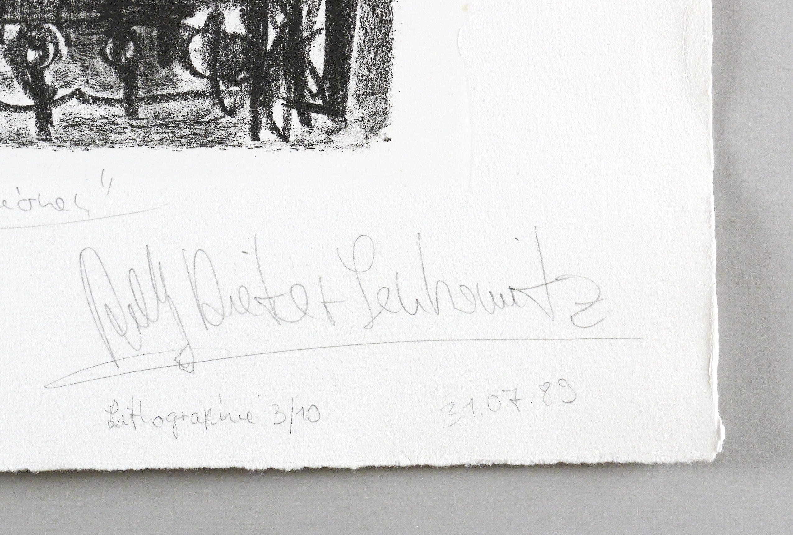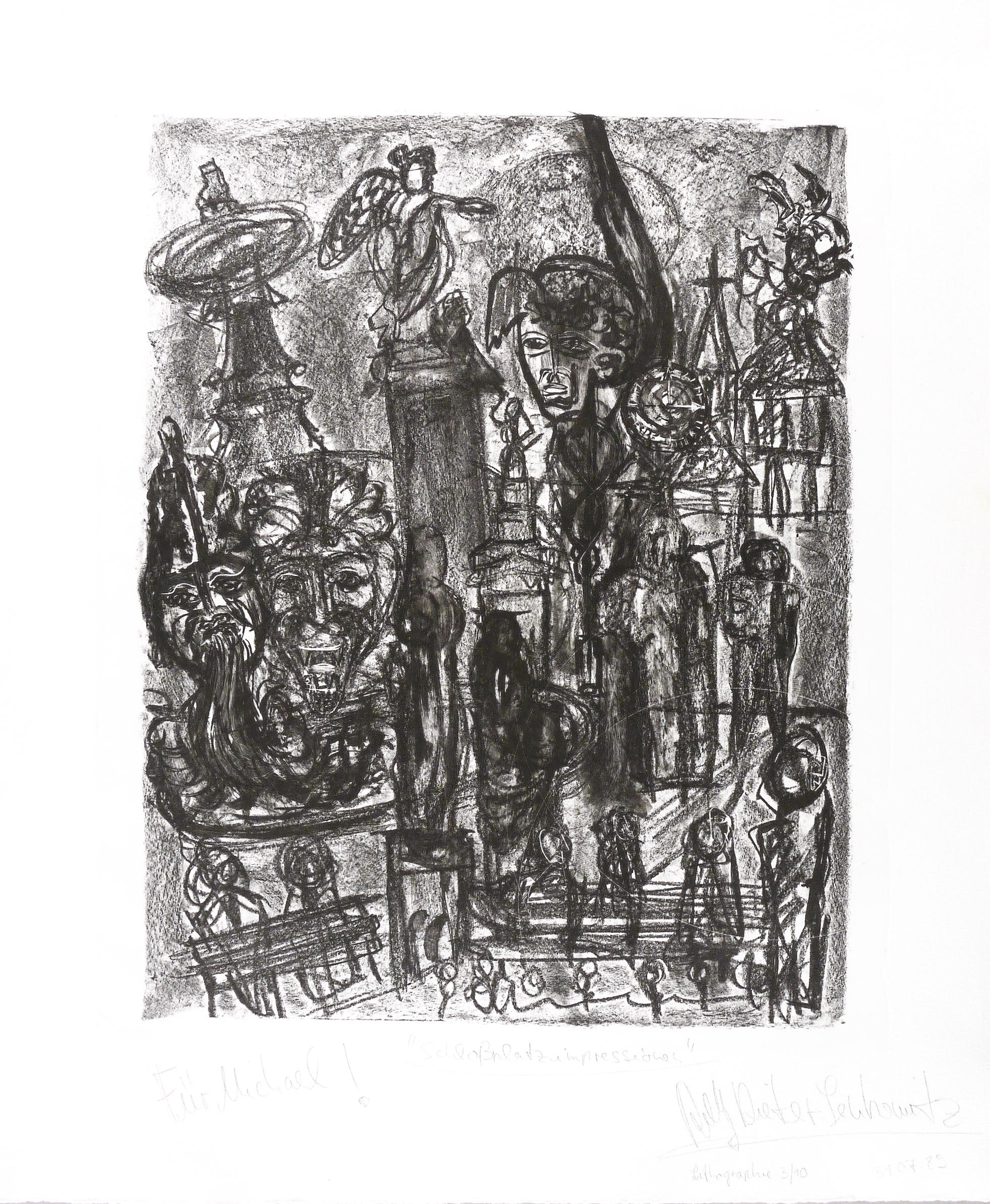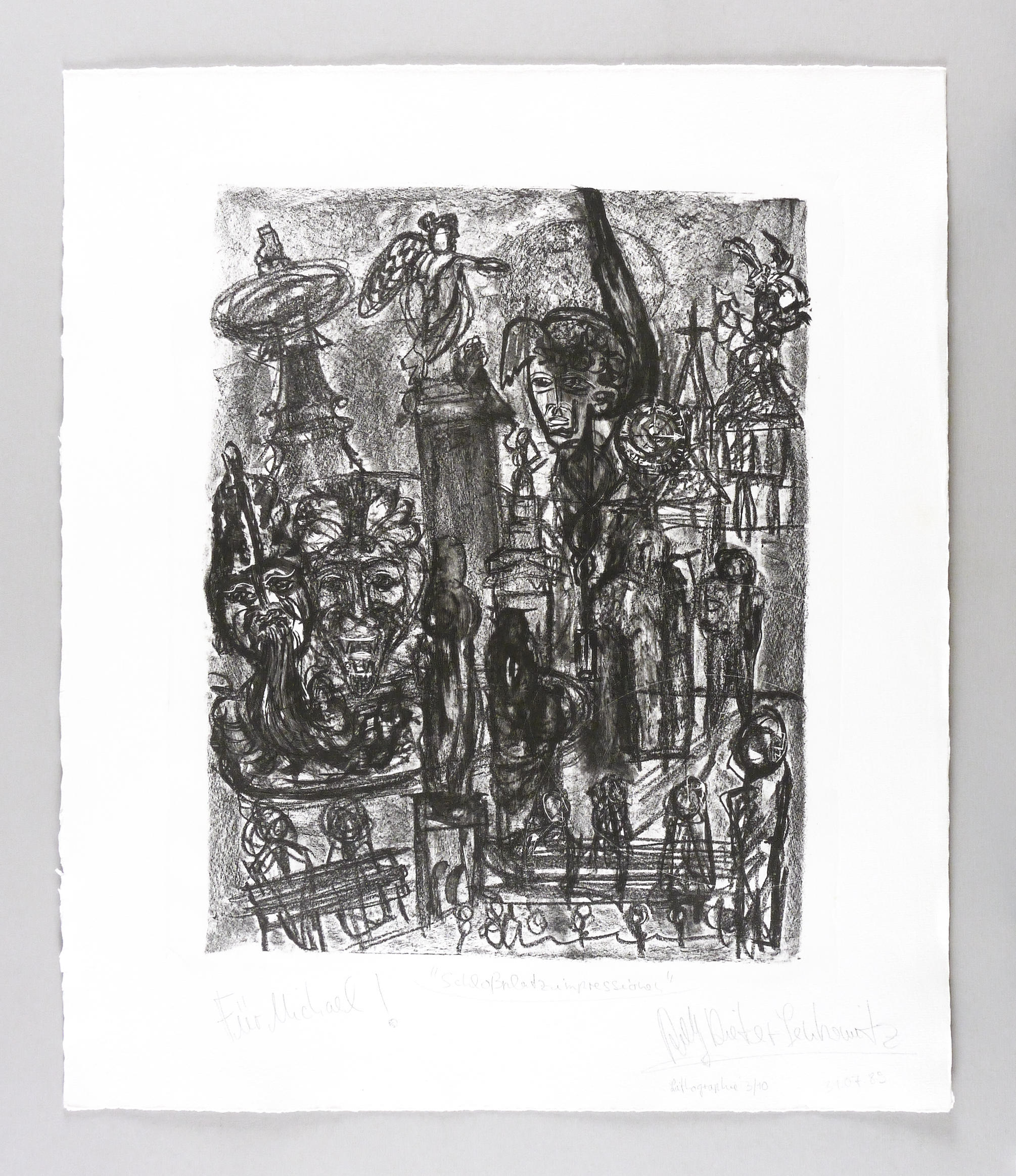 1989. Lithografie / Kreidelithografie, partiell geschabt, in Schwarz, auf schwerem hellchamois Hahnemühle. – Originale Künstlergrafik, von Rolf-Dieter Lenkewitz. – Auflage Exemplar Nr. 3/10. – 48,3 x 38,2 cm (Darstellung / Druckbild), 66 x 56 cm (Blatt).