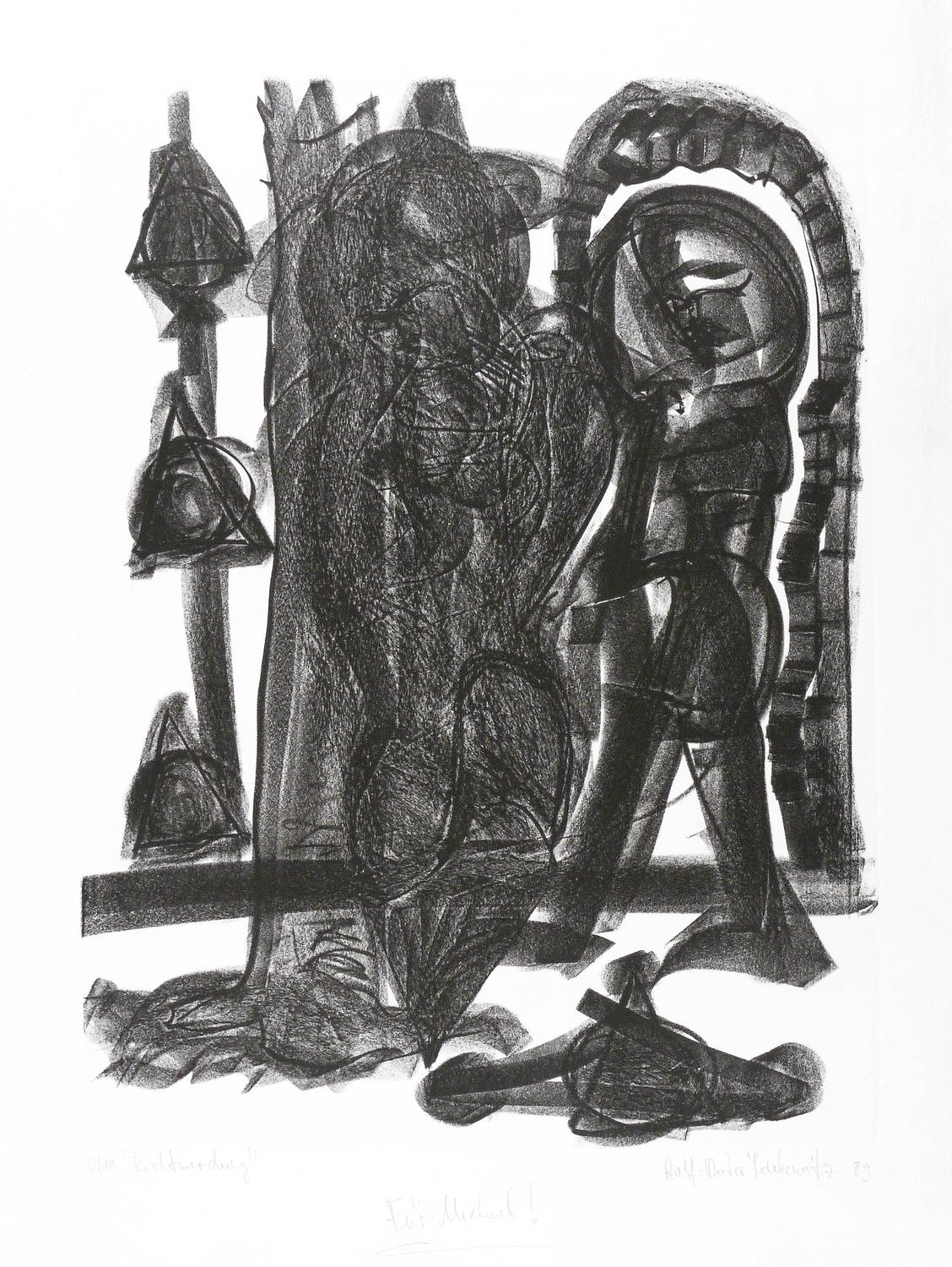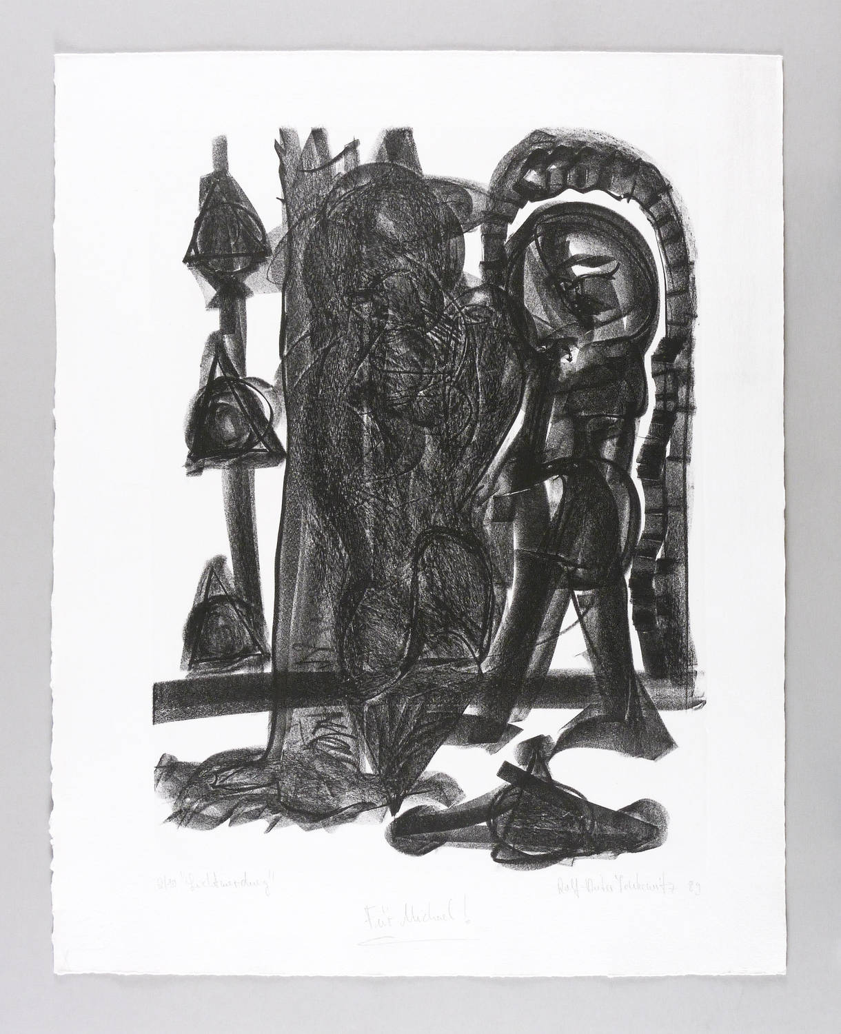 1989. Lithografie / Kreidelithografie, partiell geschabt, in Schwarz, auf schwerem hellchamois Hahnemühle. – Originale Künstlergrafik, von Rolf-Dieter Lenkewitz. – Auflage Exemplar Nr. 2/10. – 57,3 x 42,5 cm (Darstellung / Druckbild), 71 x 56 cm (Blatt).