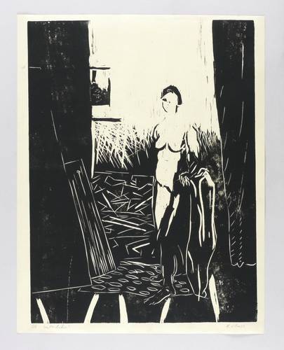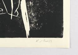 Um 2000. Linolschnitt, in Schwarz, auf hellgelbem Maschinenbütten. – Originale Künstlergrafik, von Konrad Maass. – Auflage Exemplar Nr. 1/1. – 59,5 x 45,0 cm (Darstellung / Druckstock), 64 x 50 cm (Blatt).