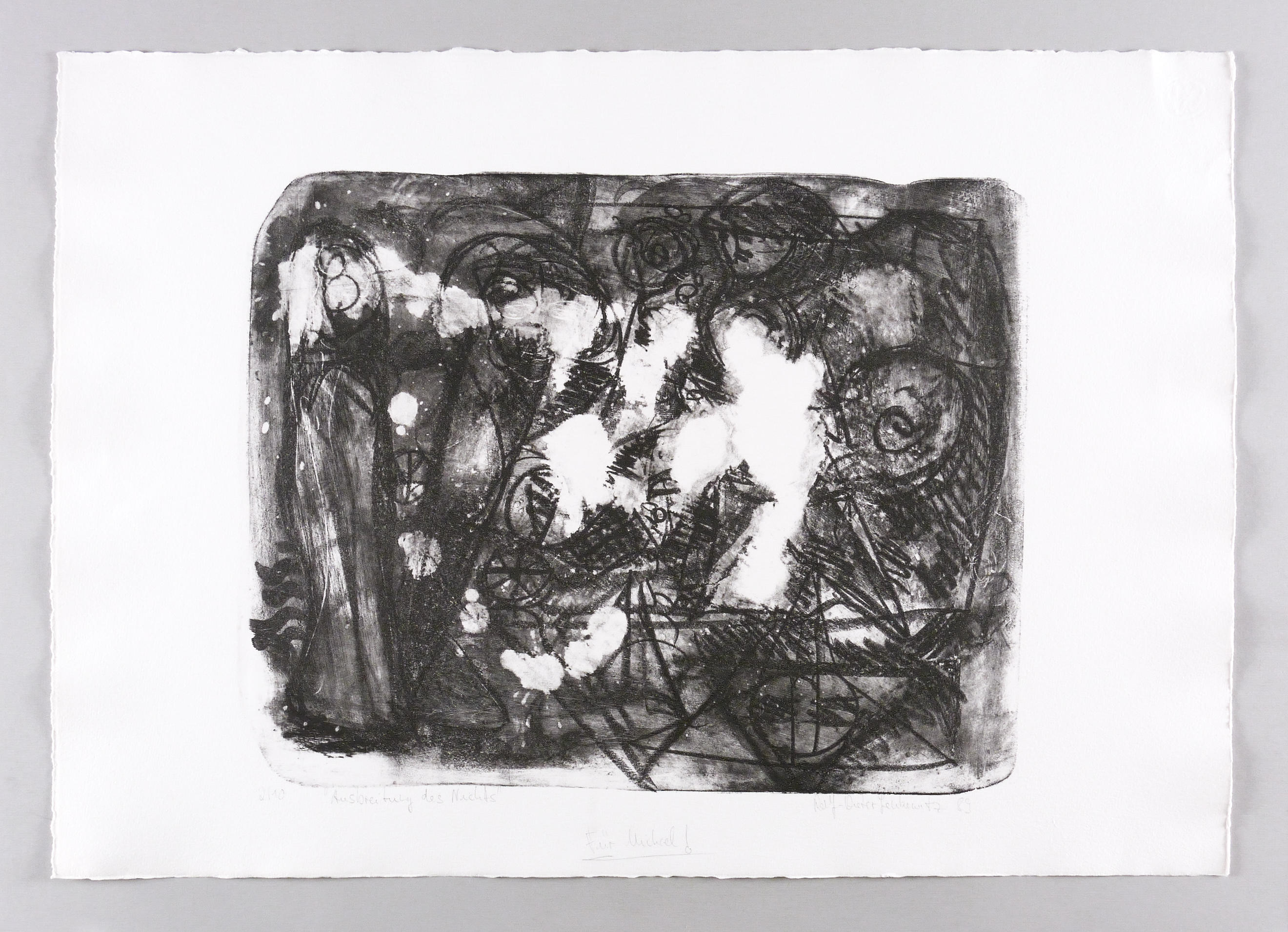 1989. Lithografie / Kreide- & Pinsellithografie, partiell geschabt, in Schwarz, auf schwerem hellchamois Hahnemühle. – Originale Künstlergrafik, von Rolf-Dieter Lenkewitz. – Auflage Exemplar Nr. 2/10. – 42,0 x 52,3 cm (Darstellung / Druckbild), 56 x 80 cm (Blatt).