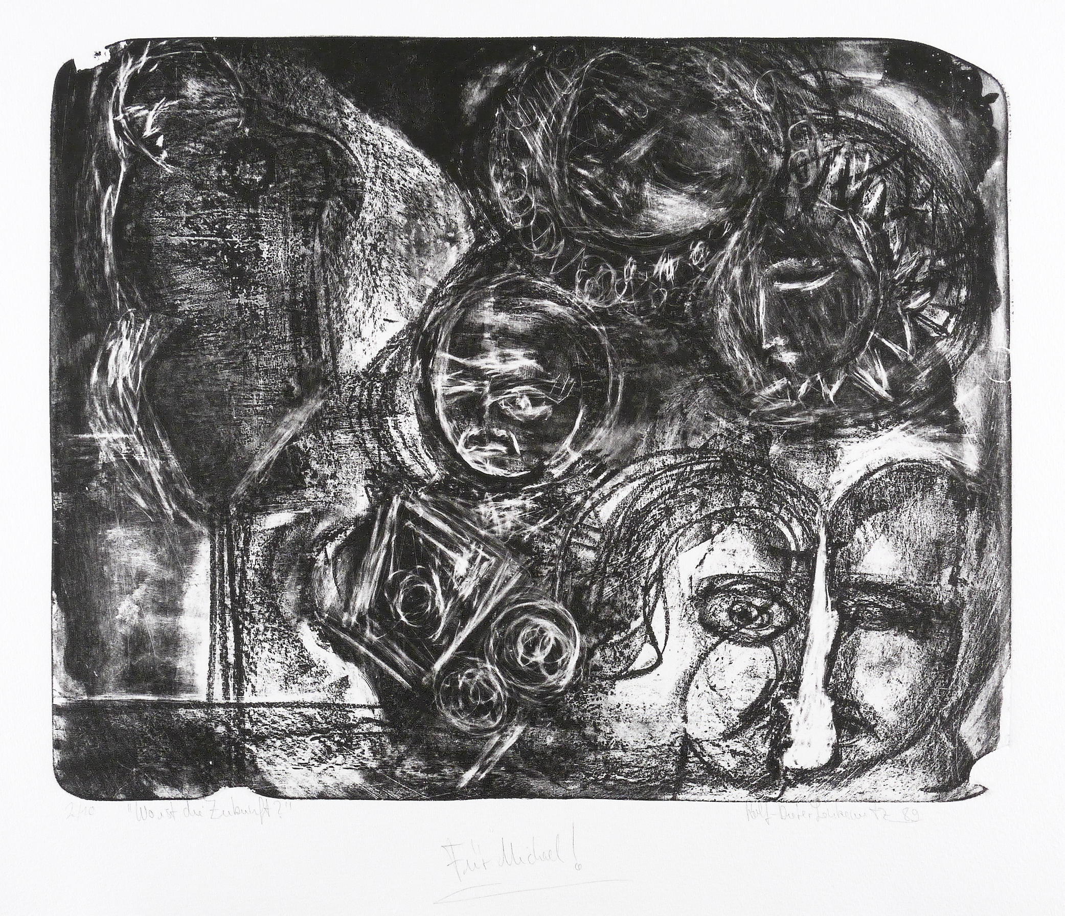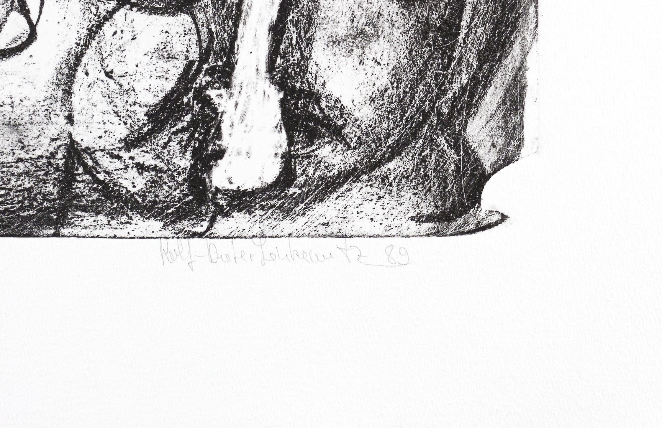 1989. Lithografie / Kreide- & Pinsellithografie, partiell geschabt, in Schwarz, auf schwerem hellchamois Hahnemühle. – Originale Künstlergrafik, von Rolf-Dieter Lenkewitz. – Auflage Exemplar Nr. 2/10. – 42,1 x 52,9 cm (Darstellung / Druckbild), 56 x 80 cm (Blatt).