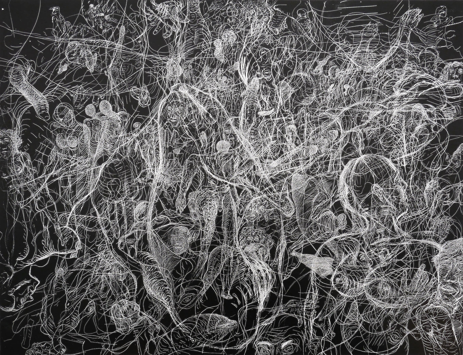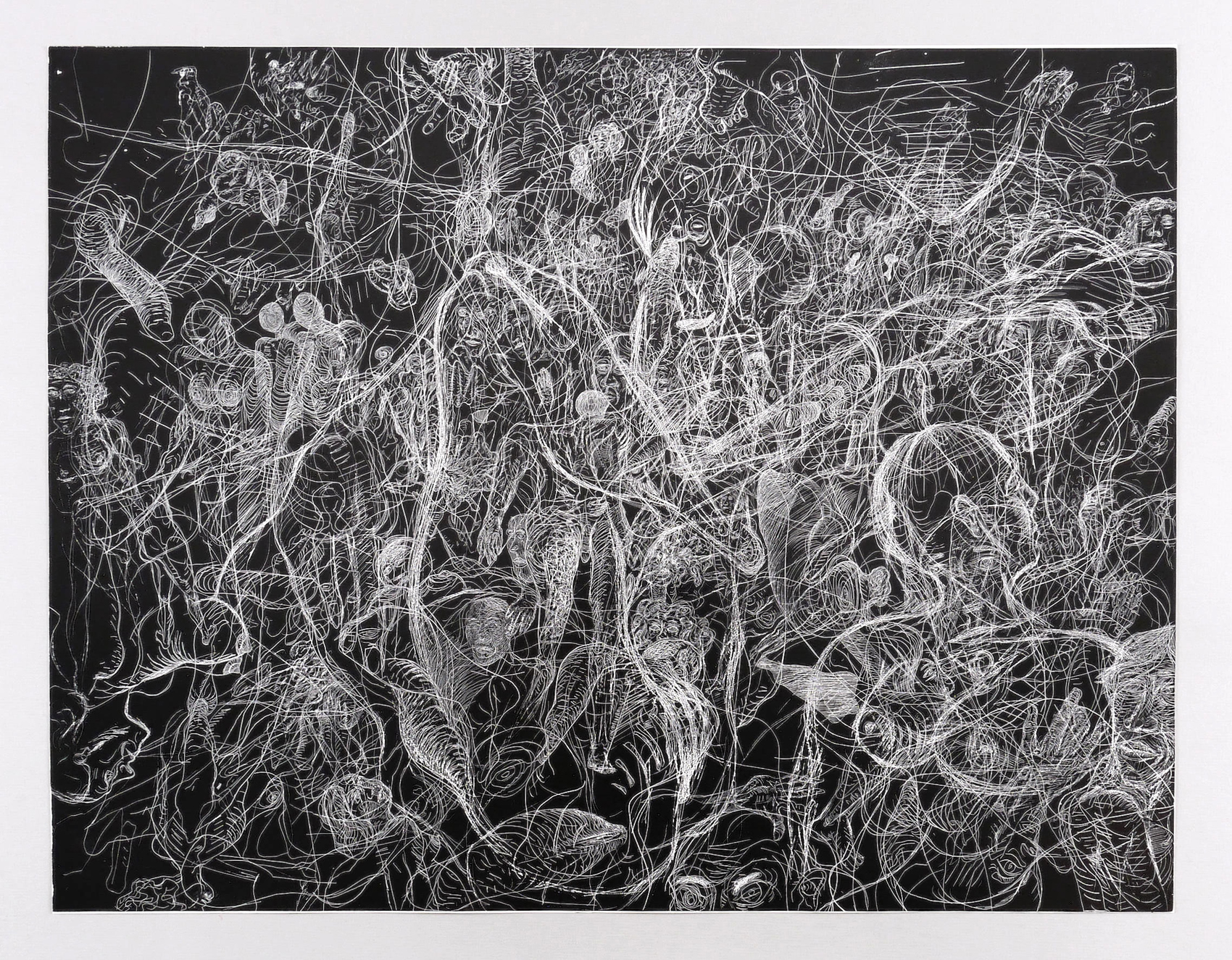 1982/1983. Radierung / Strichätzung, als Hochdruck, in Schwarz, auf glattem weißem Karton. – Originale Künstlergrafik, von Andreas Dress. – Probedruck. – 50,2 x 65,0 cm (Darstellung / Blatt).