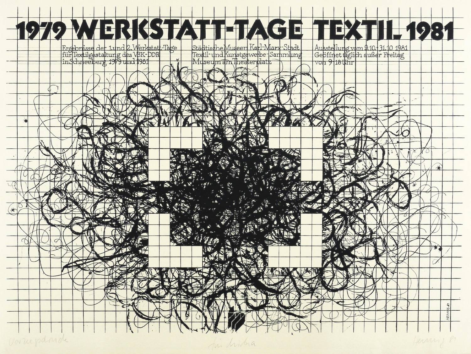 Rechts unten in Bleistift signiert und datiert: ″Hennig 81″. Links Auflagenbezeichnung: ″Vorzugsdruck″. Mittig Widmung für den Drucker Michael Wackwitz. Im Stein rechts unten Signatur und Jahr. Oben Inschrift, u.a.:″Ergebnisse der 1. und 2. Werkstatt-Tage für Textilgestaltung des VBK- DDR in Schneeberg 1979 und 1981″. – Originales Künstlerplakat zur Ausstellung ″Werkstatt-Tage Textil″ in der Textil- und Kunstgewerbe-Sammlung der Städtischen Museen Karl-Marx-Stadt 9.-31.10.1981. – Sehr gut erhalten.
