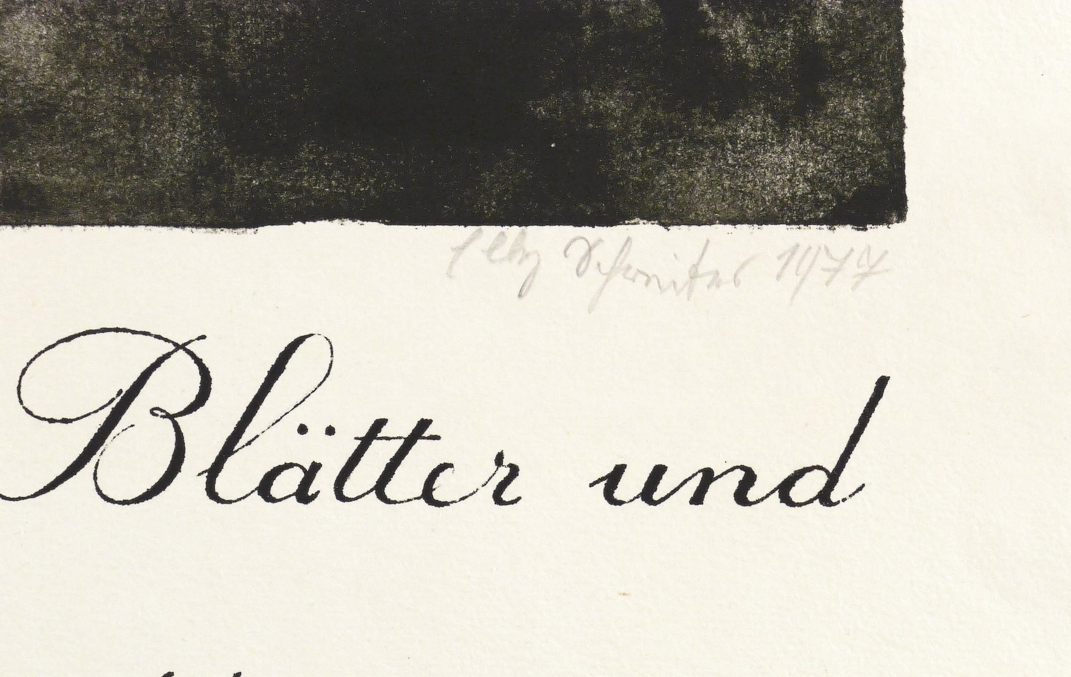 Rechts unten in Bleistift signiert und datiert: ″Elly Schreiter 77″. Diverse Inschriften im Stein. – Originalgrafisches Plakat zur Ausstellung ″Elly Schreiter. Lithographische Blätter und Aquarelle″ 1977 in Meerane. – Sehr guter Zustand.