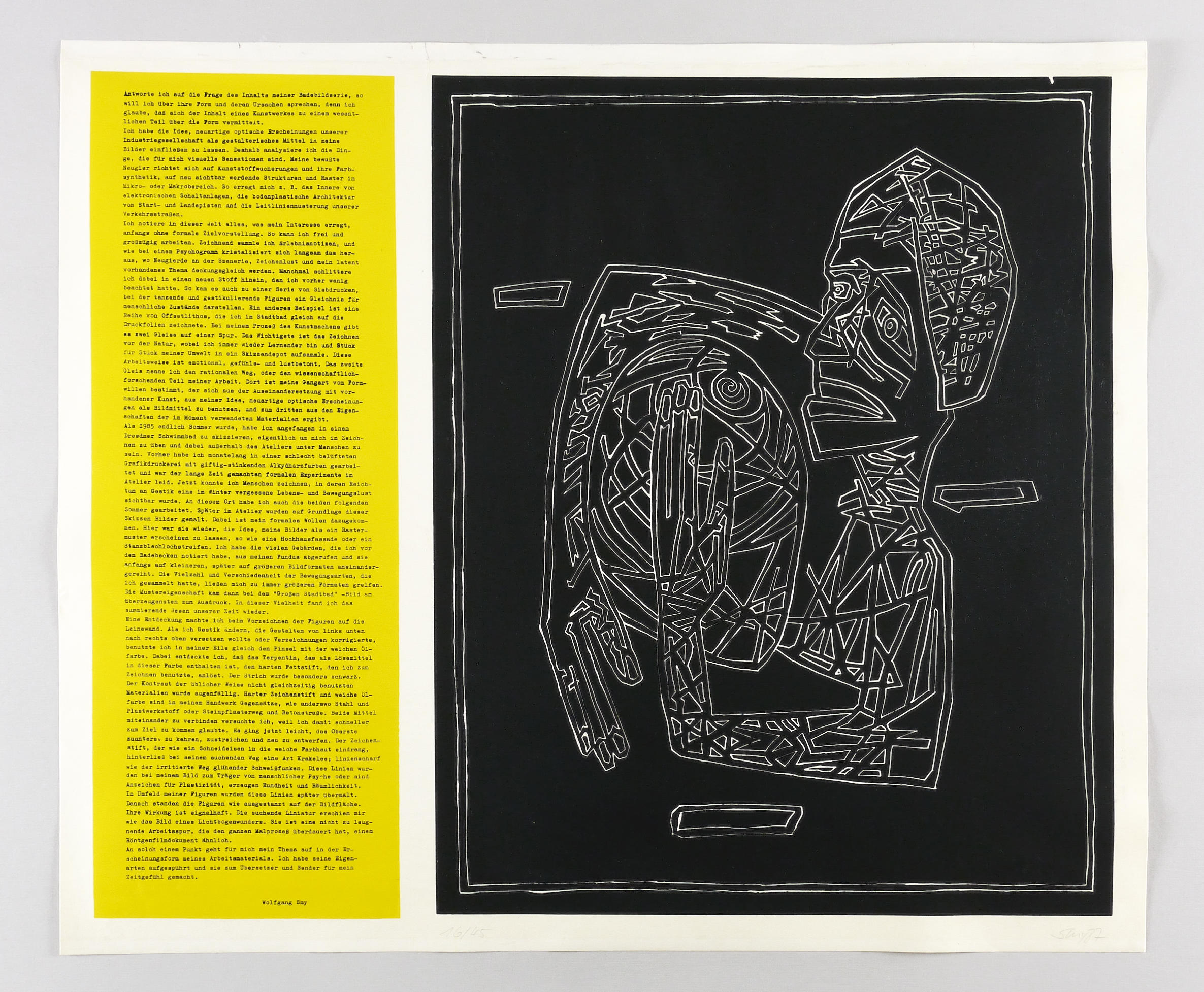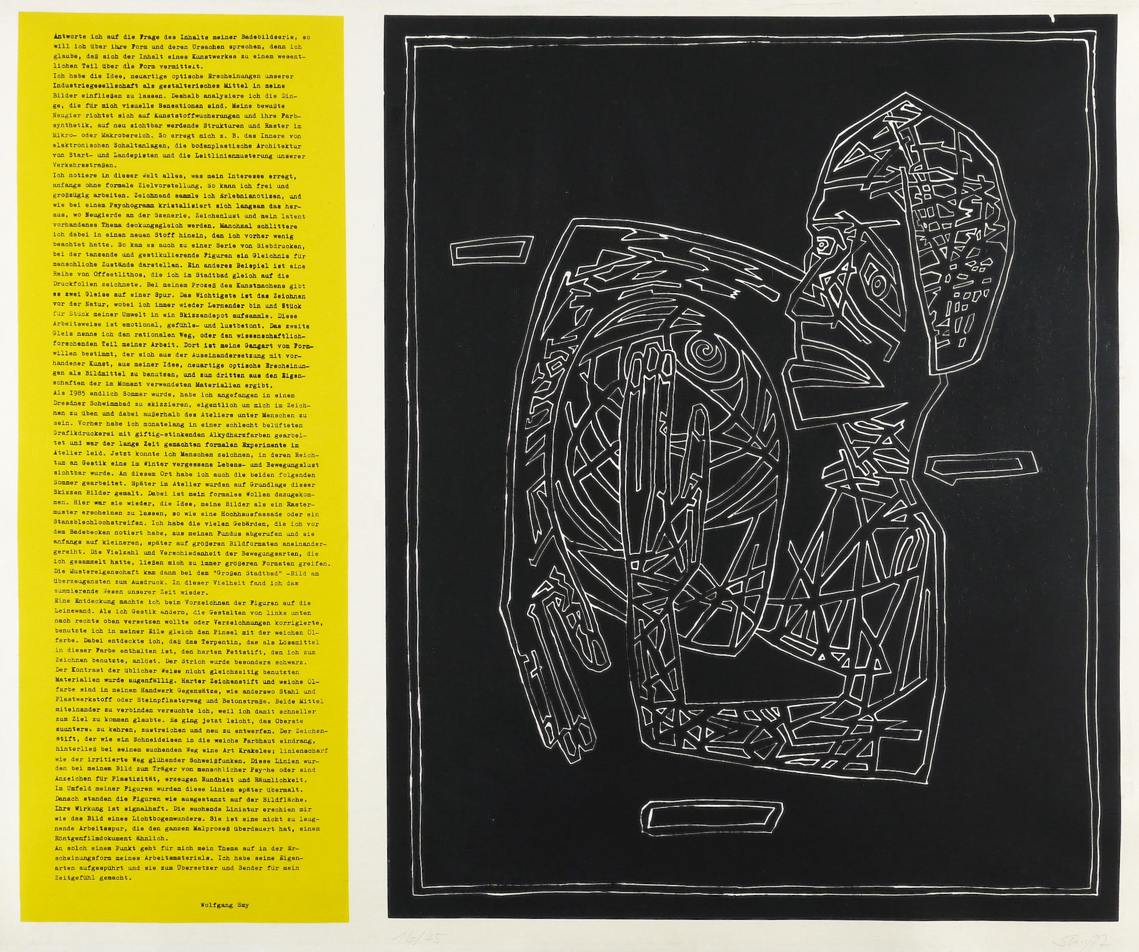 1987. Farbsiebdruck / Farbserigrafie, in Gelb & Schwarz, auf kräftigem hellchamois Karton. – Originale Künstlergrafik, von Wolfgang Smy. – Auflage Exemplar Nr. 16/45. – 62 x 74 cm (Blatt), 56,8 x 46,2 cm (Darstellung / Druckbild).