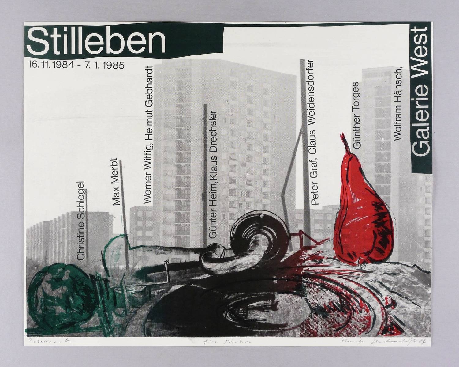 In Bleistift links unten von beiden Künstlern signiert und datiert: ″Haufe Weidensdorfer 84″. Widmung für den Drucker Michael Wackwitz. Diverse Inschriften. – Originalgrafisches Künstlerplakat zur Ausstellung ″Stilleben″ mit den Künstlern Christine Schlegel, Max Merbt, Werner Wittig Helmut Gebhardt, Günther Heim, Klaus Drechsler, Peter Graf, Claus Weidensdorfer, Günther Torges und Wolfram Hänsch in der Galerie West in Dresden 16.11.1984-7.1.1985. – Nicht bei Muschter. – Sehr guter Zustand.