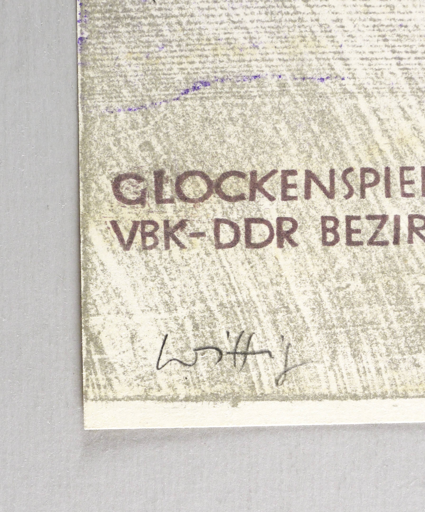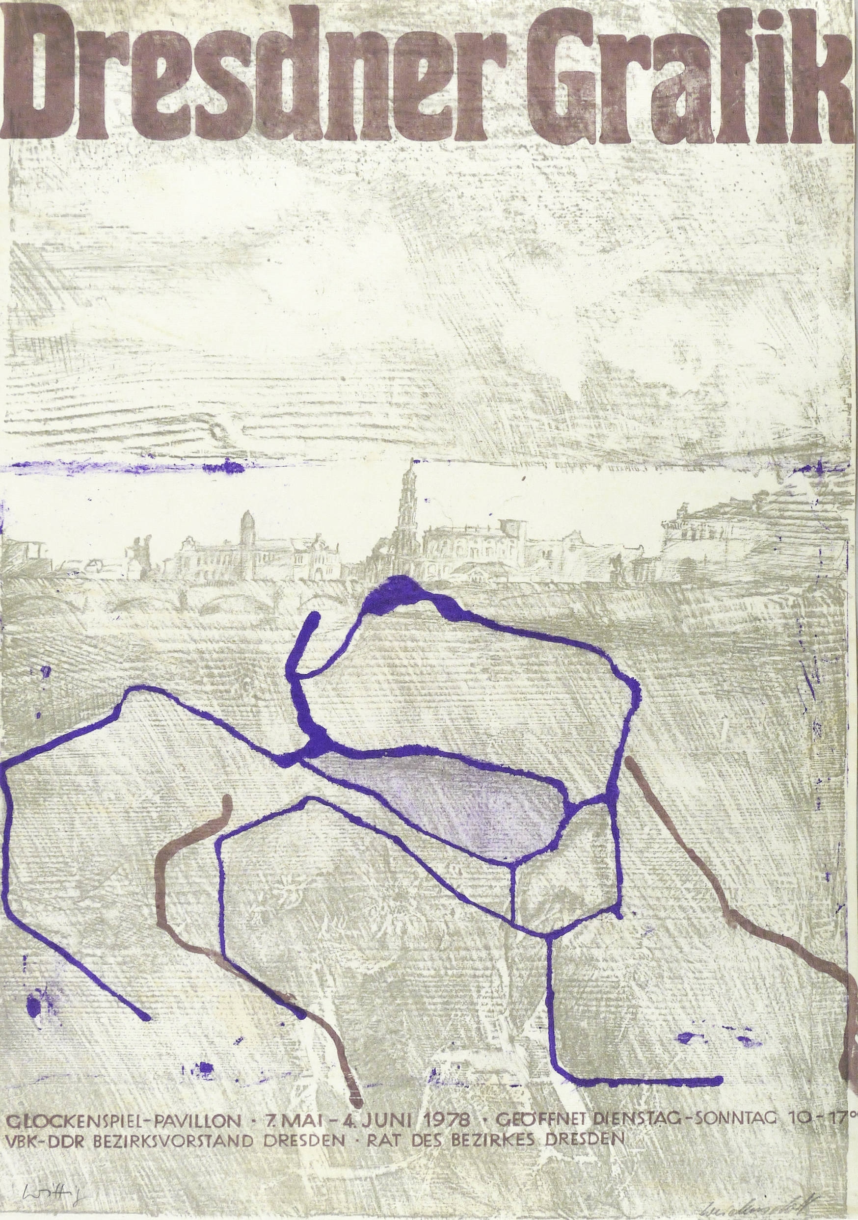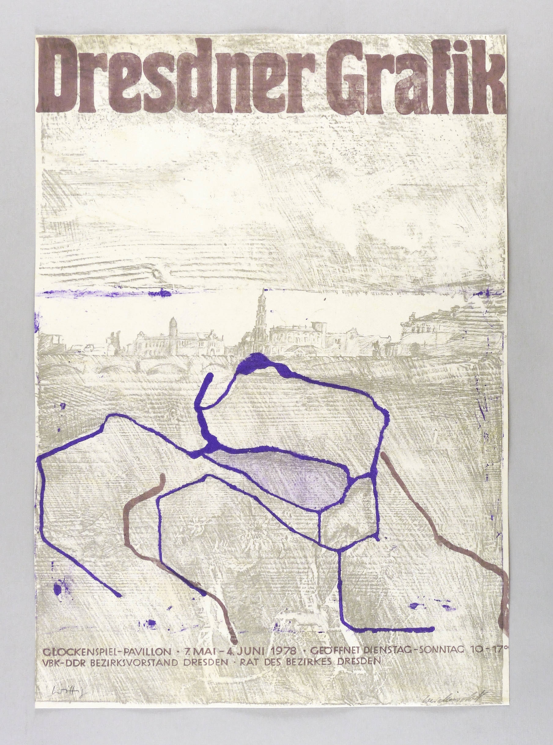 In Bleistift links unten signiert: ″Wittig″. Rechts signiert: ″Weidensdorfer″. Im Stein diverse Inschriften. – Originalgrafisches Künstlerplakat zur Ausstellung ″Dresdner Grafik″ im Glockenspiel-Pavillon in Dresden 7.5.-4.6.1978. – Nicht bei Muschter. – Sehr guter Zustand.