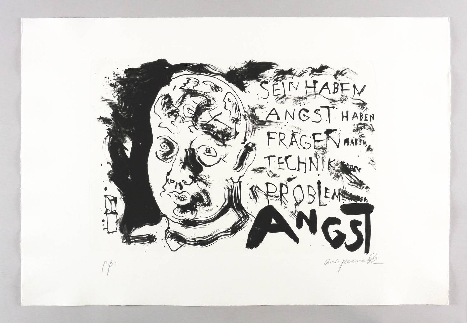 Rechts unten in Bleistift signiert: ″ar. penck″. Links Auflagenbezeichnung: ″p.p.″. Wasserzeichen der Hahnemühle. – Belegexemplar zu einer Auflage von 15 Exemplaren. – Druck von Frank Walter in der Lithografischen Werkstatt der Hochschule für Bildende Künste Dresden (HfbK). – Ohne Mängel. Tadellos. Sehr guter Zustand.