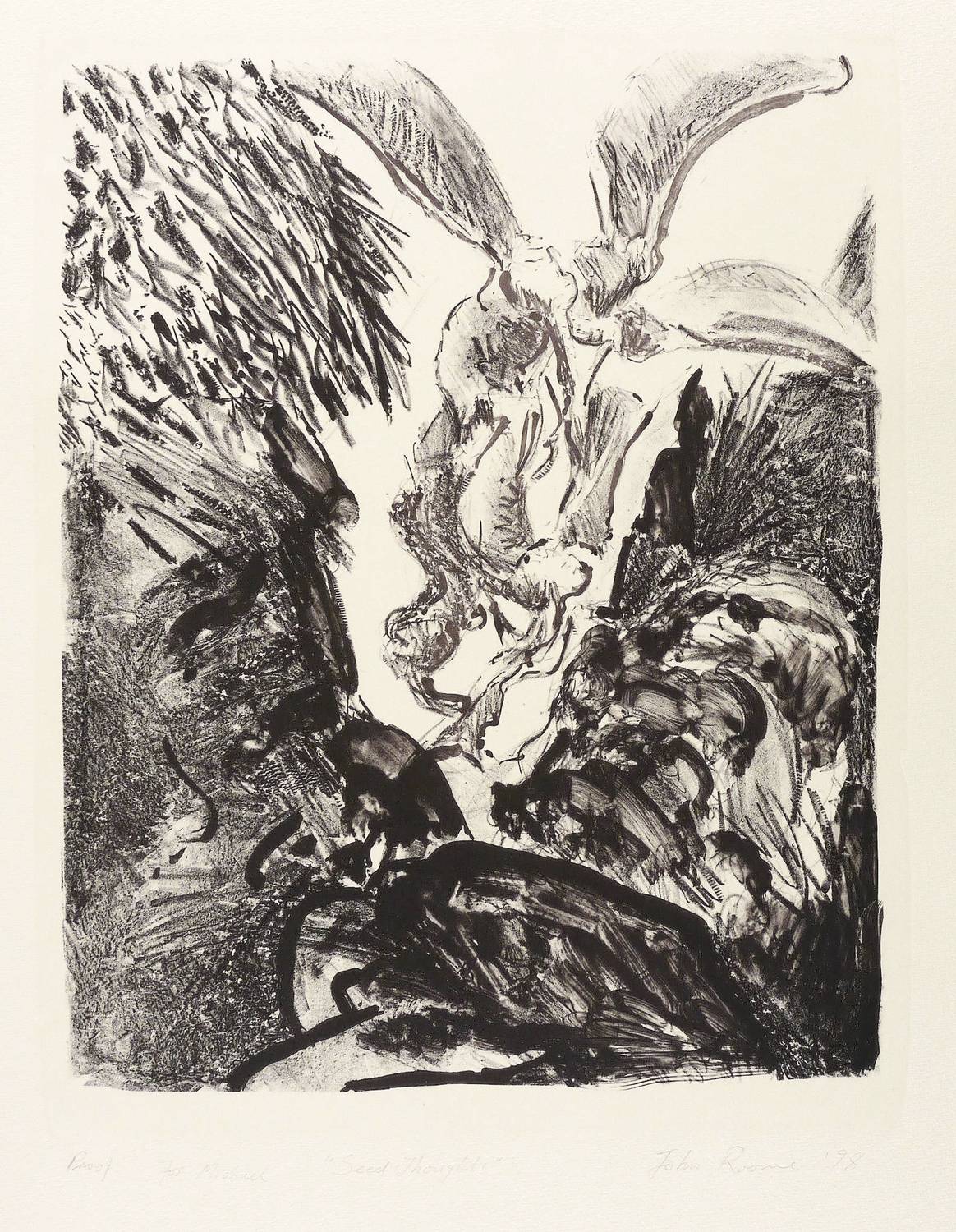 Rechts unten in Bleistift signiert und datiert: ″John Roome ’98″. Links eigenhändige Auflagenbezeichnung: ″Proof″. Mittig Titel: ″Seed Thoughts″. Trockenstempel des Steindruckers Michael Wackwitz. Wasserzeichen der Hahnemühle. – Sehr gutes Exemplar.