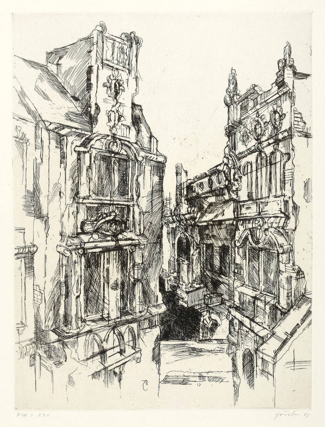 1985. Radierung / Strichätzung, in Schwarz, mit Plattenton, auf hellgelbem Karton. – Originale Künstlergrafik, von Wieland Förster. – Auflage Exemplar Nr. XVII/XXV. – 31,9 x 24,0 cm (Darstellung / Platte), 36 x 36 cm (Blatt).