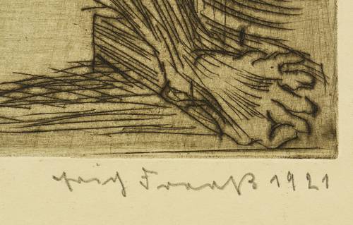 1921. Radierung / Kaltnadel, mit Plattenton, geschliffen, in Schwarzbraun, auf gelbem Velin. – Originale Künstlergrafik, von Erich Fraaß. – Probedruck Nr. 1. – 26,8 x 26,8 cm (Darstellung / Platte), 44 x 32 cm (Blatt).