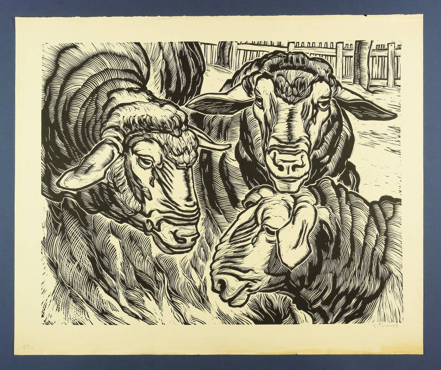 Um 1935. Linolschnitt, in Schwarz, auf hellgelbem Velin. – Originale Künstlergrafik, von Erich Fraaß. – 49,0 x 63,0 cm (Darstellung / Druckstock), 59 x 71 cm (Blatt).
