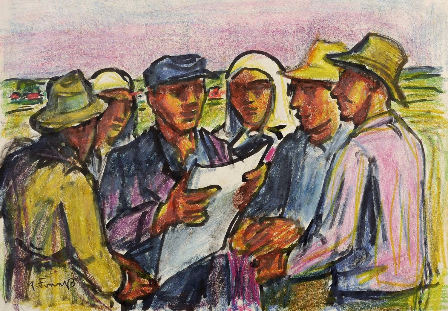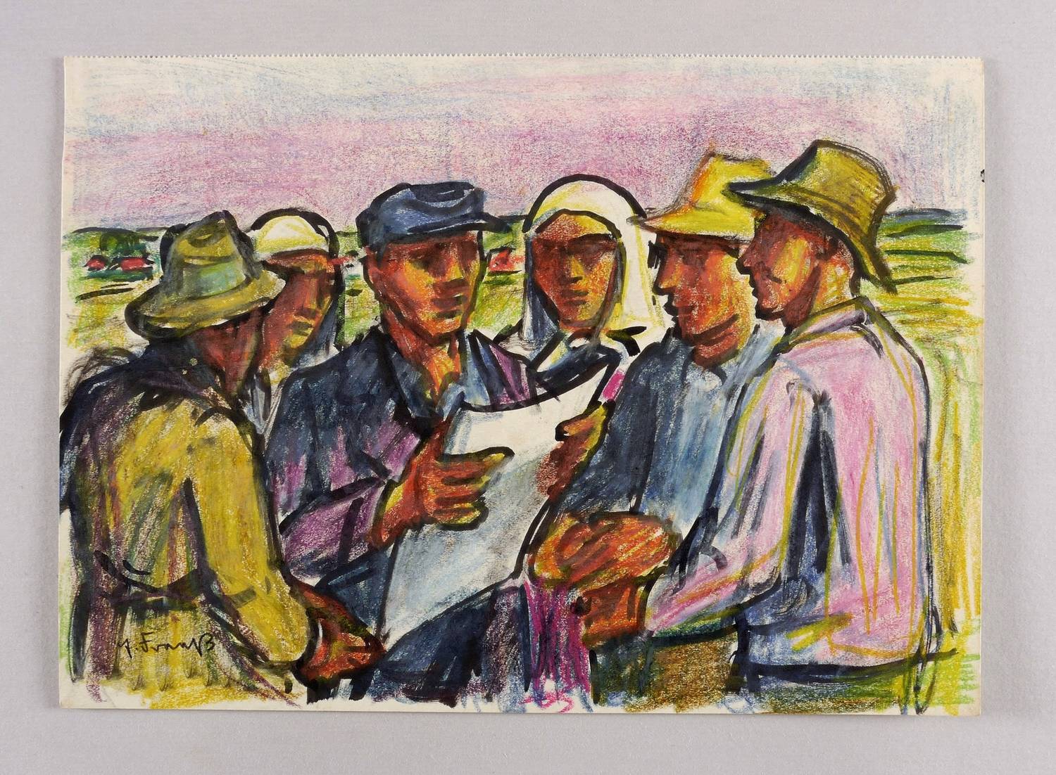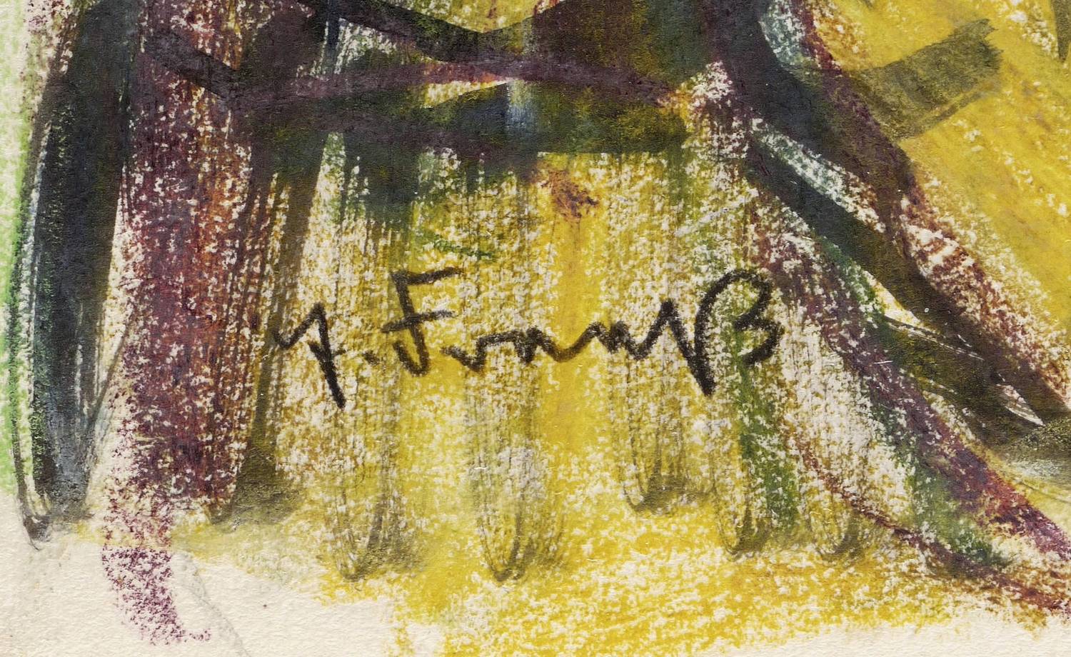 Um 1950. Zeichnung / Tusche & Farbkreide, auf hellchamois Velin. – Originale Künstlergrafik, von Erich Fraaß. – Unikat. – 22,3 x 31,2 cm (Darstellung / Blatt).