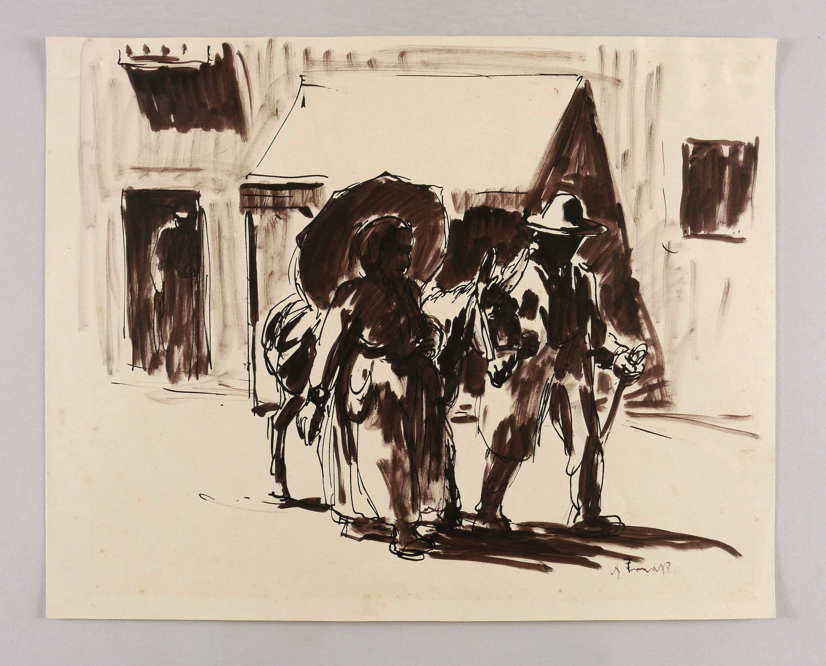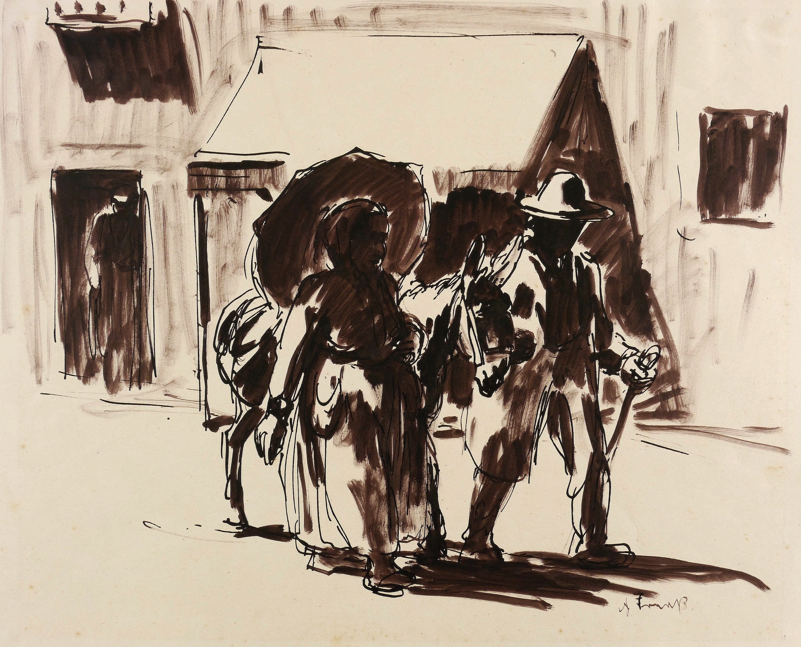 Rechts unten in brauner Feder signiert: ″E. Fraaß″. Verso in Bleistift von fremder Hand bezeichnet: ″Weg zum Markt // Spanien 1925″. – Papier leicht gebräunt und fleckig. Mäßig guter Zustand.