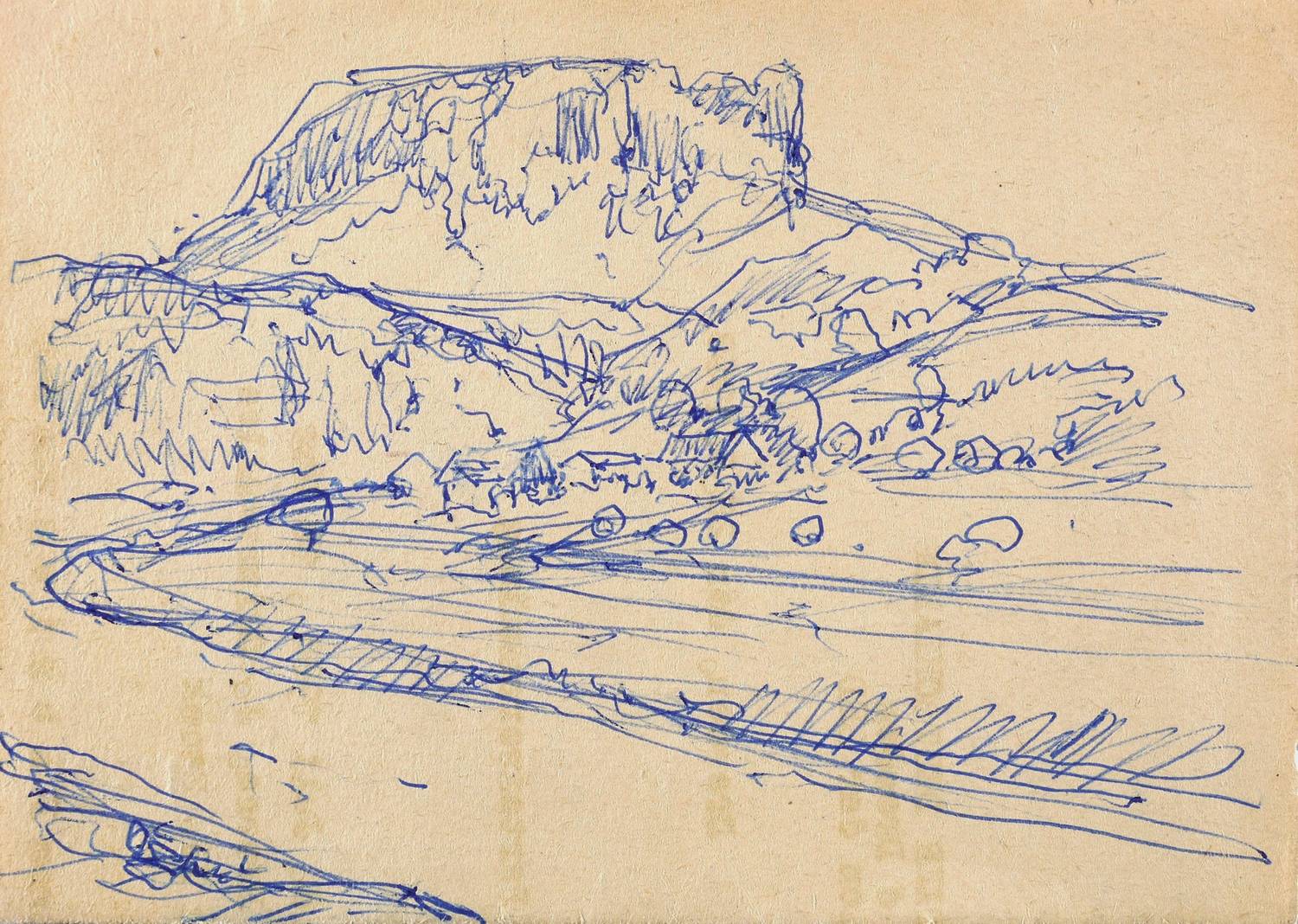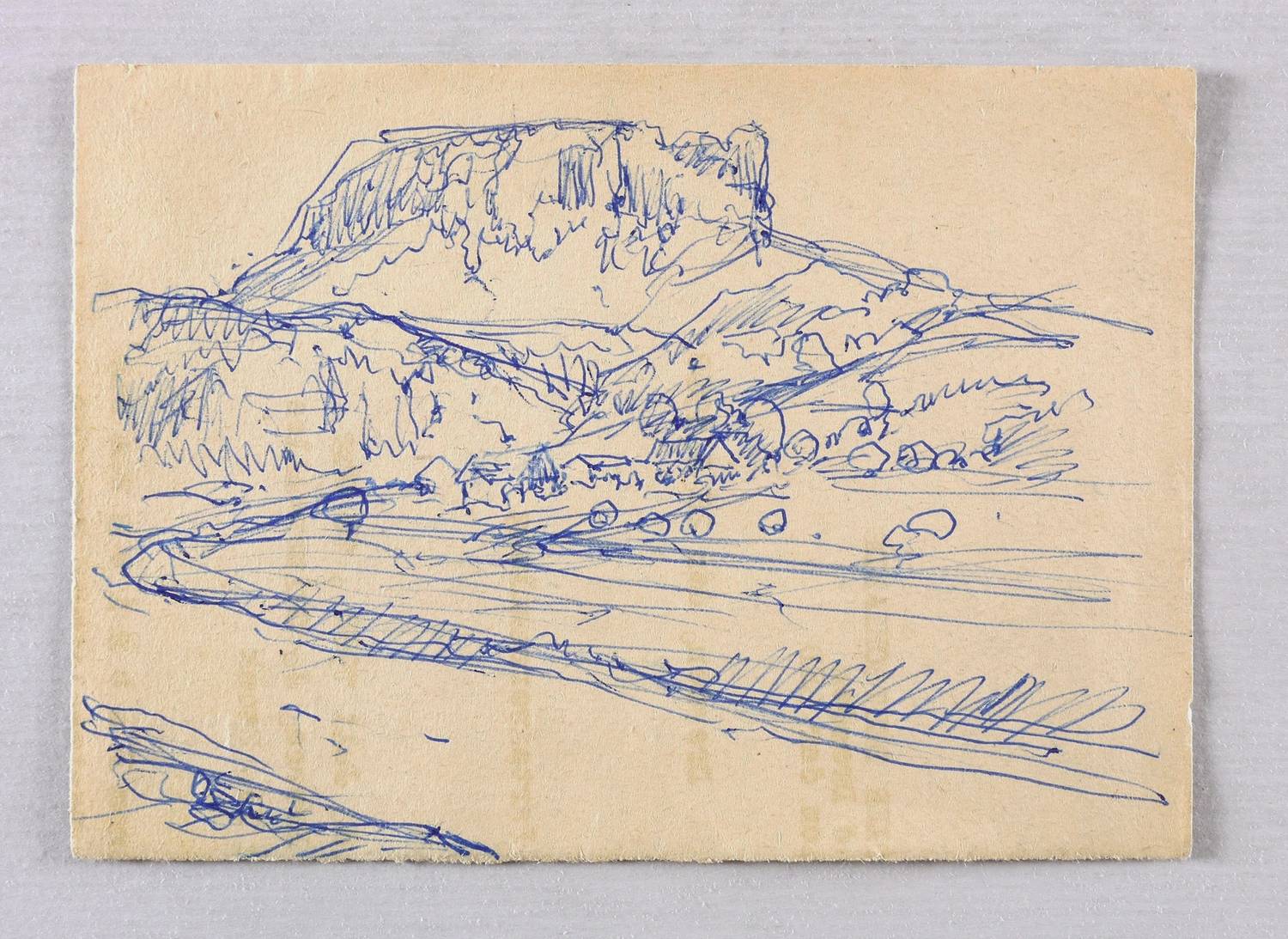 1968-1974. Zeichnung / Kugelschreiber, in Blau, auf gelbem Velin. – Originale Künstlergrafik, von Erich Fraaß. – Unikat. – 10,7 x 14,9 cm (Darstellung / Blatt).