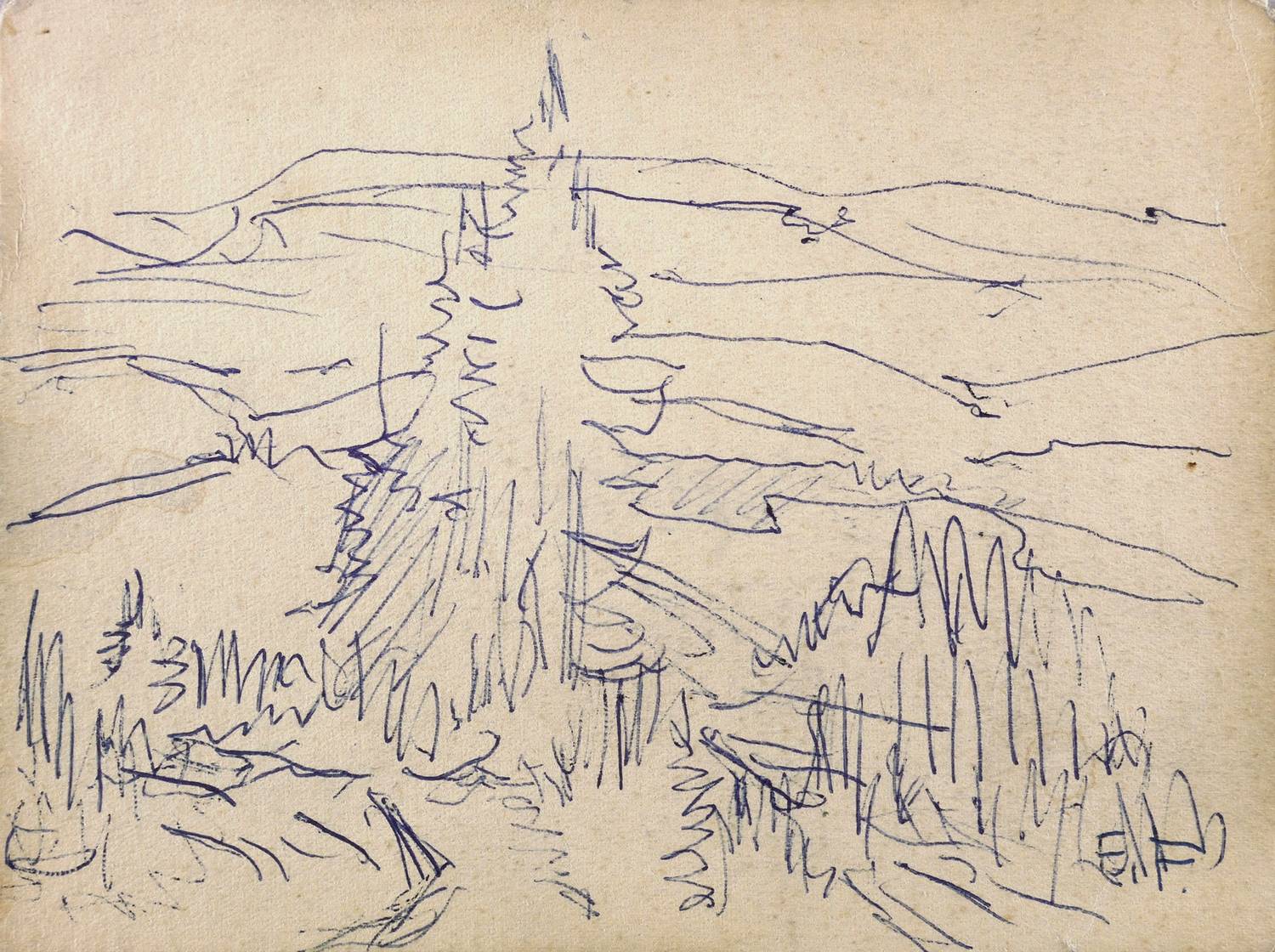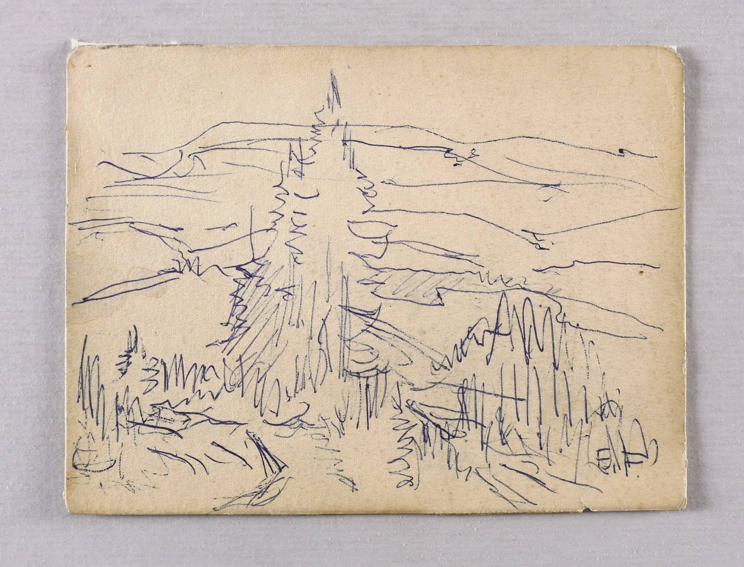 Rechts unten in Kugelschreiber signiert: ″E.F.″ Verso weiter bezeichnet: ″Sächs. Schweiz, Blick z. Hohen Schneeberg″. – Papier oberflächlich etwas berieben und gegilbt. Guter Zustand.