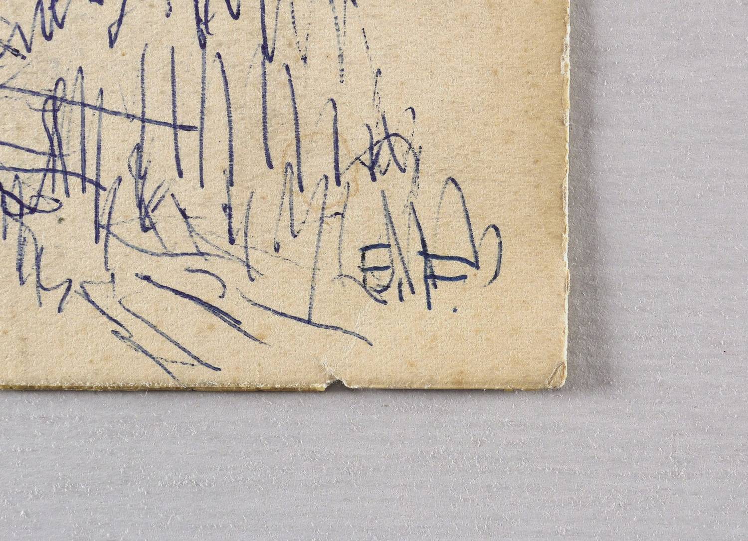 1960-1970. Zeichnung / Kugelschreiber, in Blau, auf gelbem Velinkarton. – Originale Künstlergrafik, von Erich Fraaß. – Unikat. – 12,0 x 16,0 cm (Darstellung / Blatt).