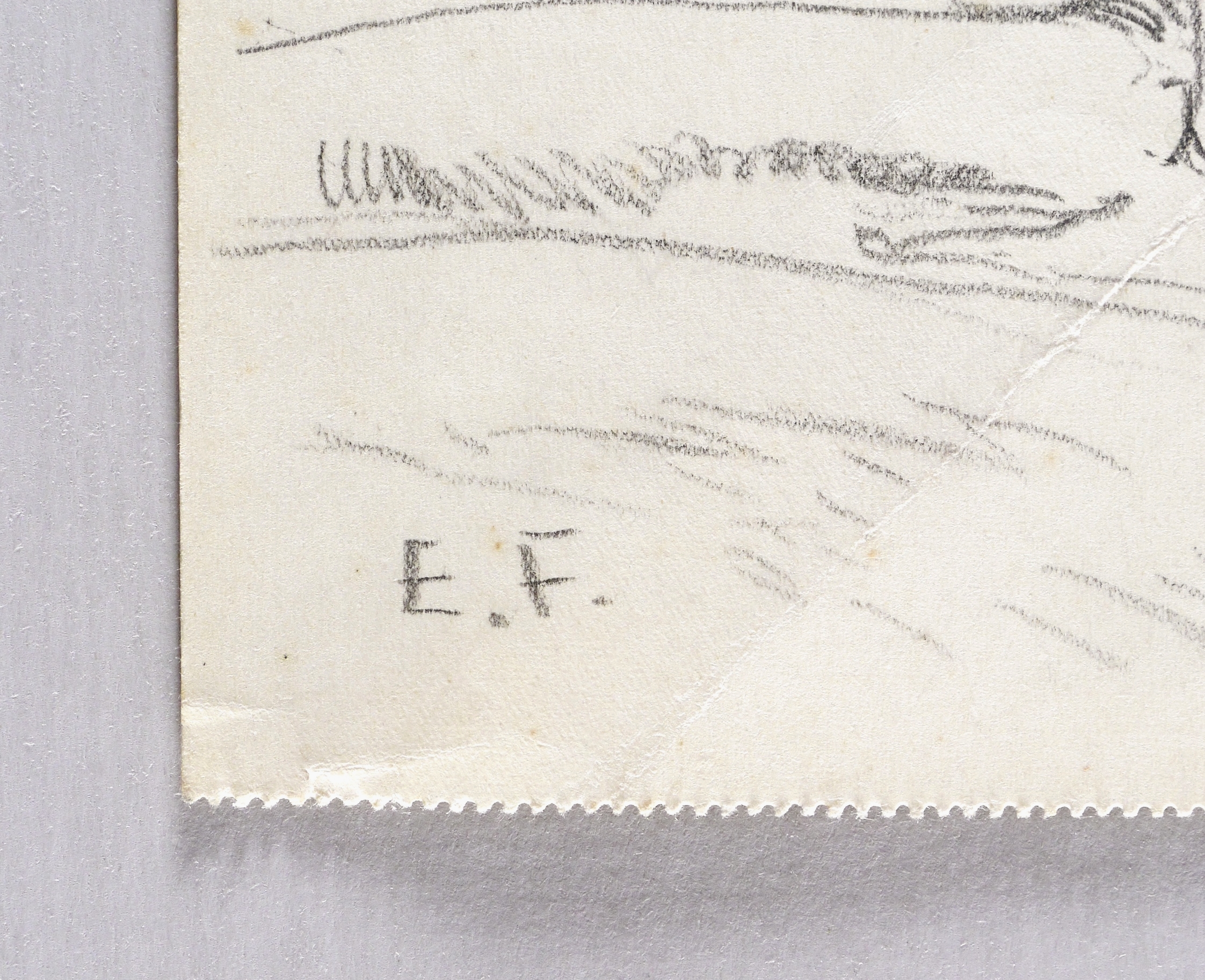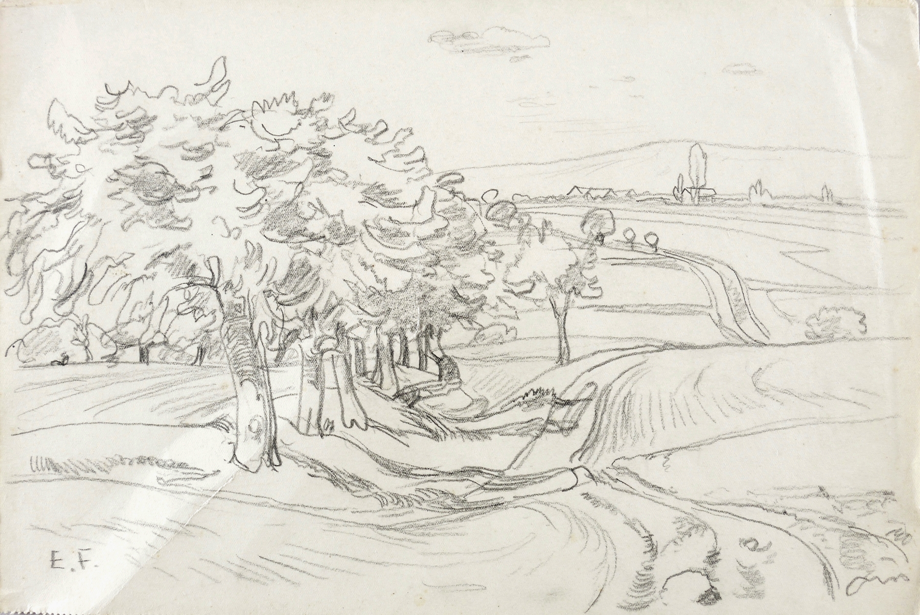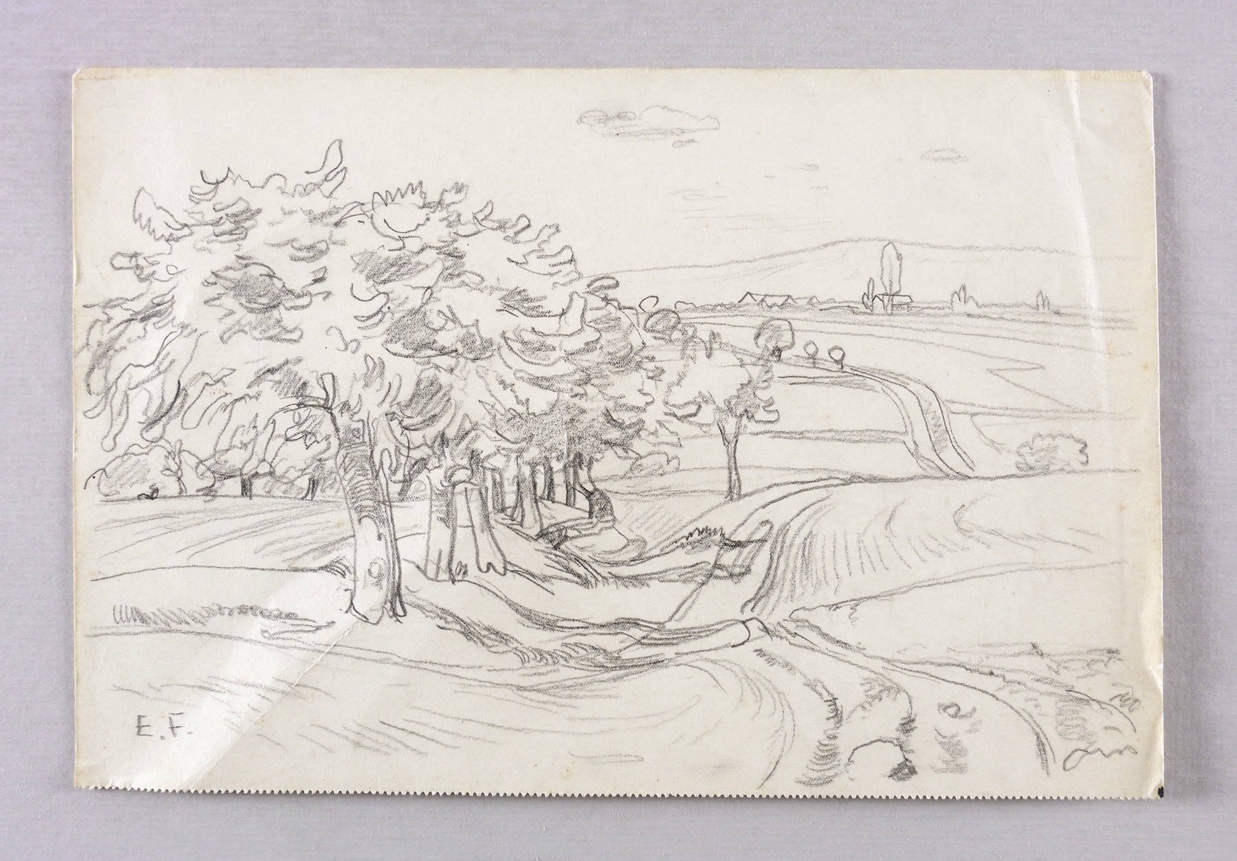 Links unten in Bleistift signiert: ″E.F.″ Verso in Bleistift bezeichnet: ″Blick von den Nöthnitzer Feldern nach Gostritz″. – Papier mit Knickspuren. Mäßig guter Zustand.